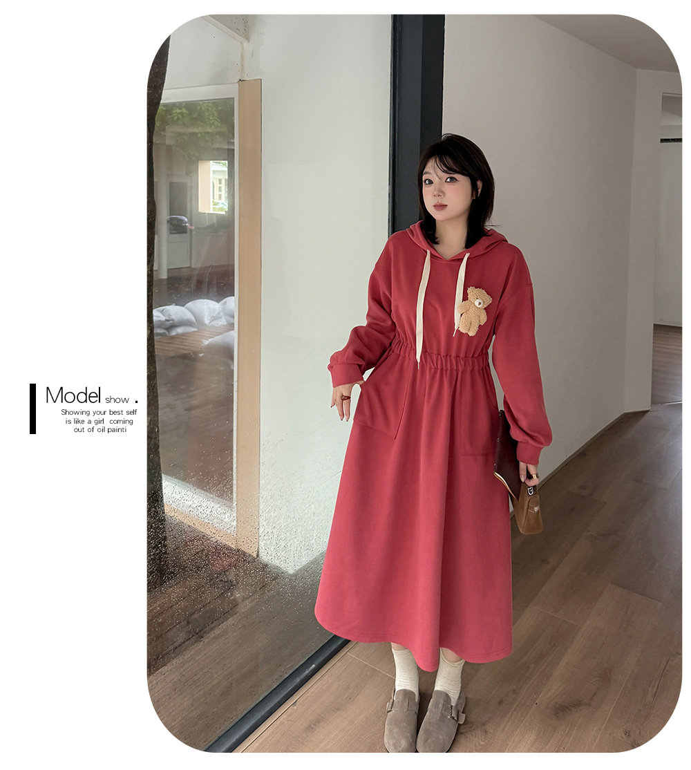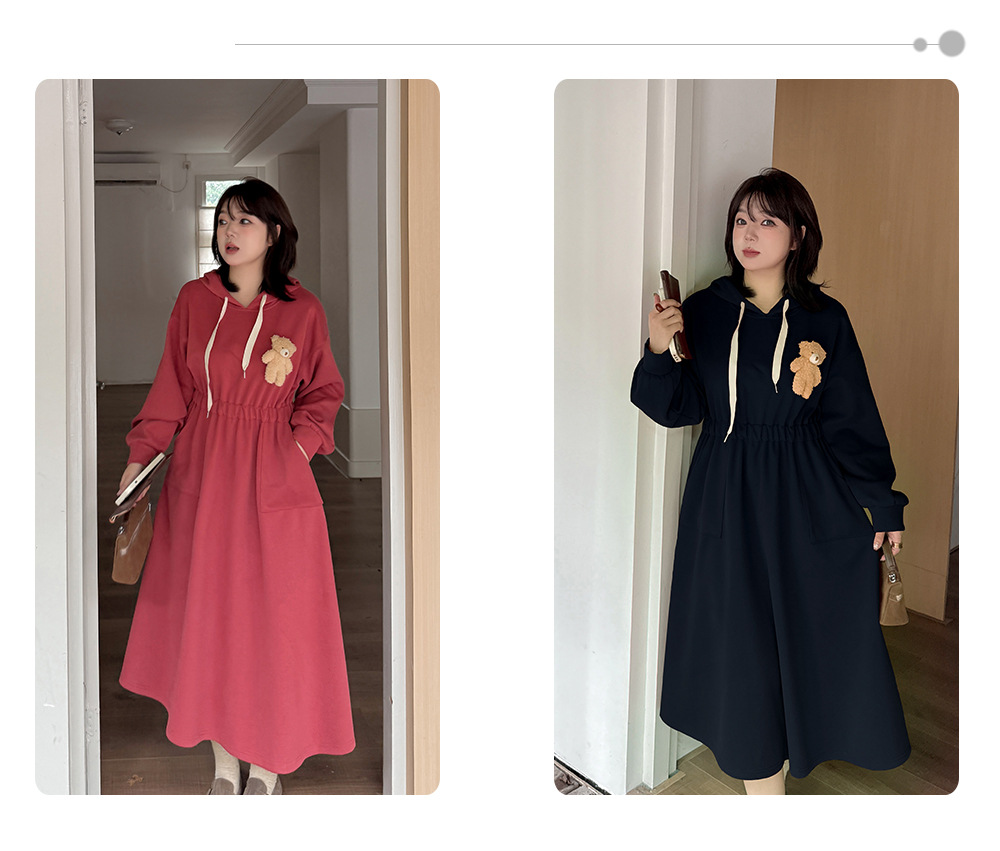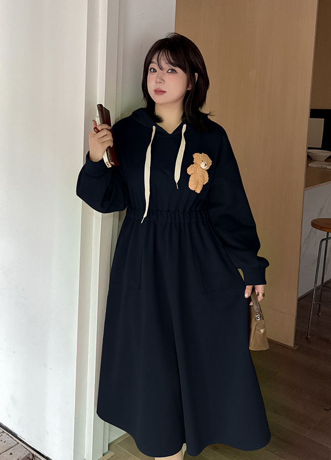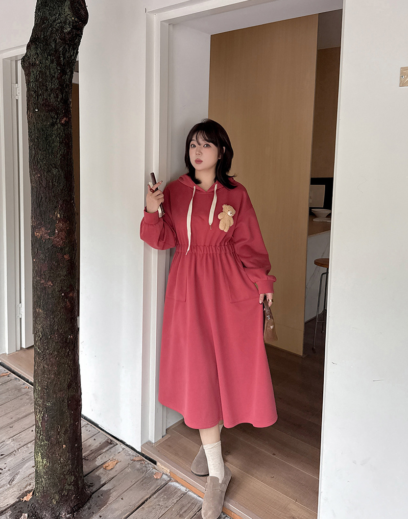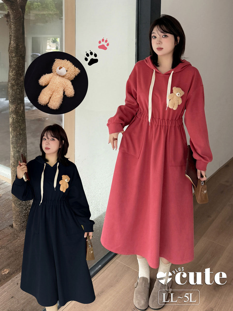 大きいサイズ レディース フード付きベアーマスコット厚手スウェットワンピース LL 3L 4L 5L