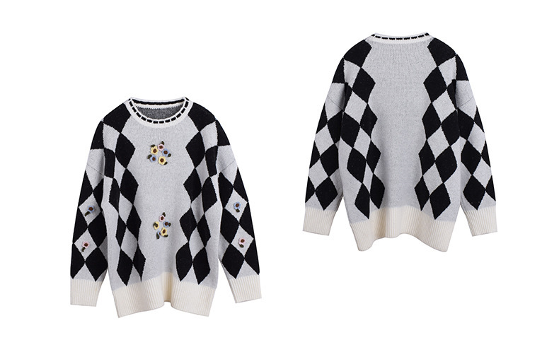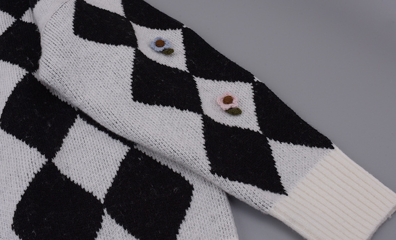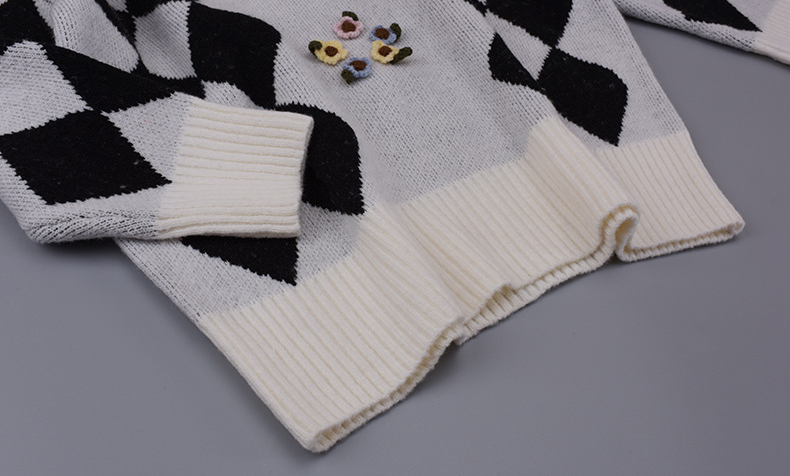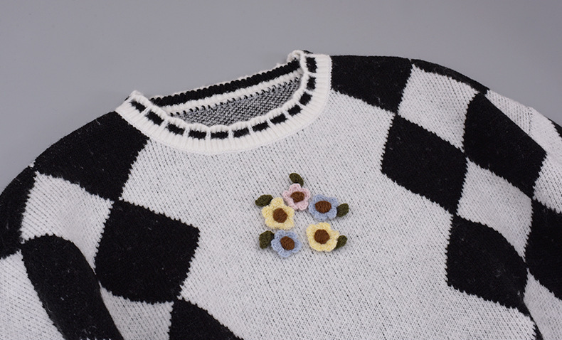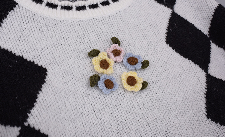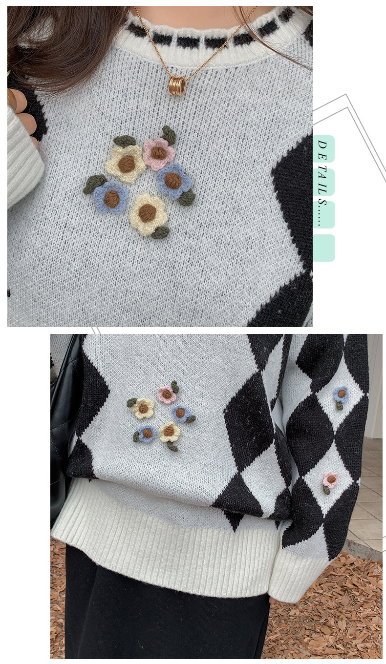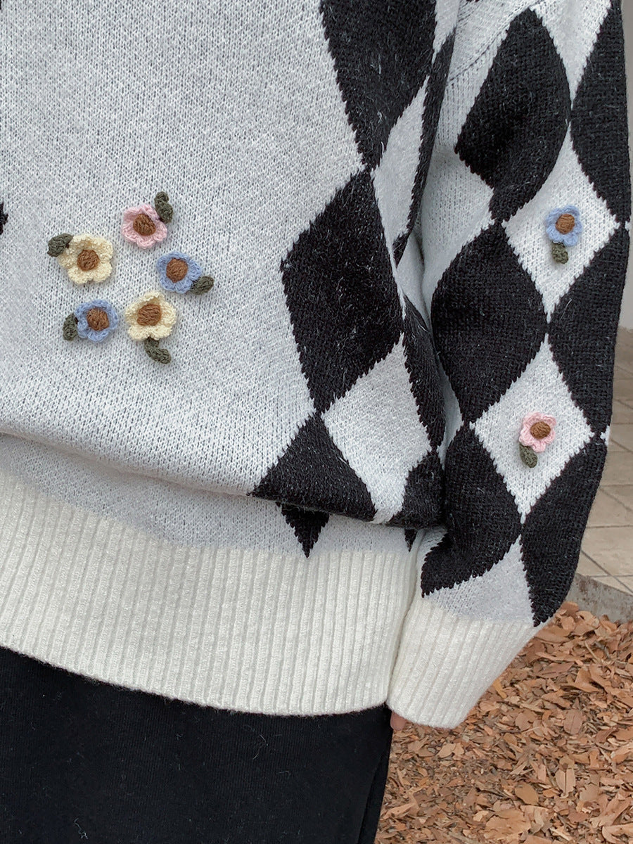 起毛糸とアクリル素材を使用し、厚手で柔らかなプルオーバーセーターです。小さめのラウンドネックに大きなダイヤ柄を施し、フロントと袖には、立体的で可愛らしい小さなかぎ針編みの花をあしらっています。ゆったりとしたドロップショルダーのデザインです。袖口と裾には黒、白、グレーのダイヤ柄を編み込み、レトロで優しい雰囲気を醸し出しています。
