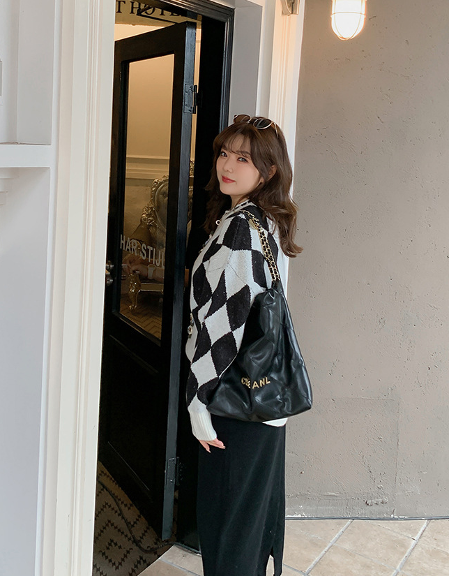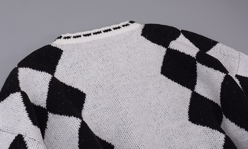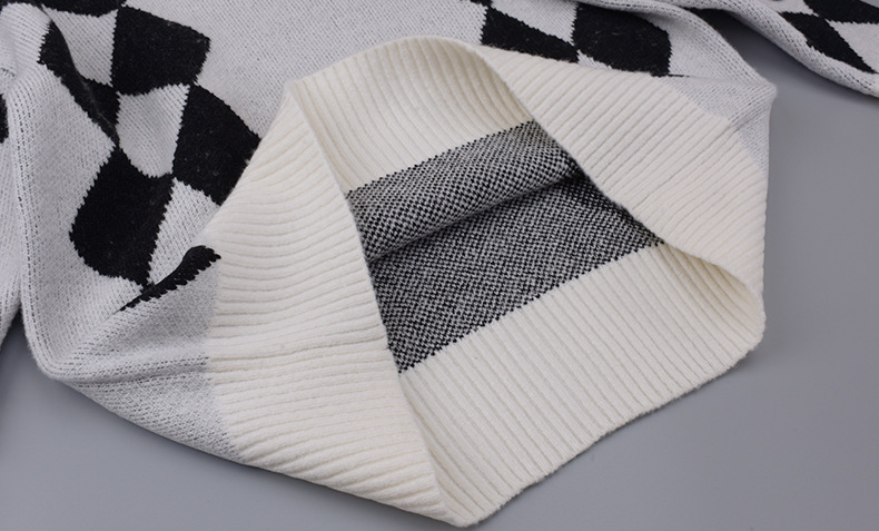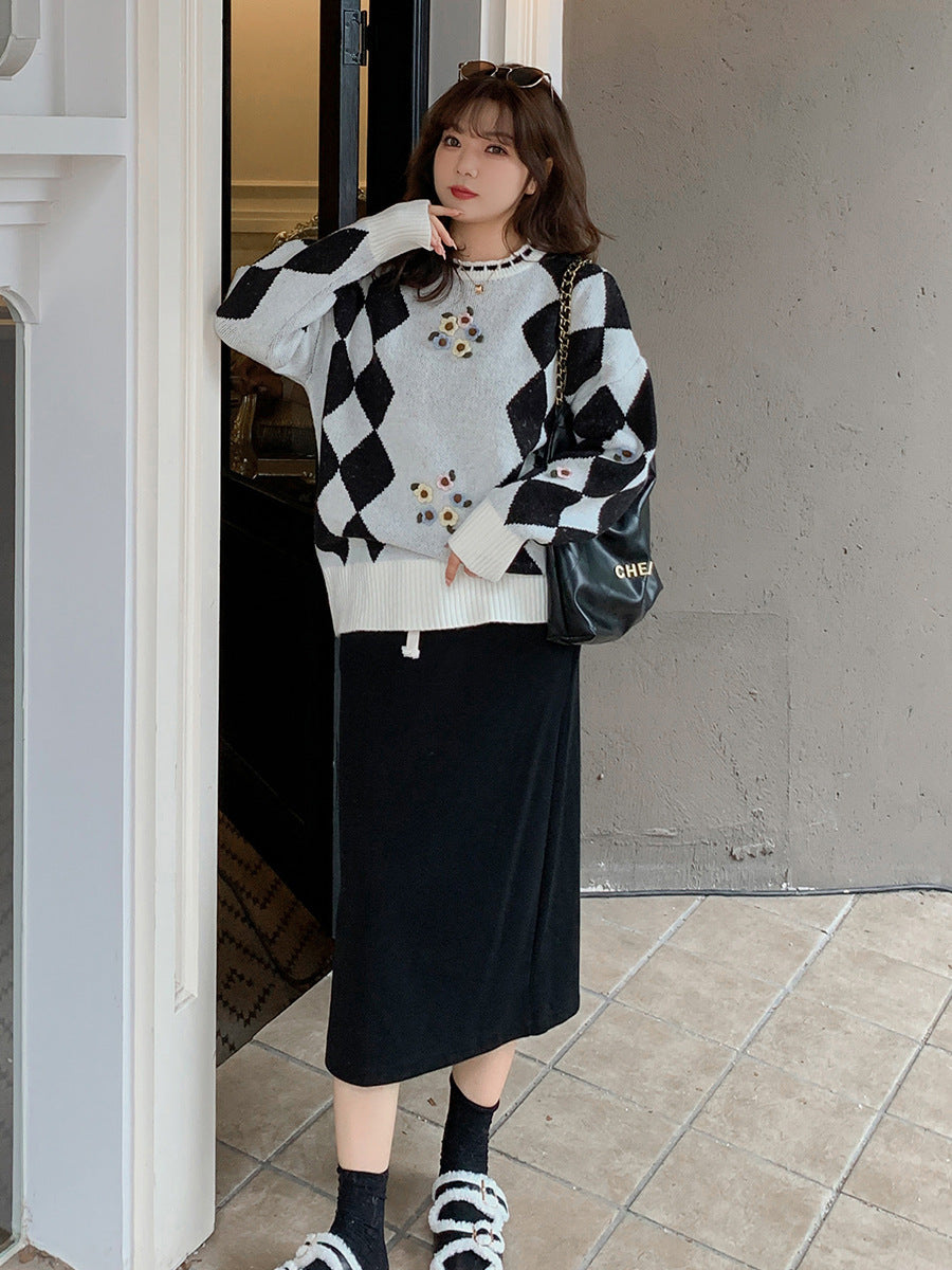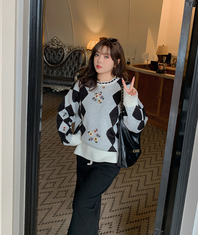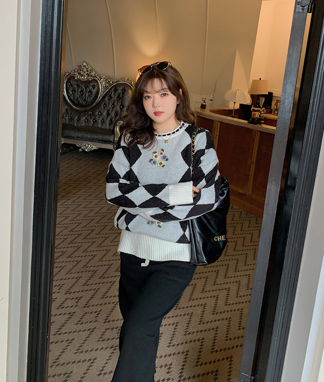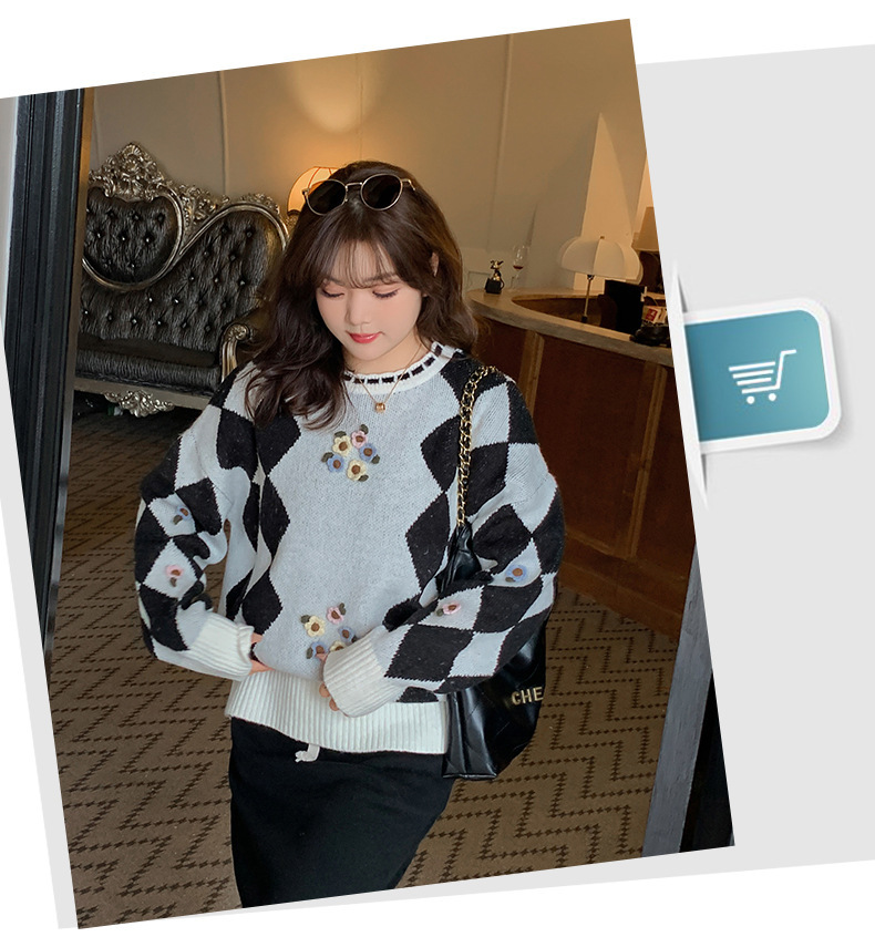 起毛糸とアクリル素材を使用し、厚手で柔らかなプルオーバーセーターです。小さめのラウンドネックに大きなダイヤ柄を施し、フロントと袖には、立体的で可愛らしい小さなかぎ針編みの花をあしらっています。ゆったりとしたドロップショルダーのデザインです。袖口と裾には黒、白、グレーのダイヤ柄を編み込み、レトロで優しい雰囲気を醸し出しています。