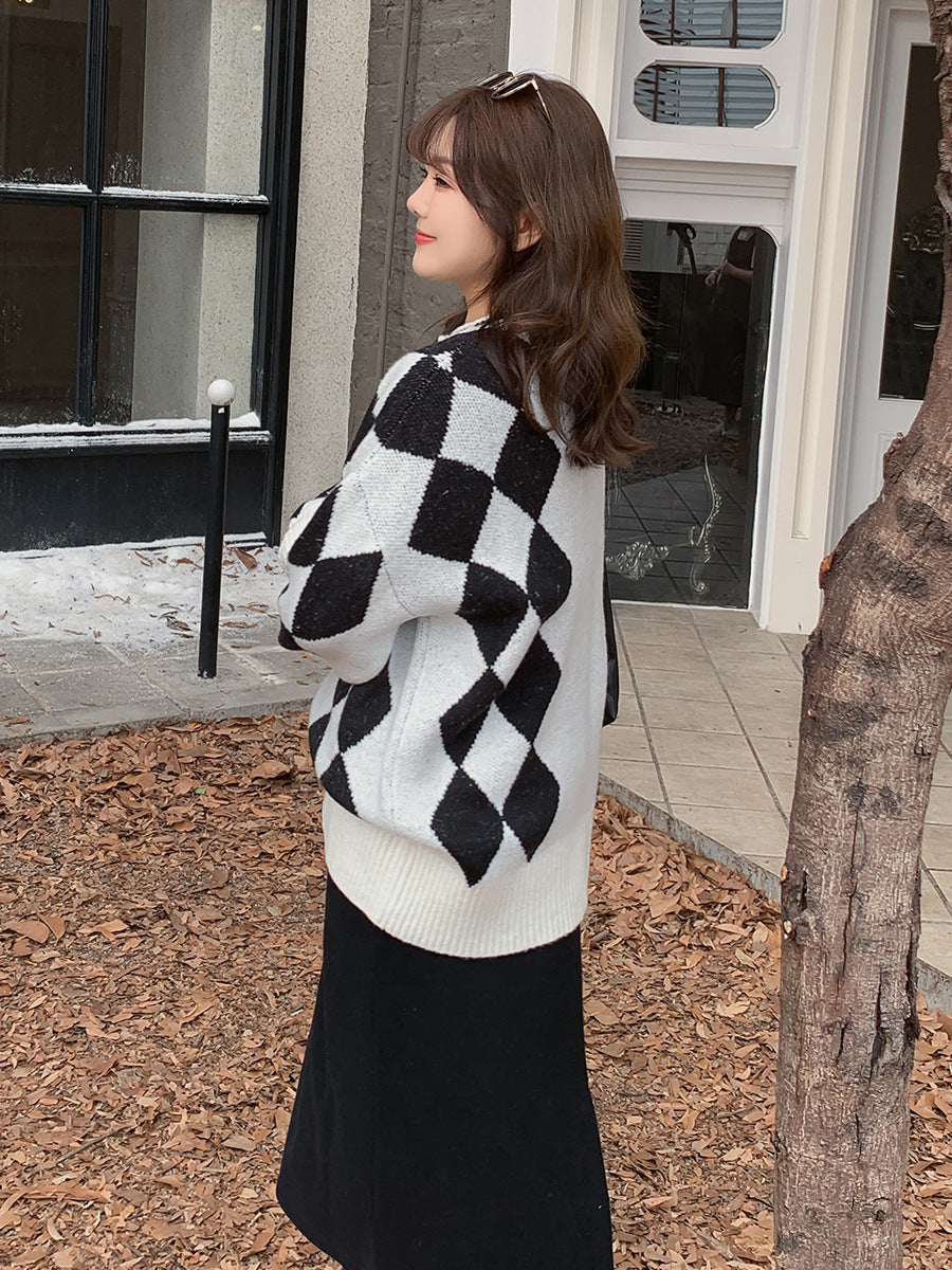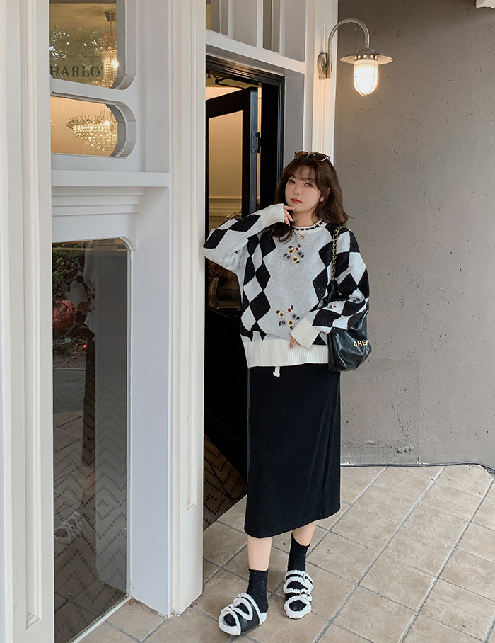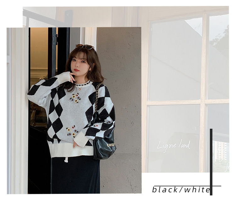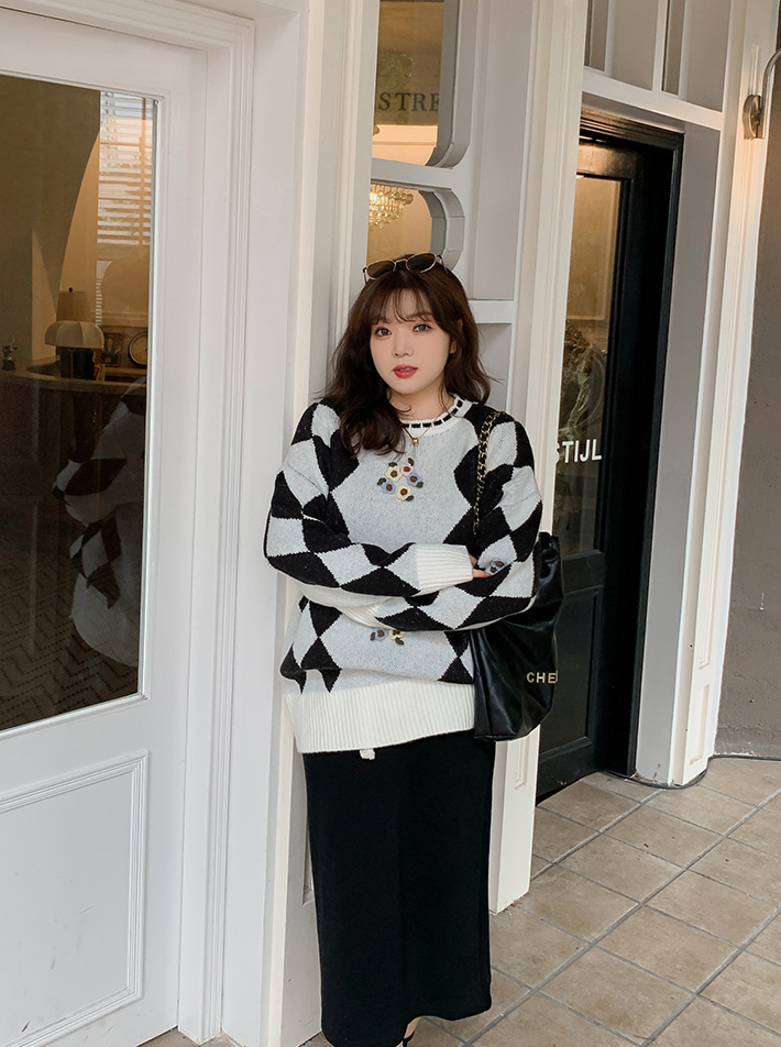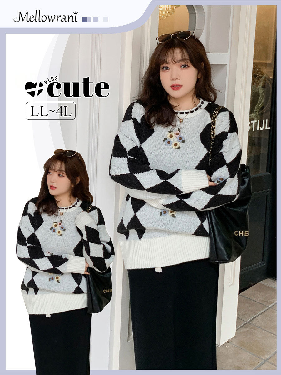 大きいサイズ レディース ラウンドネックレトロ小花ダイヤ柄プルオーバーセーター LL 3L 4L