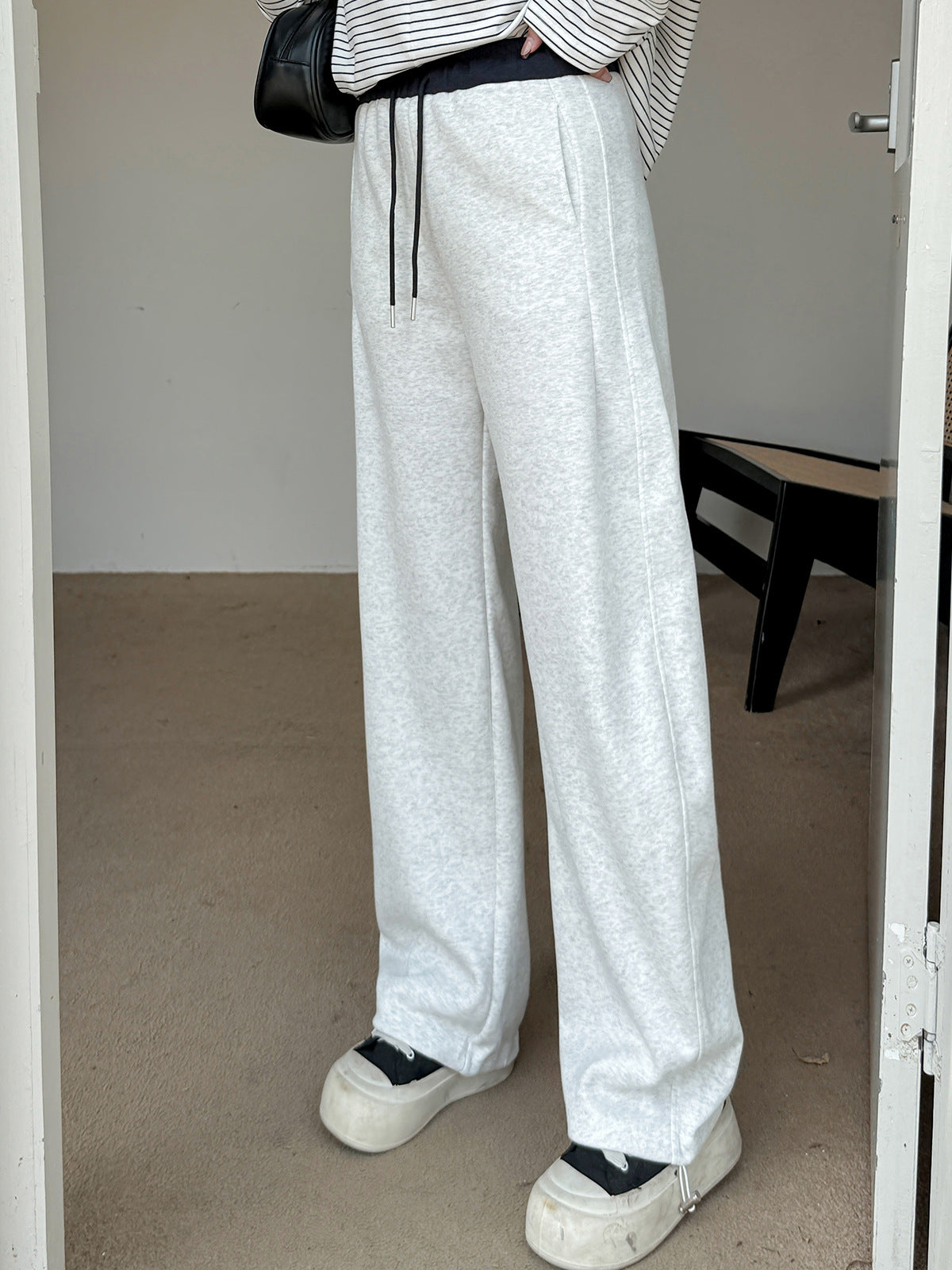 ニットストレートカジュアルパンツは、柔らかく快適なニット複合生地で作られ、厚くてボリュームがあり暖かい履き心地です。ウエスト部分は黒い生地のコントラスのある配色で、メリハリのあるデザインです。フロント、右後ろにポケット、裾に周囲を調節できる伸縮性のあるドローストリングが付いています。脚のラインを美しくカバーしながら、着心地も良く、どんなスタイルにも合わせやすいカジュアルパンツです。