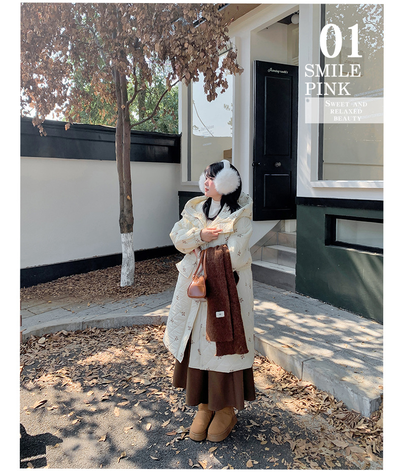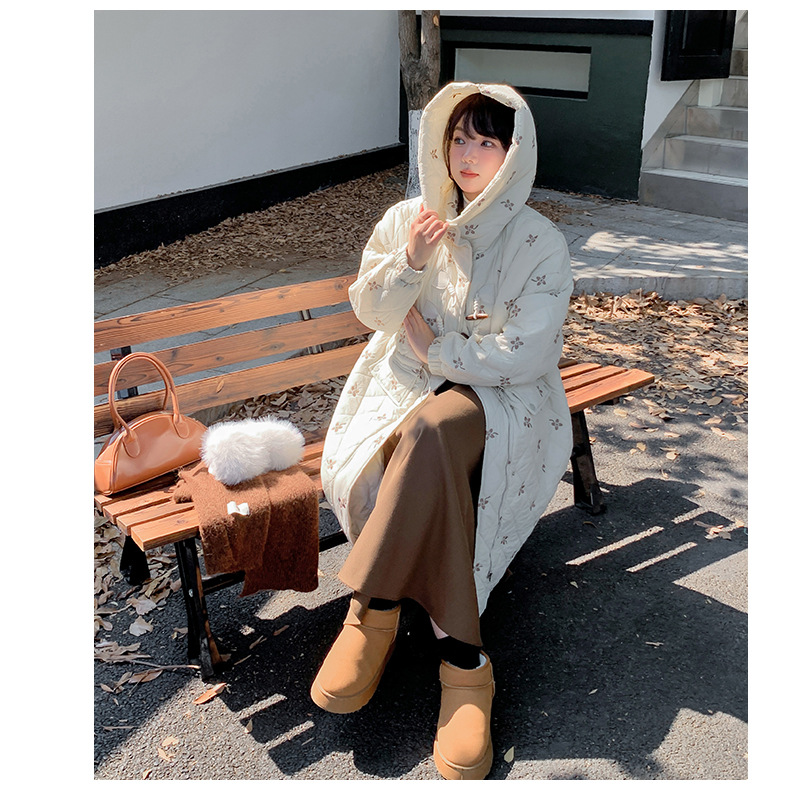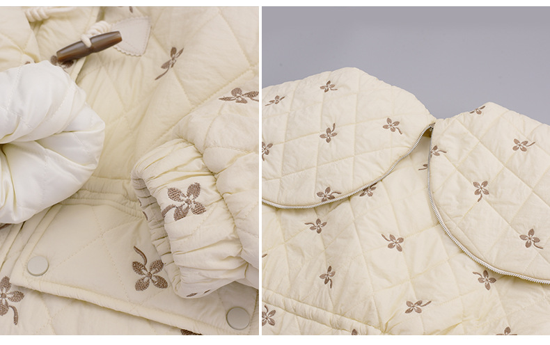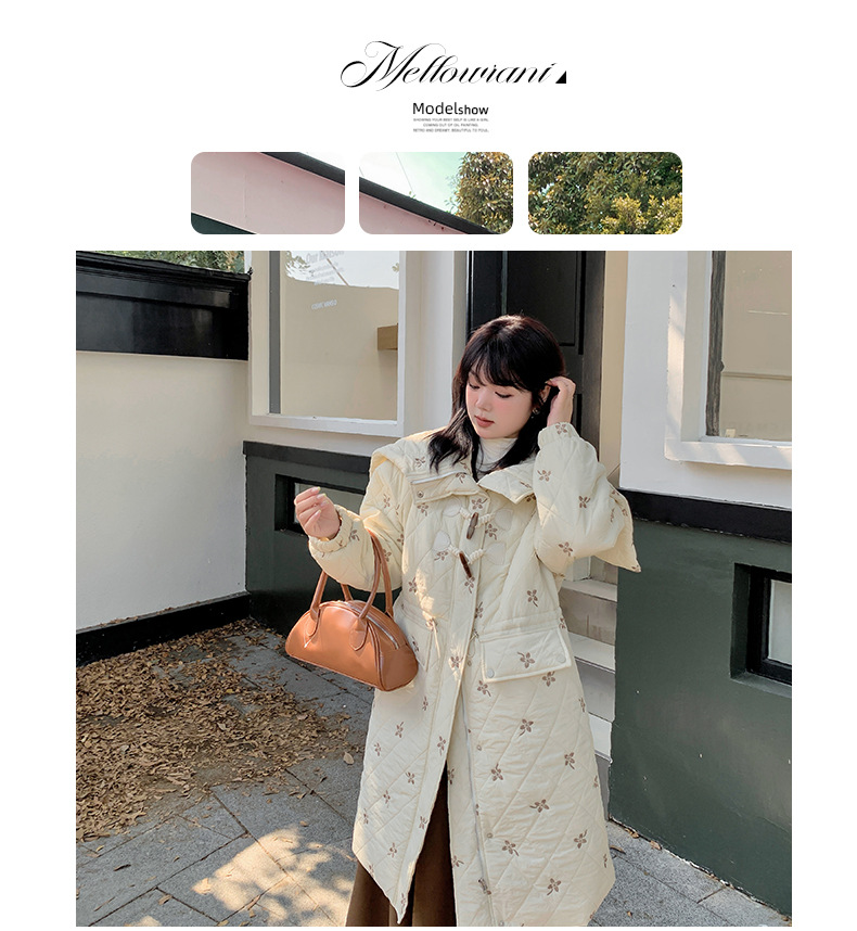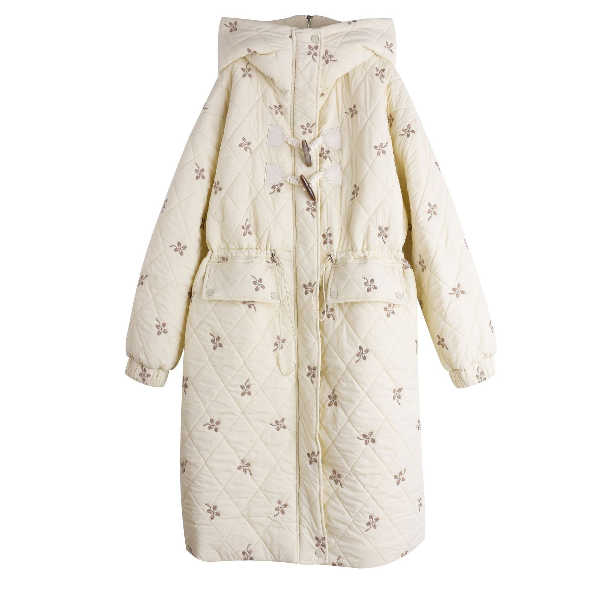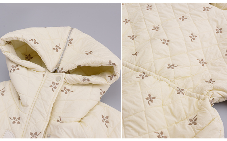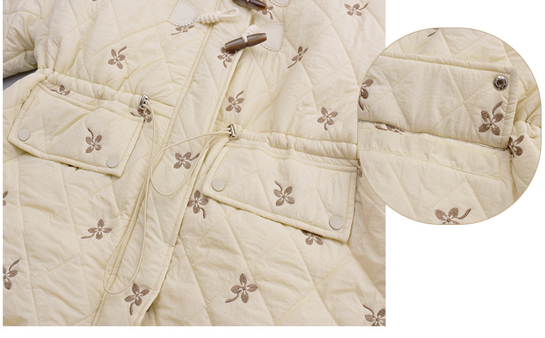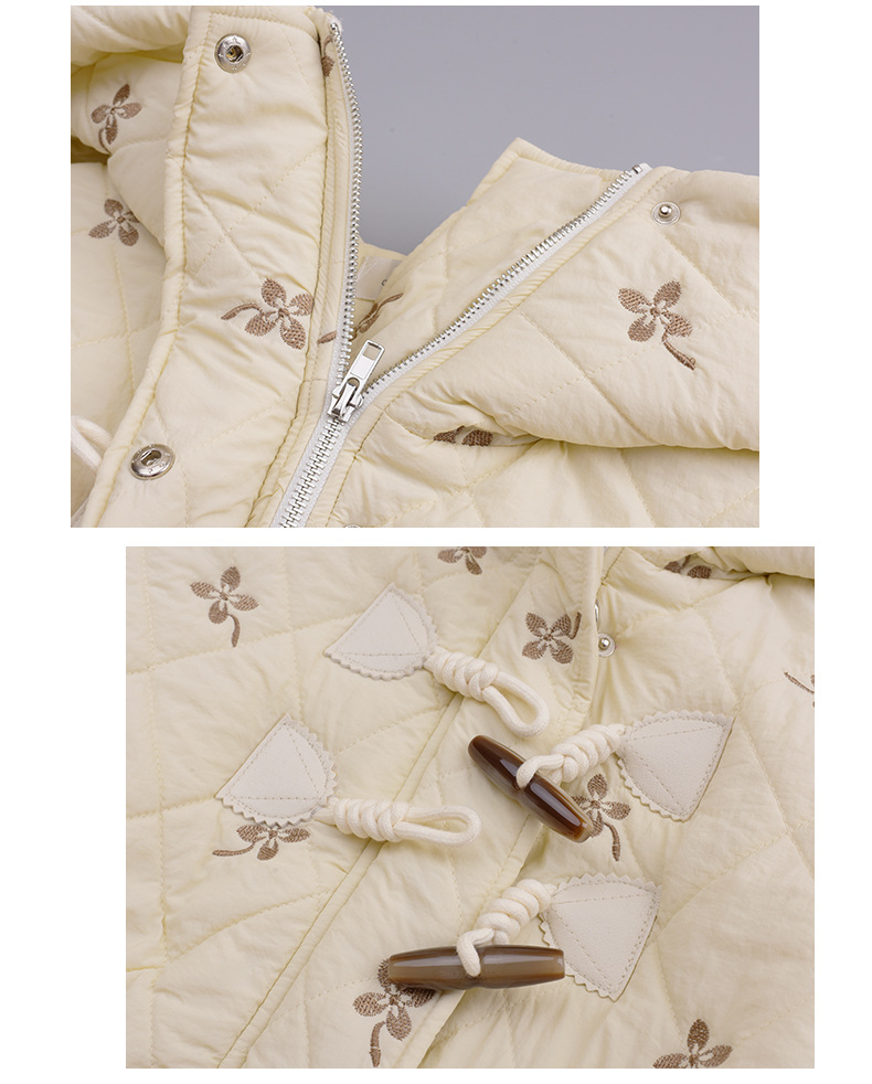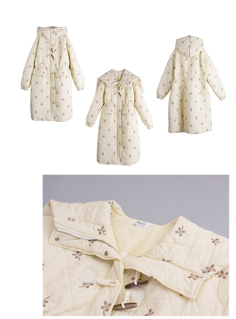 裏地にキルティングを施した厚手な中綿ジャケットです。フードとしても、フードのファスナーを開けて大きめのラペルとしても使えます。フロントにはファスナーと大きなトグルボタンが2つ付いています。ウエストはゴムで調整できるためスタイルを自由に切り替えられます。肩袖はゆったりしており、袖口はゴムになっていて暖かい着心地です。全体に刺繍が施された女性らしいデザインで、温かみのある上品な色合いでエレガントなジャケットコートを是非お試しください。