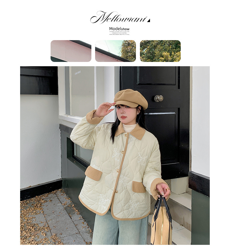 柔らかくて軽い、通勤やレジャーに適したキルティングジャケットは、生地は表面にキルティングとオシャレな刺繍が施されており、ライトブラウンのコーデュロイ生地をつなぎ合わせたデザインです。フロントのボタンを外して着ることができ、スリップポケットが2つ付いており、袖口をロールアップしてコーデュロイを見せるさりげないオシャレが魅力的です。暖かくて柔らかい快適で着心地のいいアウターを是非お試しください。