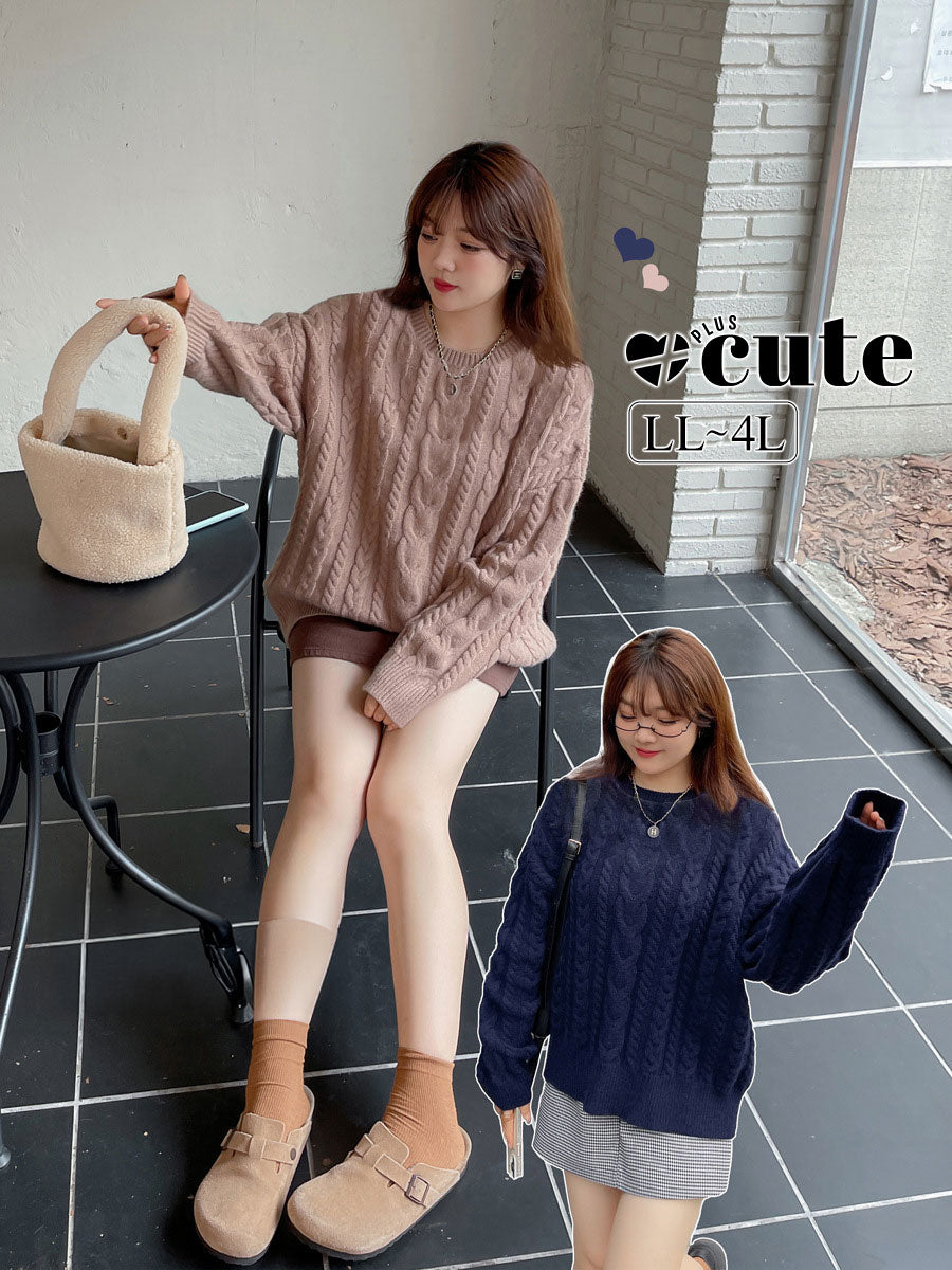 大きいサイズ レディース ラウンドネックケーブル編みカレッジスタイルセーター LL 3L 4L
