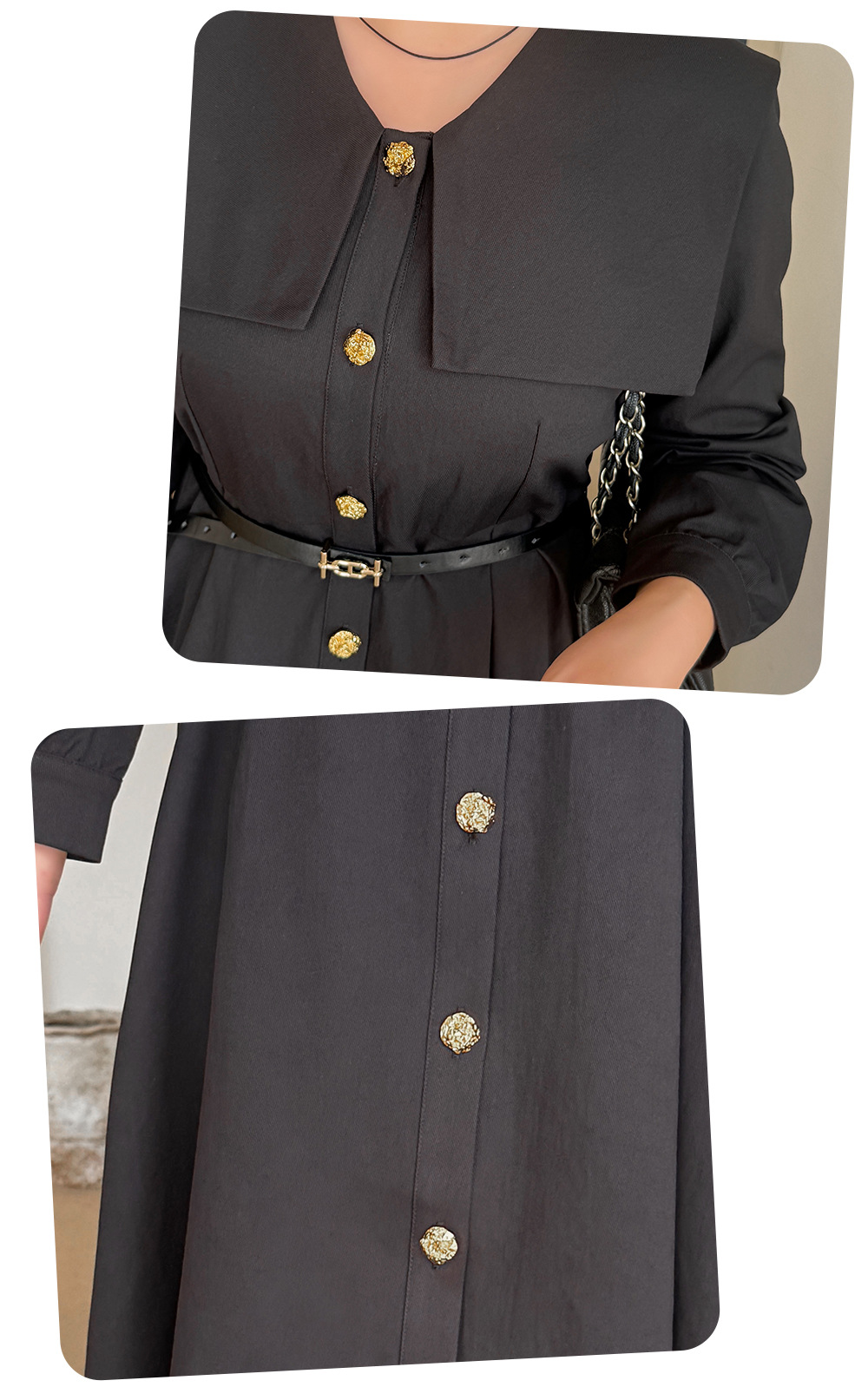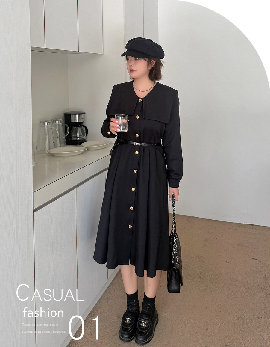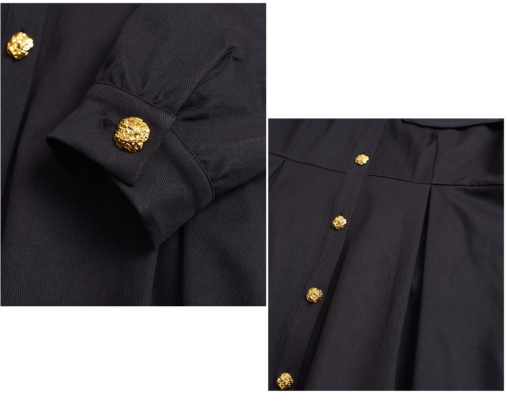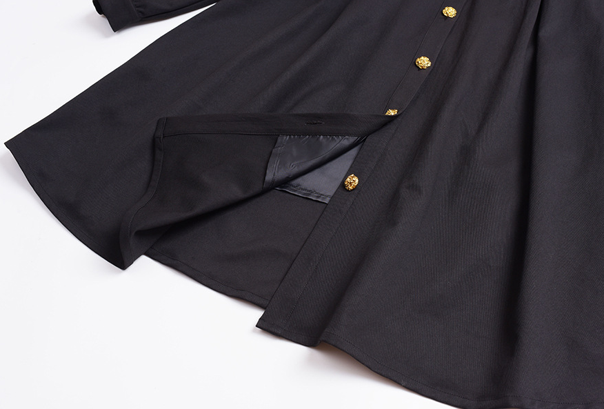 大きなラペルとフィットしたウエストのブラックワンピースは、厚みのあるツイル織り生地で、ハリとコシがあり、内側に裏地が付いています。フロントにはゴールドボタンが付いており、ボタンを開けることができます。また、袖口のボタンも外すことができます。ベルトは別売りとなっており、お客様でお選びいただけます。ウエストはゴム仕様、フィット感のあるAラインスカートは、春秋には一枚で、冬にはインナーとして着用でき、生活の様々なシーンで活躍します。