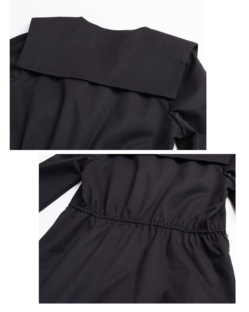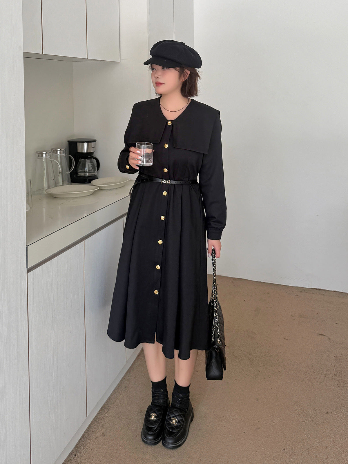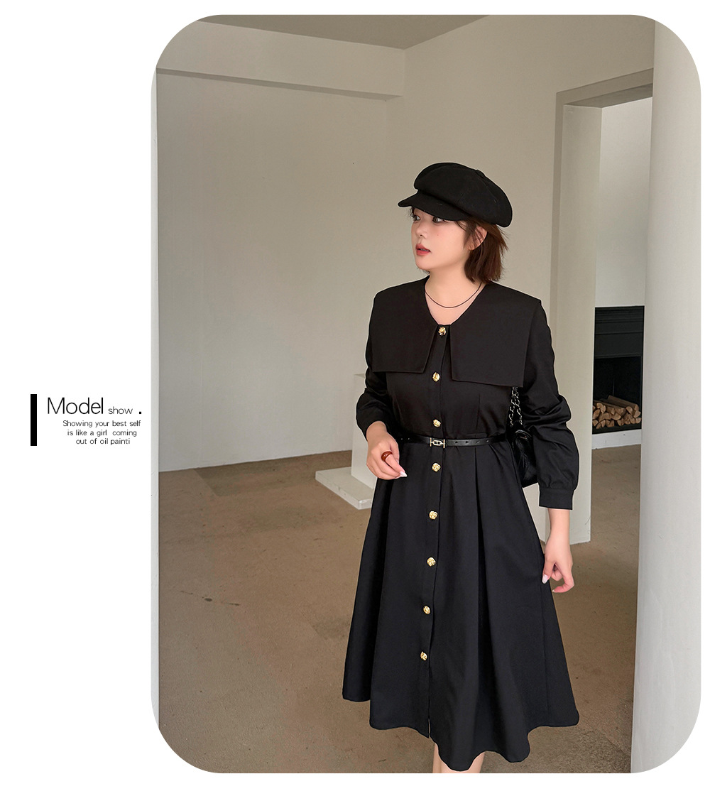 大きなラペルとフィットしたウエストのブラックワンピースは、厚みのあるツイル織り生地で、ハリとコシがあり、内側に裏地が付いています。フロントにはゴールドボタンが付いており、ボタンを開けることができます。また、袖口のボタンも外すことができます。ベルトは別売りとなっており、お客様でお選びいただけます。ウエストはゴム仕様、フィット感のあるAラインスカートは、春秋には一枚で、冬にはインナーとして着用でき、生活の様々なシーンで活躍します。