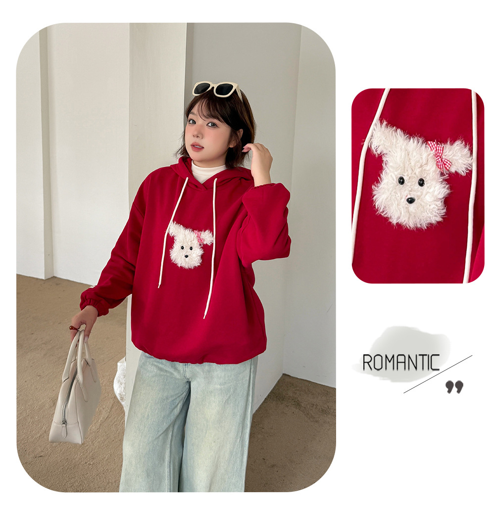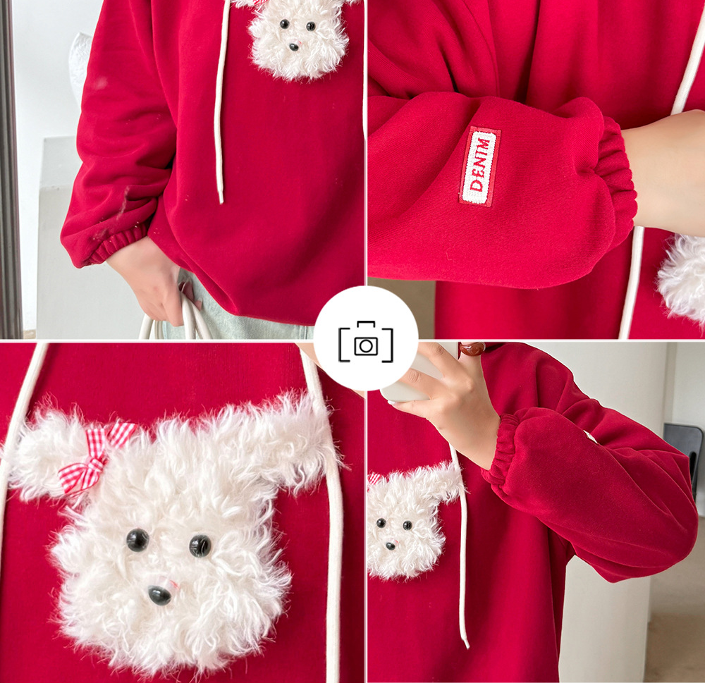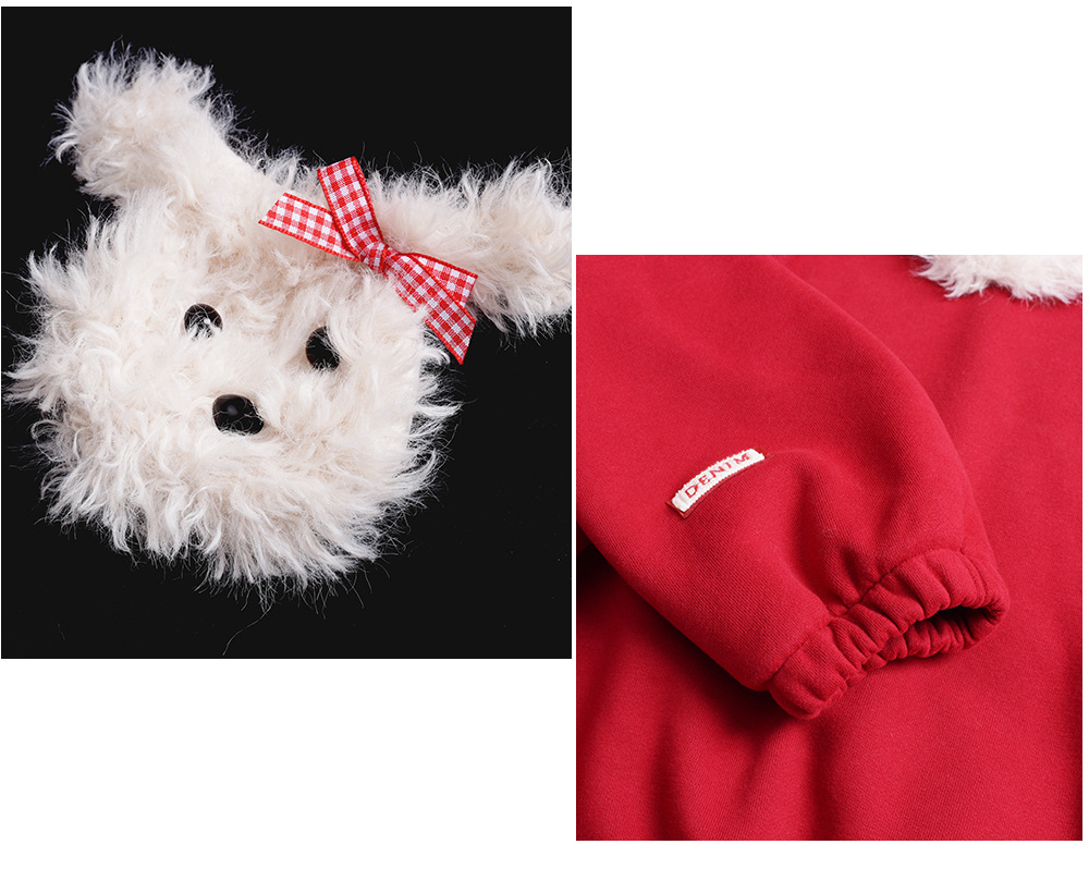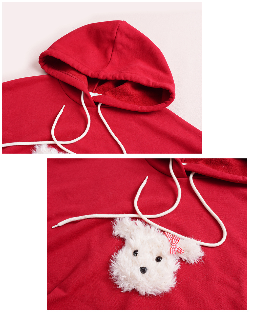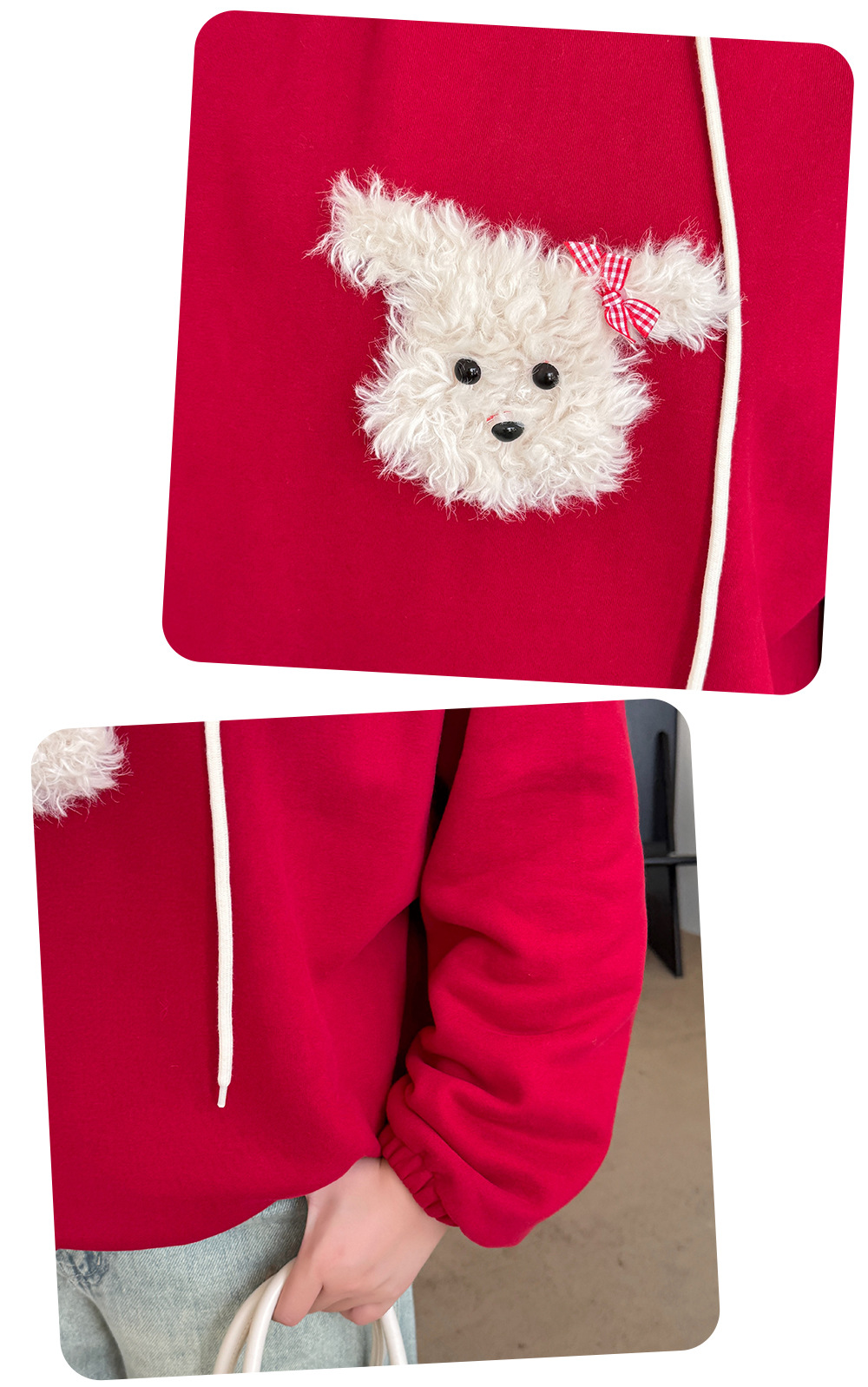 ニットのスウェットパーカーは、胸元に立体的でふわふわの小さな犬が飾られており、ピンクのリボンが賑やかで愛らしいです。起毛テリー生地は柔らかく、厚手で、やや伸縮性があります。フードに紐が付いており、ゆったりとしたドロップショルダーのデザインで、伸縮性のある袖口に小さなロゴのワッペンが付いています。裾には伸縮性のあるバックルが付いており、裾周りを調節できます。