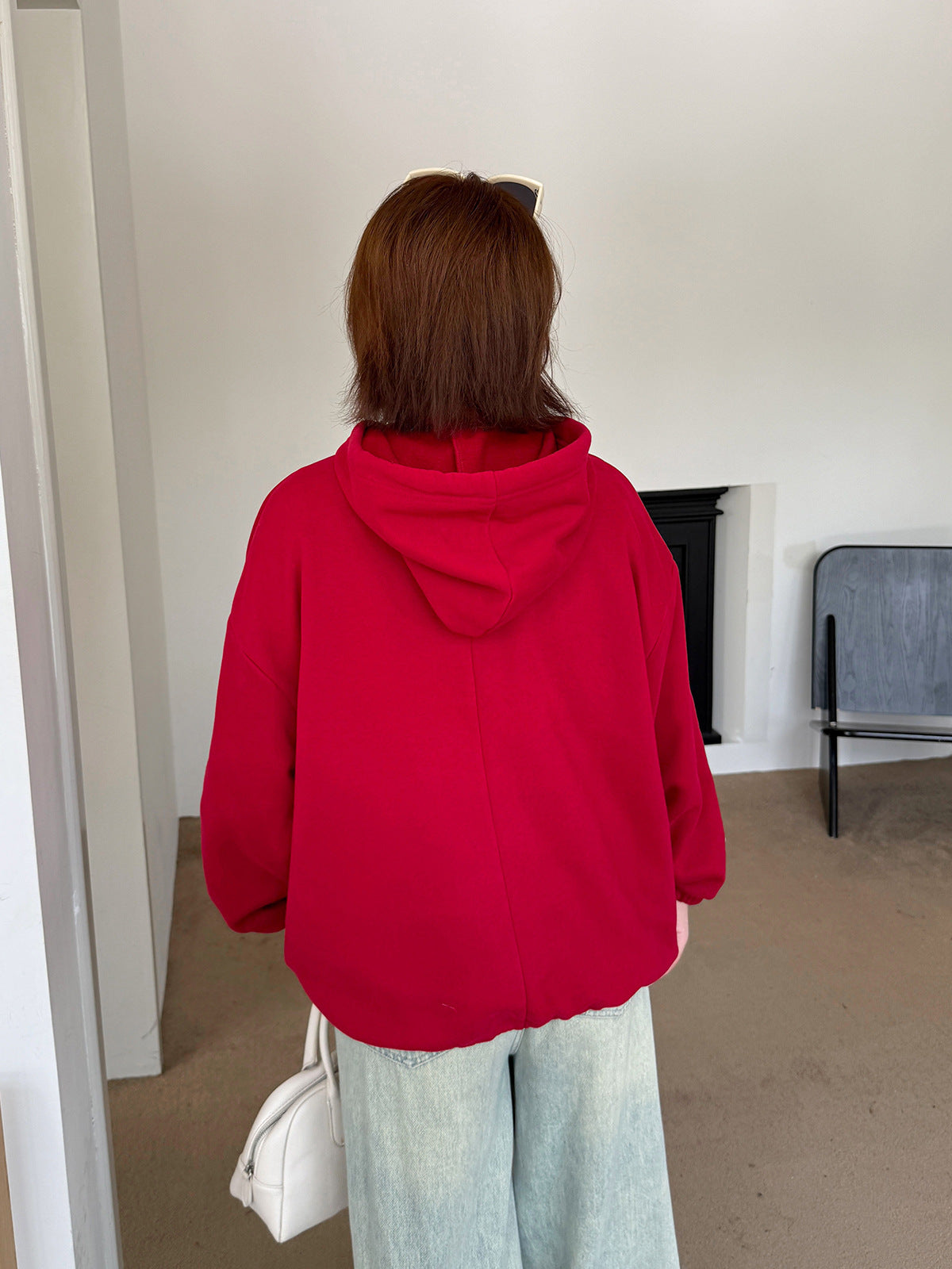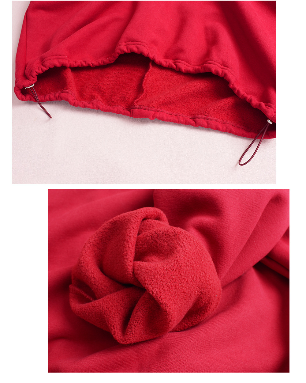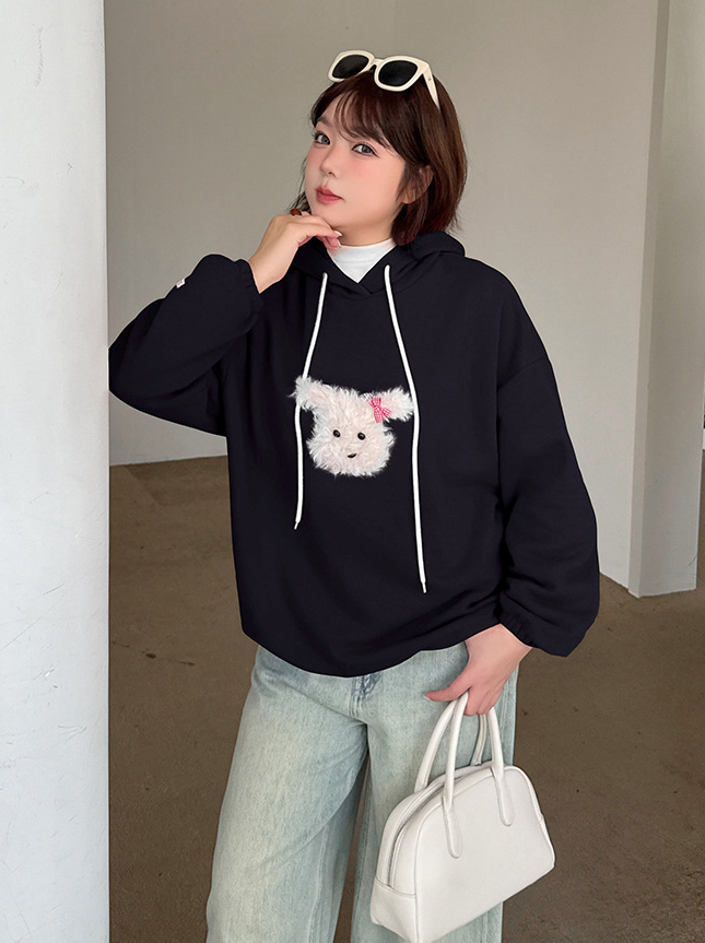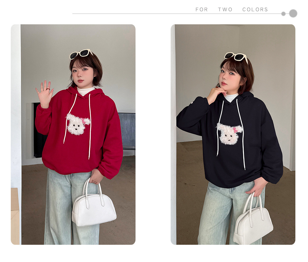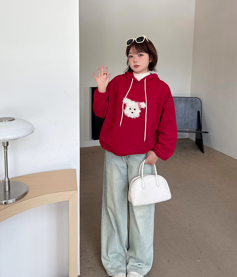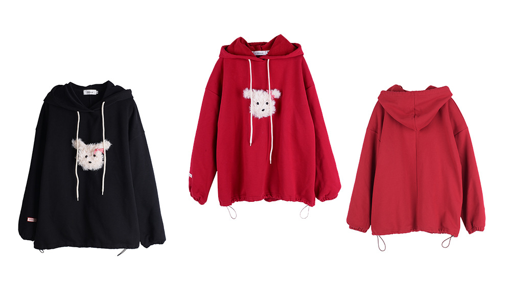 ニットのスウェットパーカーは、胸元に立体的でふわふわの小さな犬が飾られており、ピンクのリボンが賑やかで愛らしいです。起毛テリー生地は柔らかく、厚手で、やや伸縮性があります。フードに紐が付いており、ゆったりとしたドロップショルダーのデザインで、伸縮性のある袖口に小さなロゴのワッペンが付いています。裾には伸縮性のあるバックルが付いており、裾周りを調節できます。