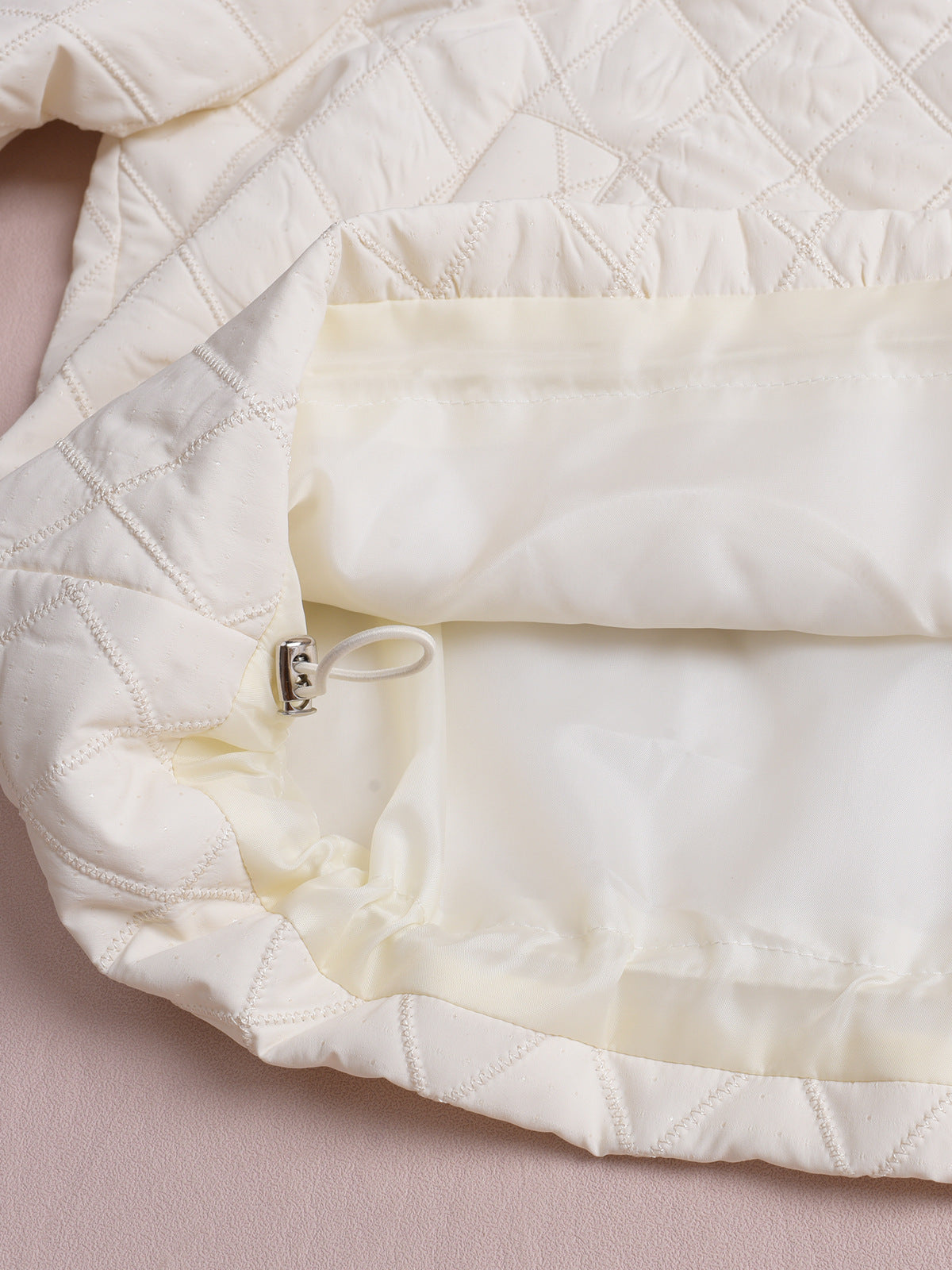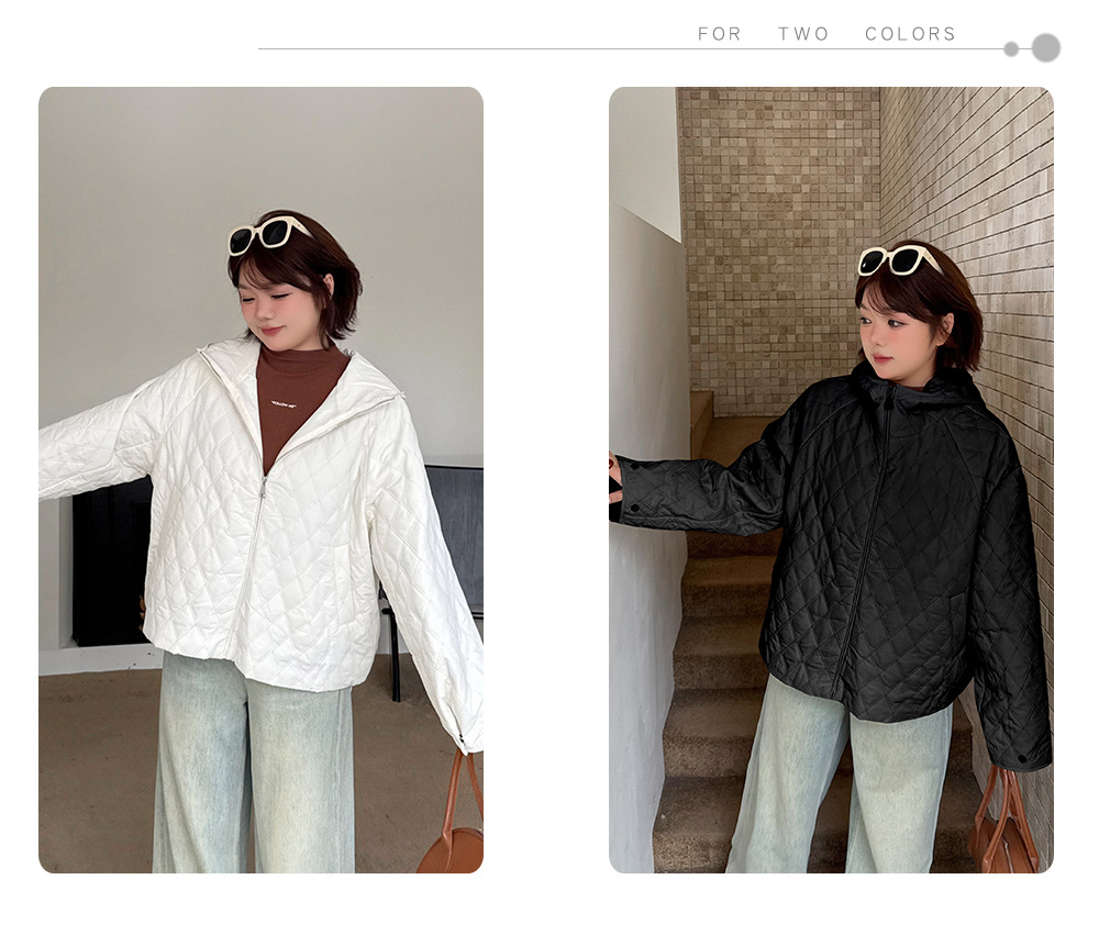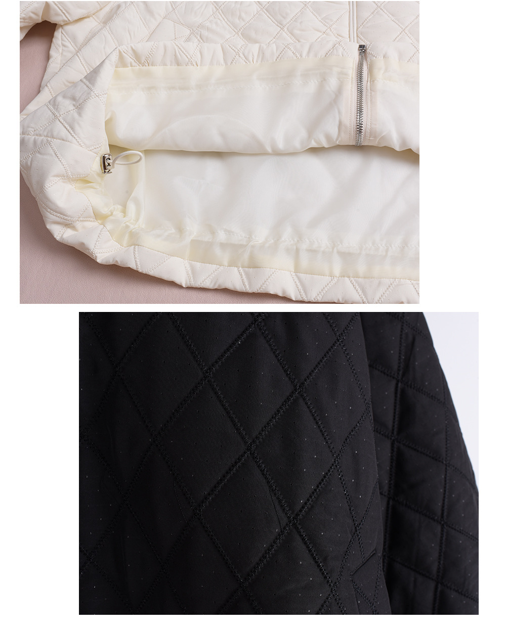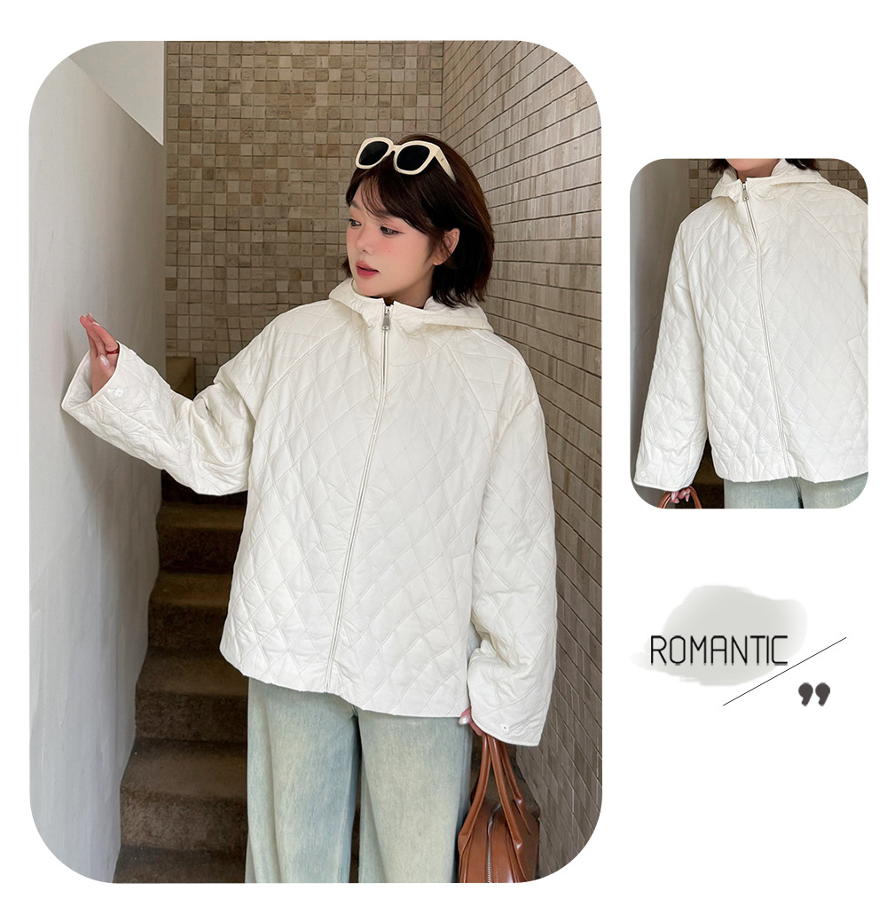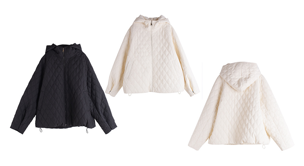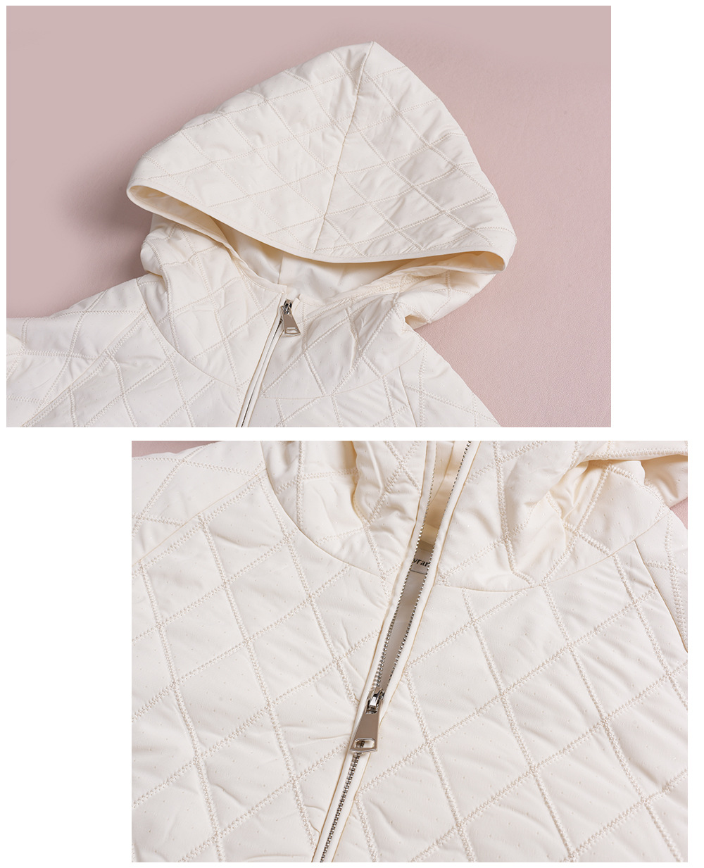 軽量フード付きコットンジャケットは、美しい織りのキルティング生地で作られており、表面にはクロスステッチ刺繍と細かなラメが施されています。軽量で快適なスタイル、柔らかな質感、暖かく防風性があります。フード付きデザインで、フロントにジッパーが付いています。両サイドに斜めポケットがあり、ゆったりとしたドロップショルダーデザインで、袖口にはボタンが付いています。裾の内側にドローストリングが付いており調整できます。デイリーカジュアルにお使いいただける一着です。