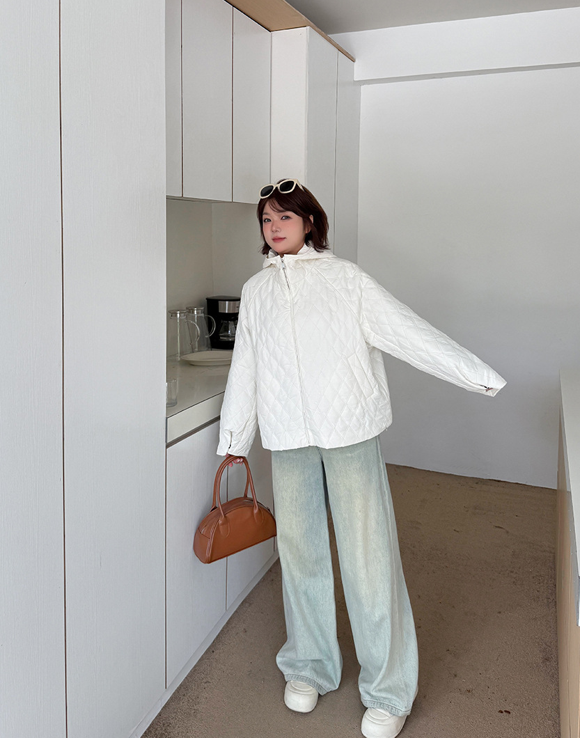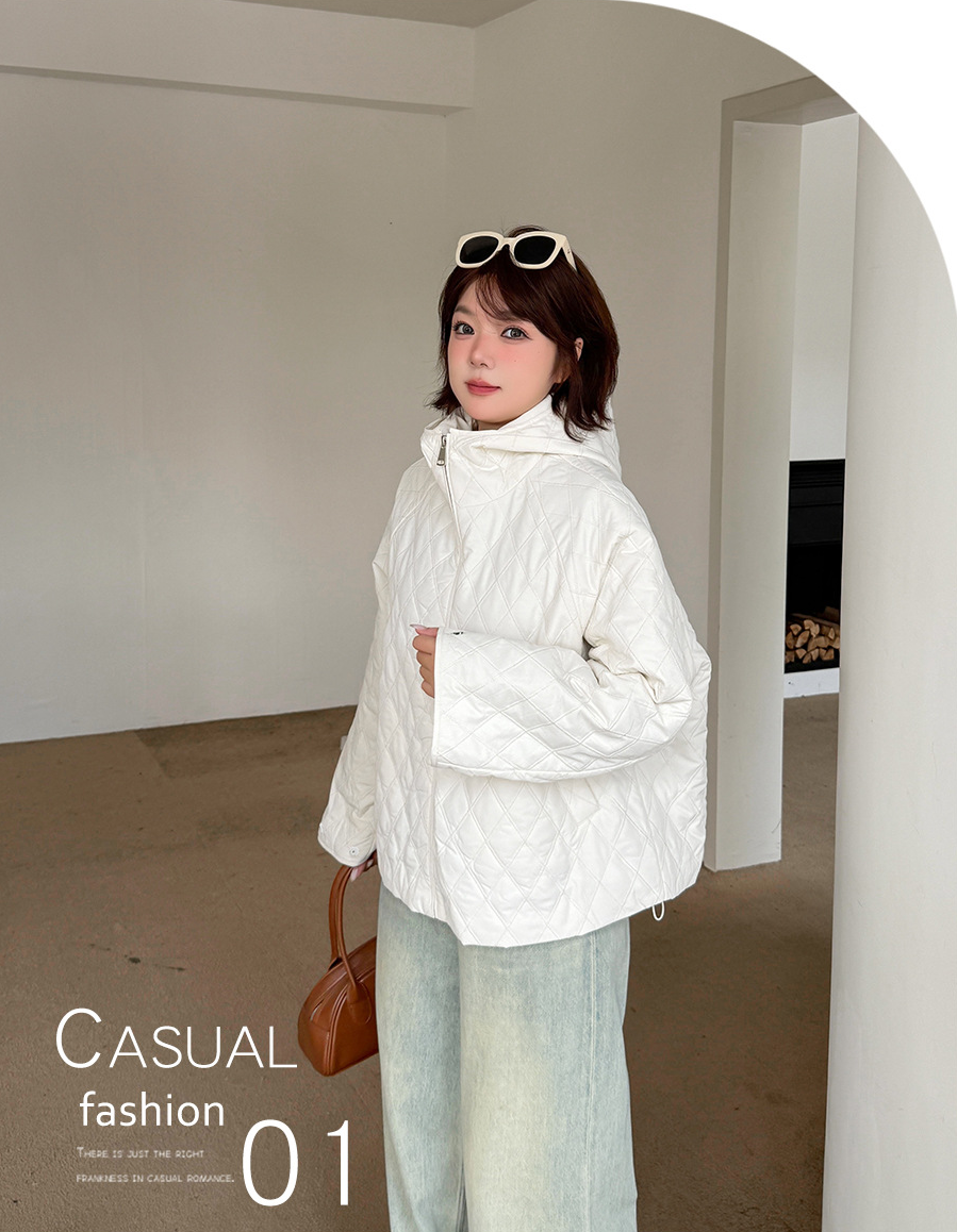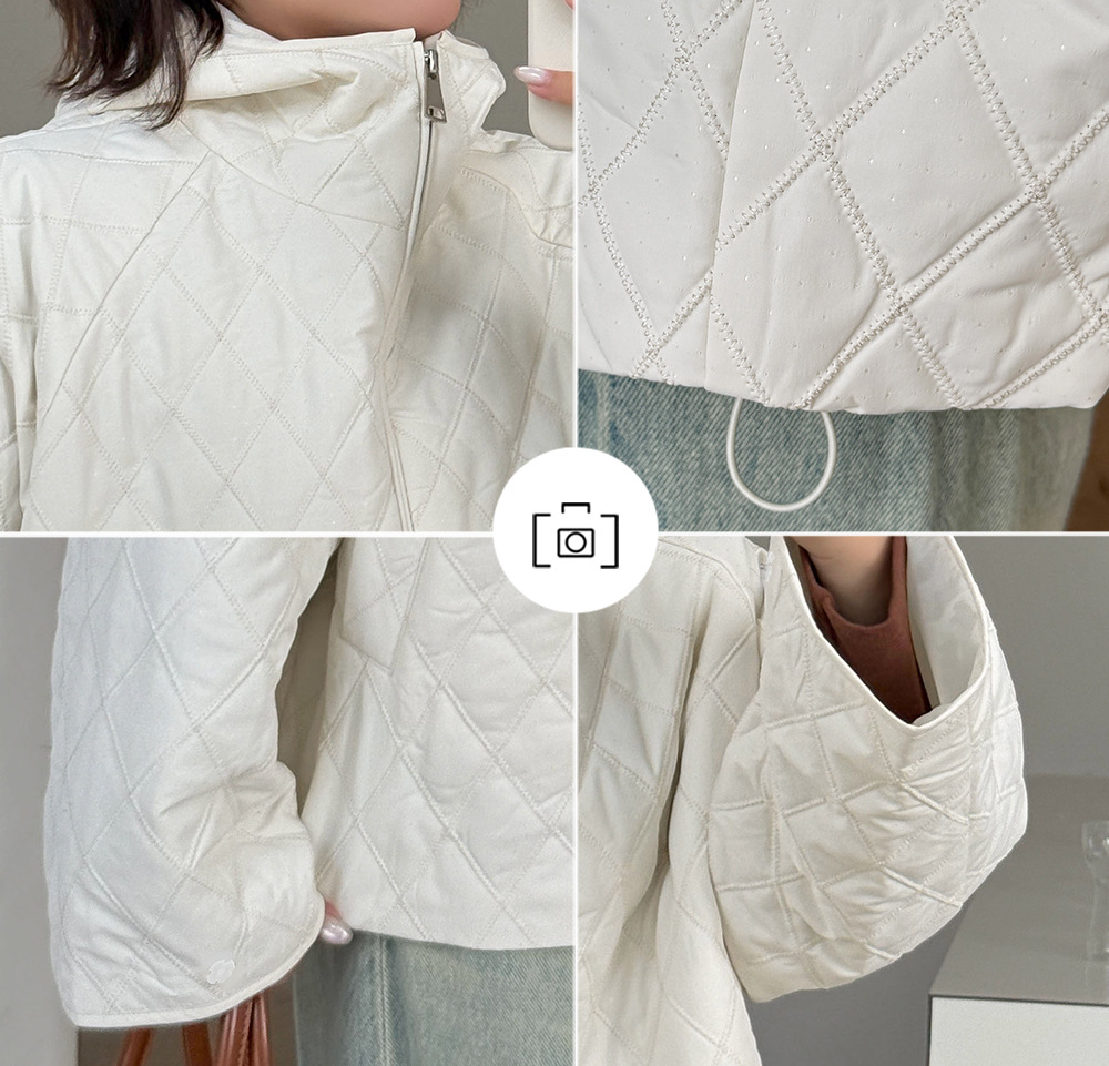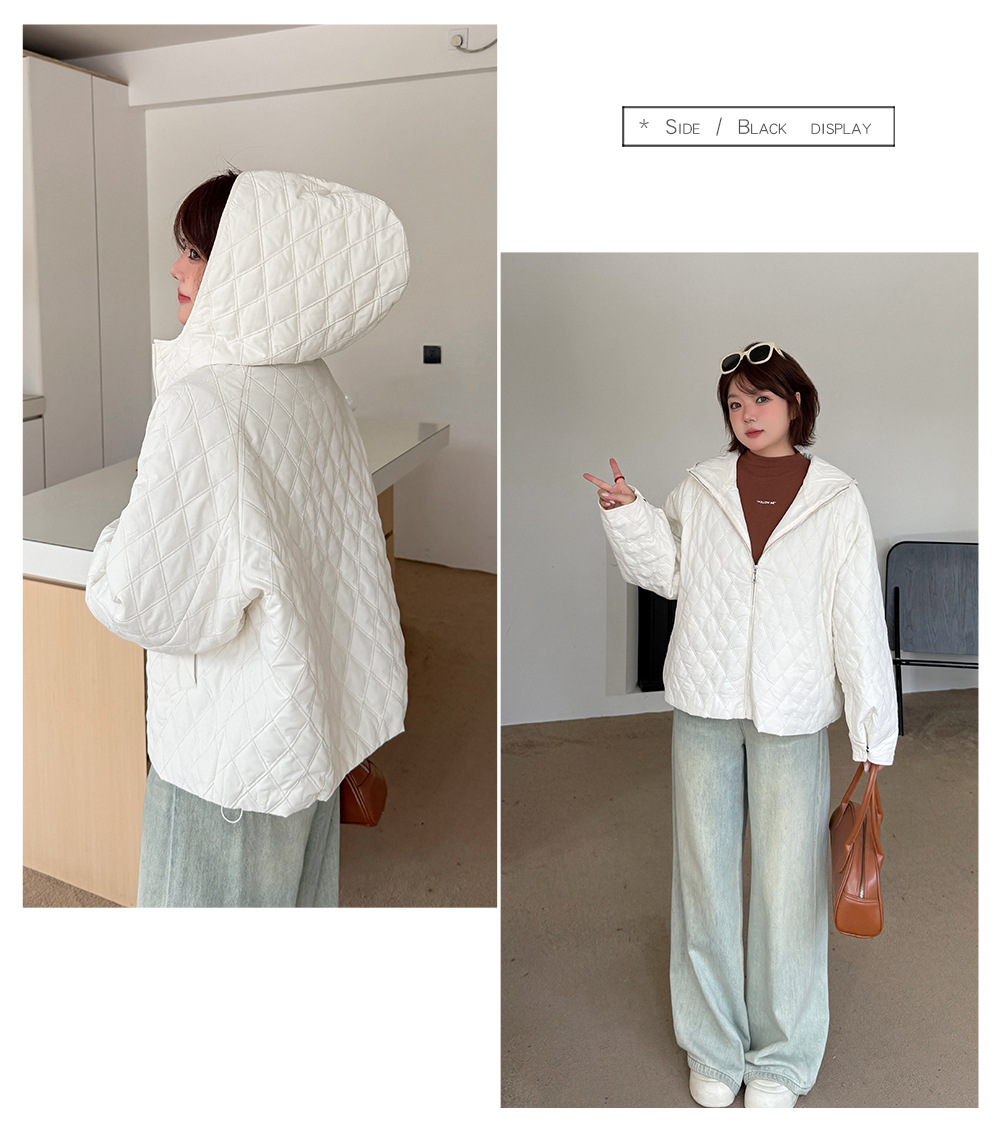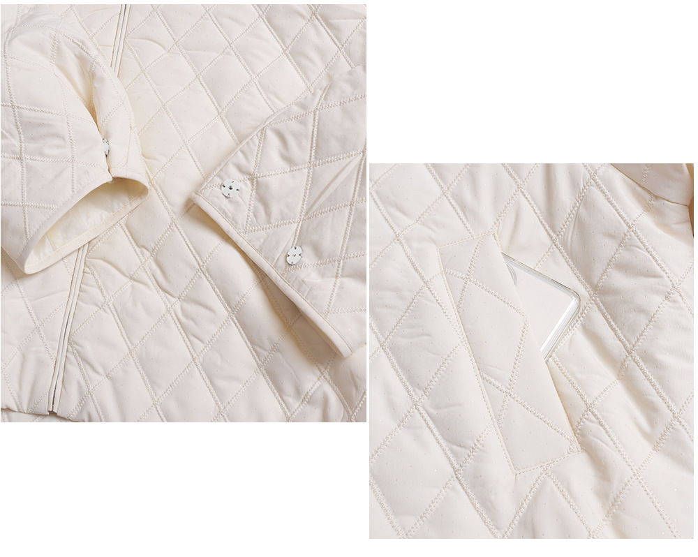 軽量フード付きコットンジャケットは、美しい織りのキルティング生地で作られており、表面にはクロスステッチ刺繍と細かなラメが施されています。軽量で快適なスタイル、柔らかな質感、暖かく防風性があります。フード付きデザインで、フロントにジッパーが付いています。両サイドに斜めポケットがあり、ゆったりとしたドロップショルダーデザインで、袖口にはボタンが付いています。裾の内側にドローストリングが付いており調整できます。デイリーカジュアルにお使いいただける一着です。