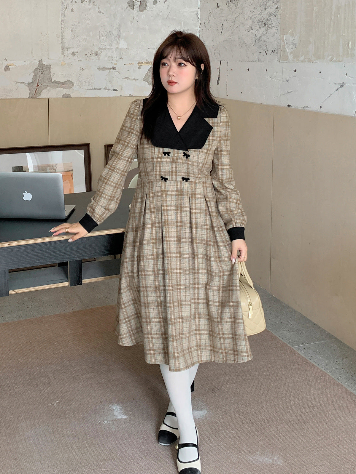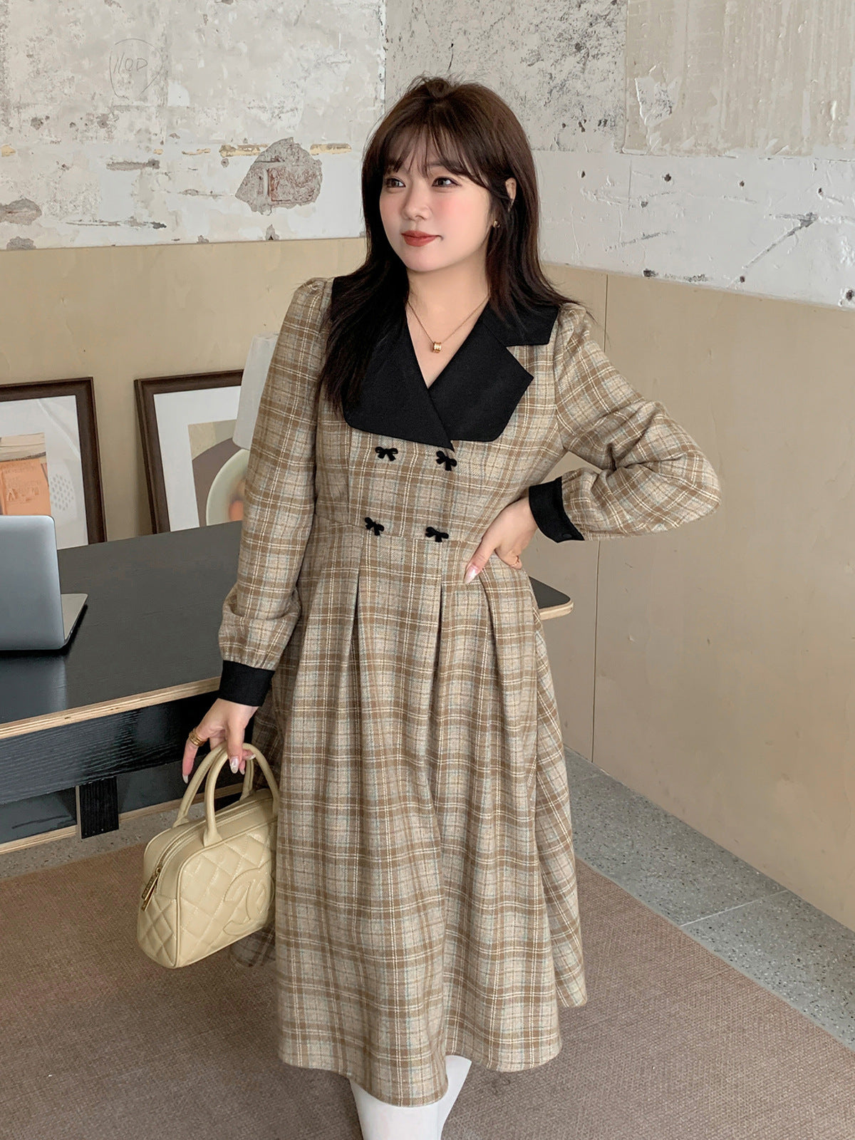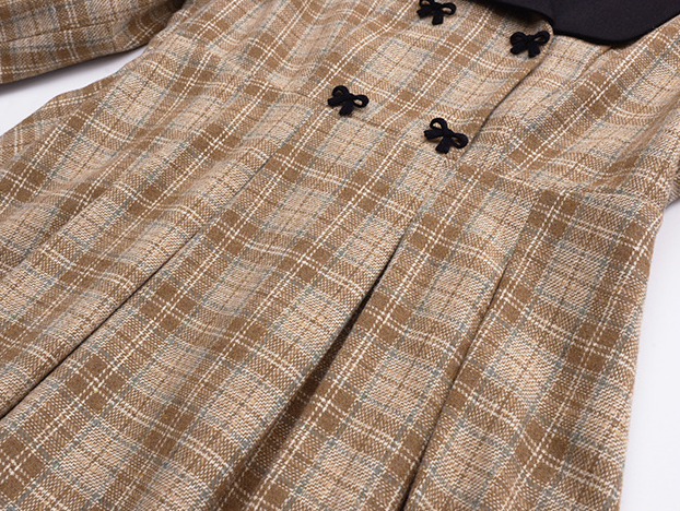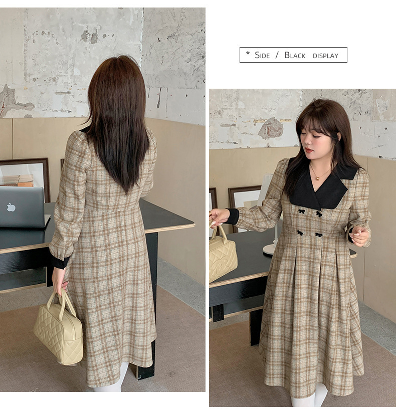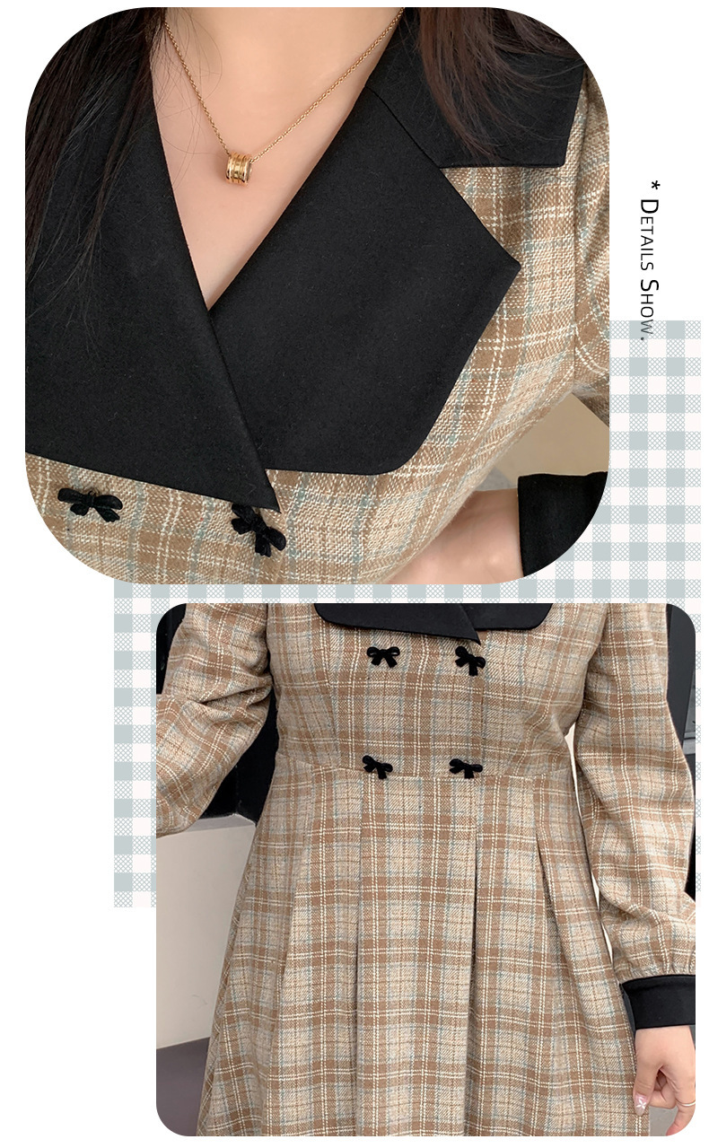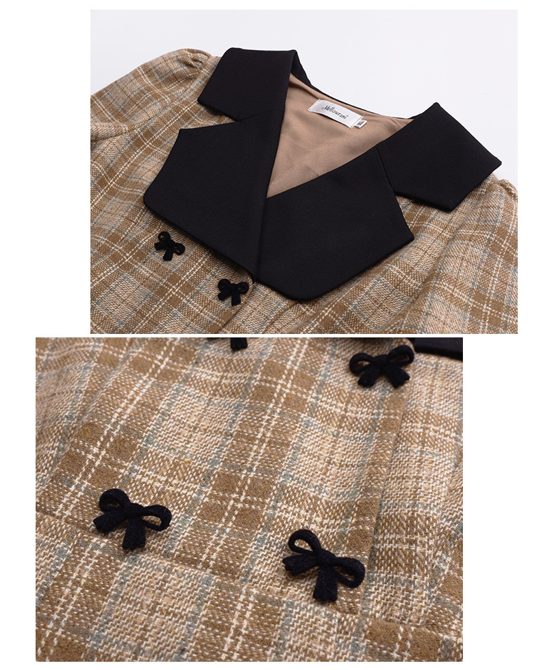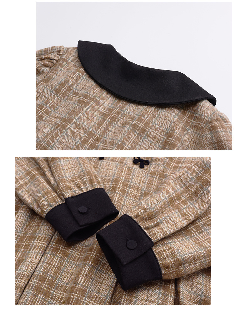 こちらの襟付きチェック柄ワンピースは、厚手でドレープ性に優れたチェック柄ウール風生地を使用しており、柔らかな裏地付きです。ブラックのラペルと袖口が洗練された印象のデザインです。ダブルブレストは装飾的な黒のフロックリボンがあしらわれ、開けることはできません。スカートは、フロントウエストにプリーツ、サイドシームにファスナー、ウエストを絞ったデザイン、そしてふっくらとしたAラインシルエットが特徴です。シンプルで清楚な雰囲気、そして着心地のいいワンピースを是非お試しください。
