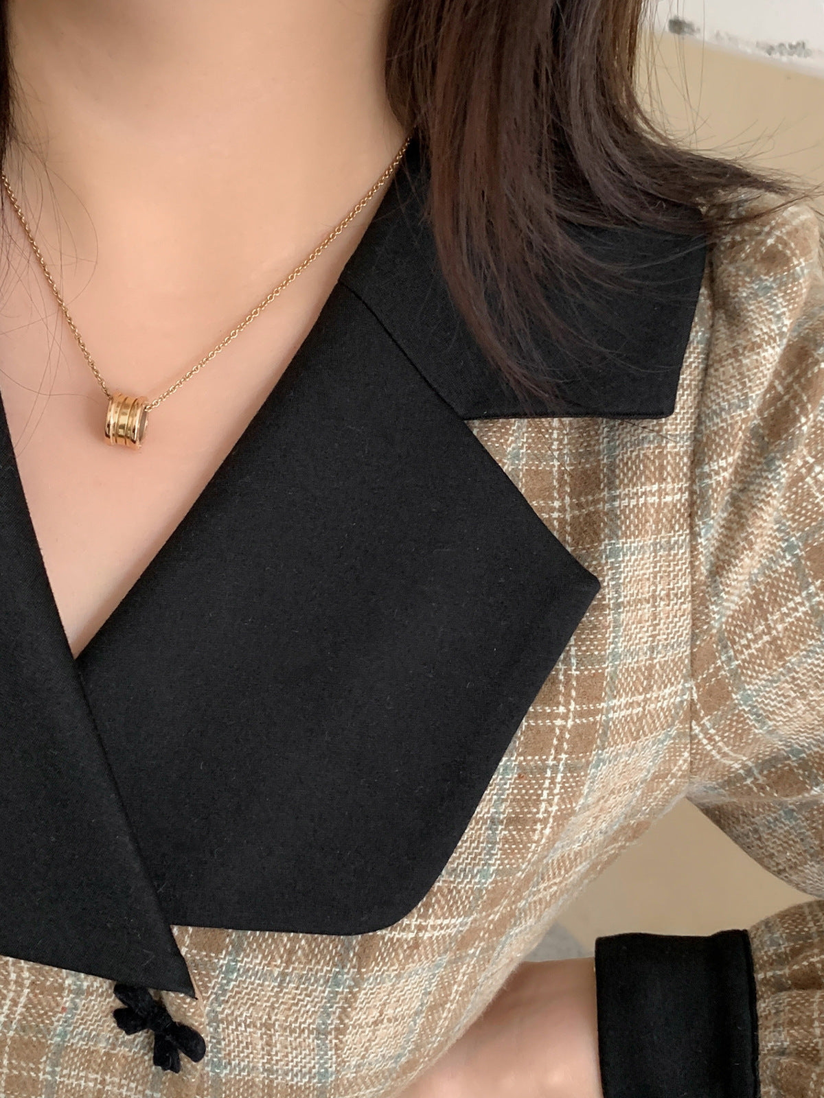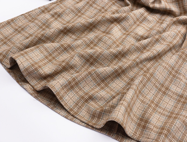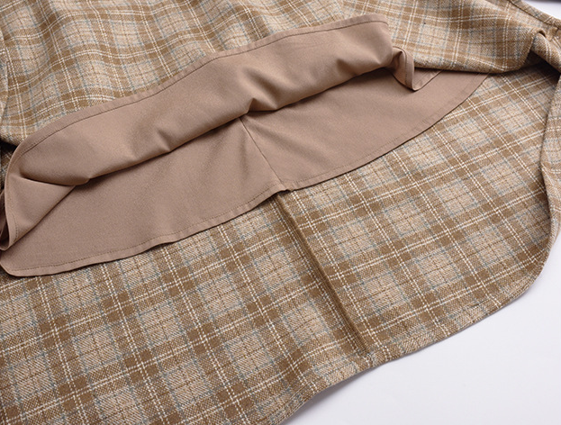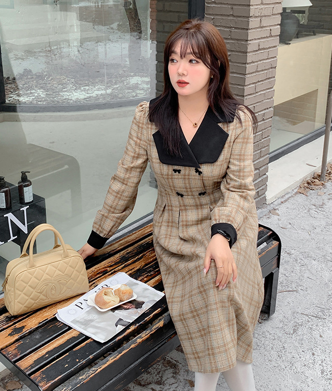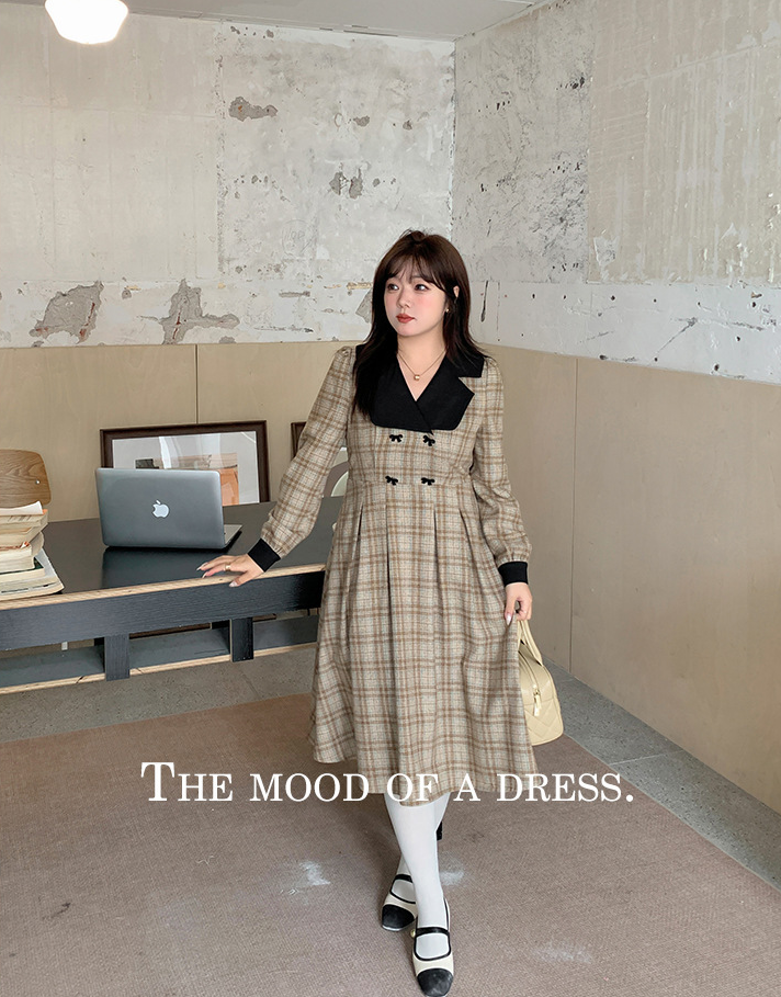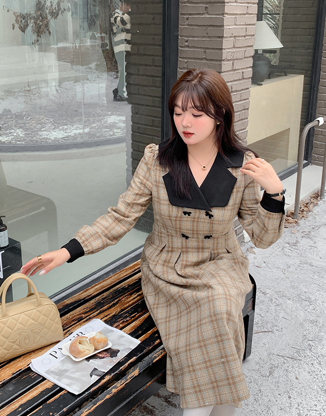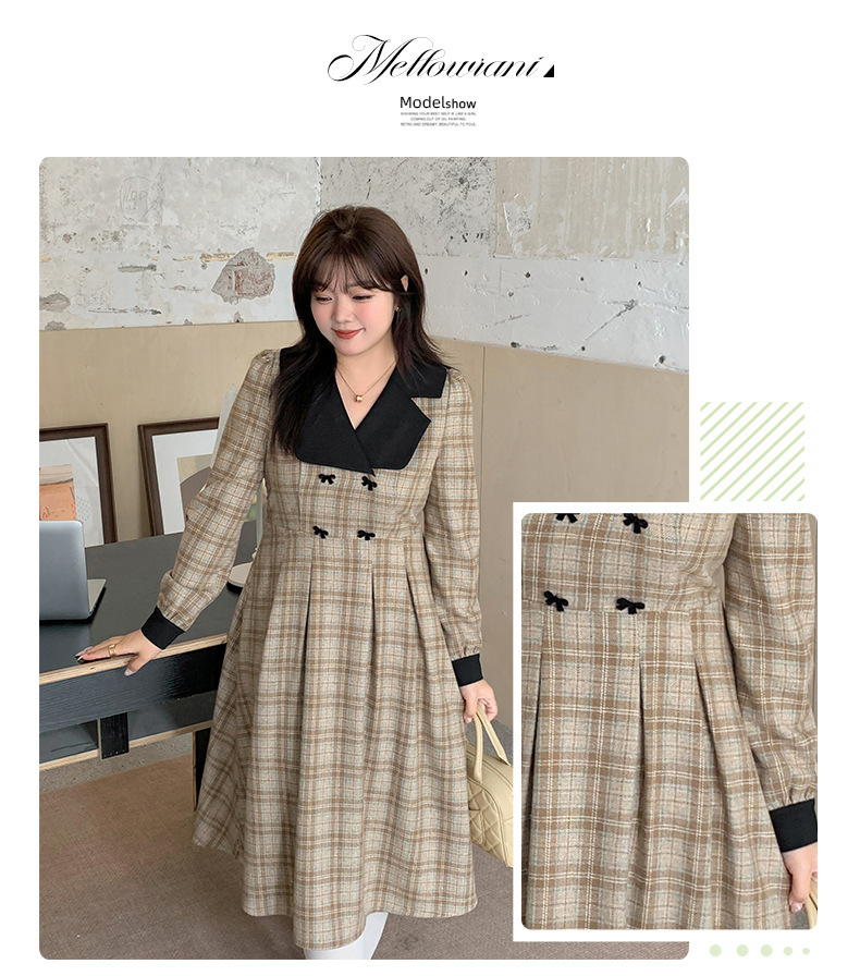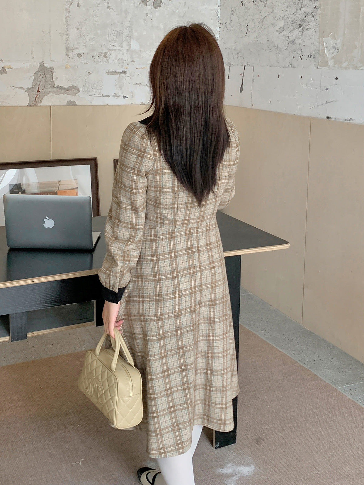こちらの襟付きチェック柄ワンピースは、厚手でドレープ性に優れたチェック柄ウール風生地を使用しており、柔らかな裏地付きです。ブラックのラペルと袖口が洗練された印象のデザインです。ダブルブレストは装飾的な黒のフロックリボンがあしらわれ、開けることはできません。スカートは、フロントウエストにプリーツ、サイドシームにファスナー、ウエストを絞ったデザイン、そしてふっくらとしたAラインシルエットが特徴です。シンプルで清楚な雰囲気、そして着心地のいいワンピースを是非お試しください。