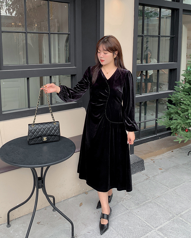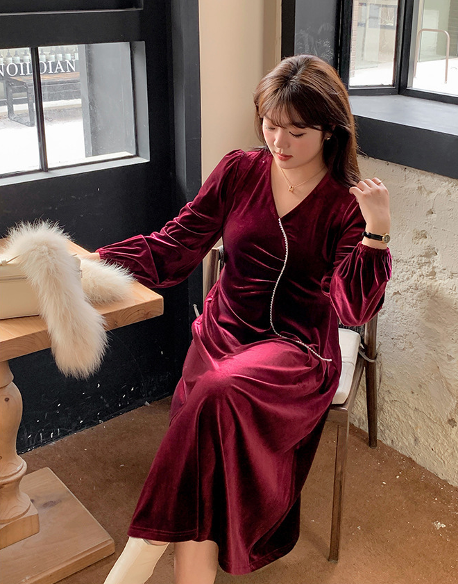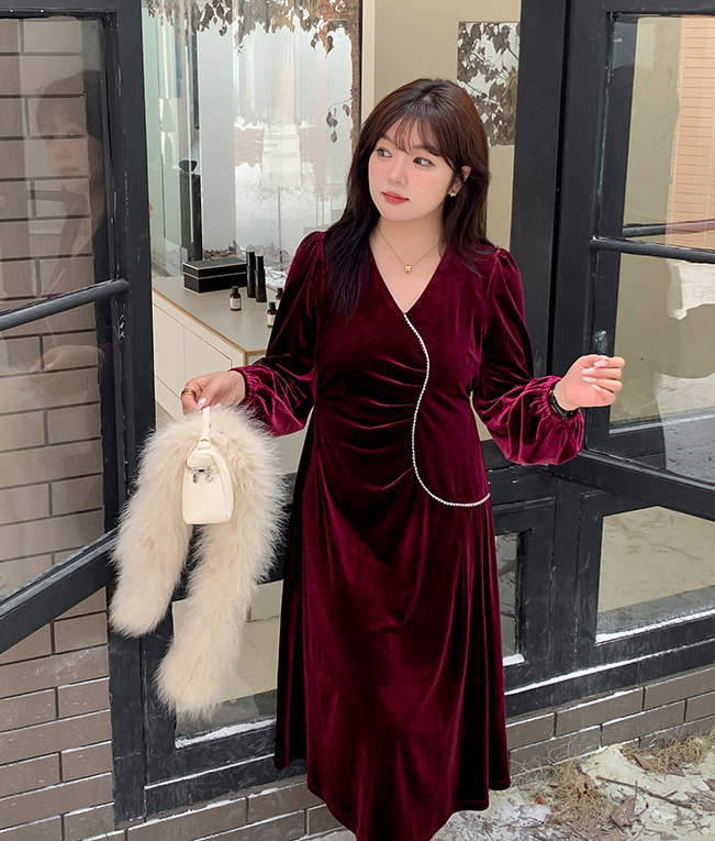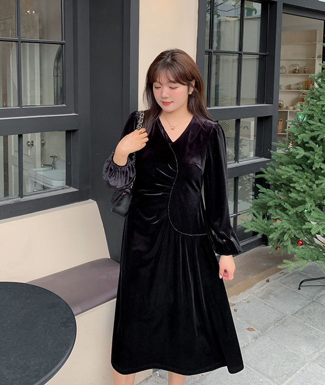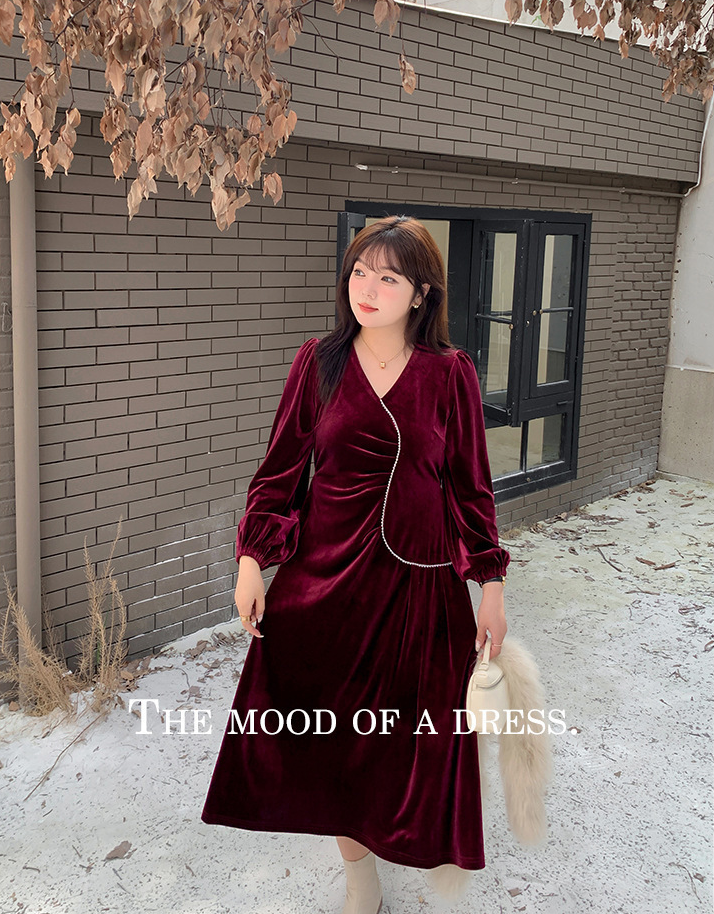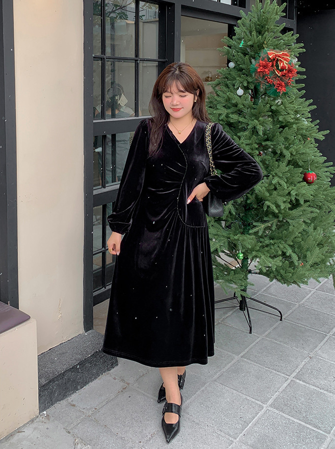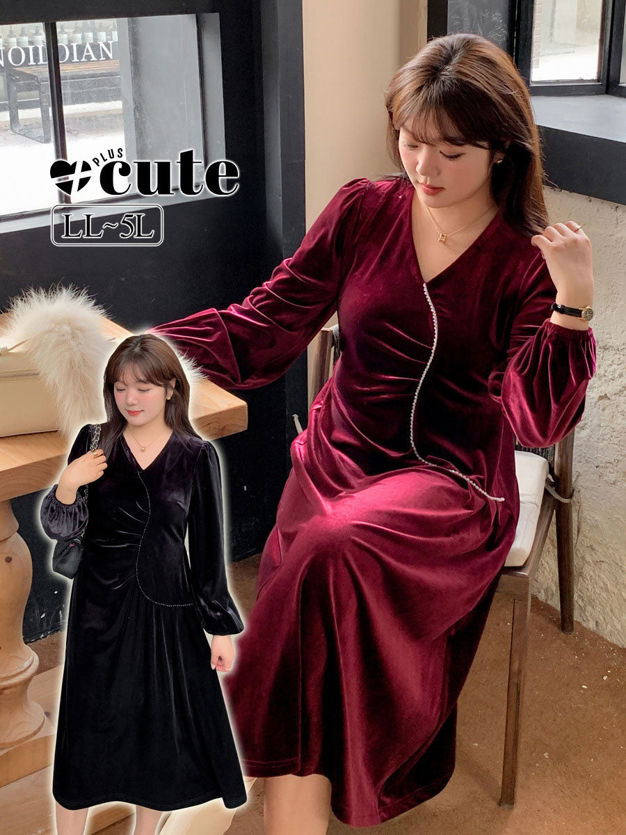 大きいサイズ レディース Vネックラインストーン装飾エレガントベルベットワンピース LL 3L 4L 5L
