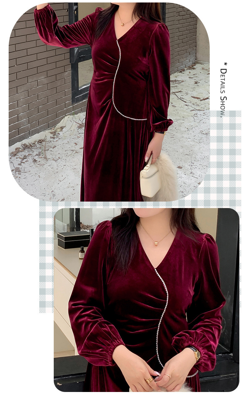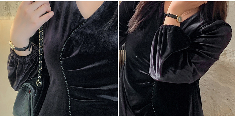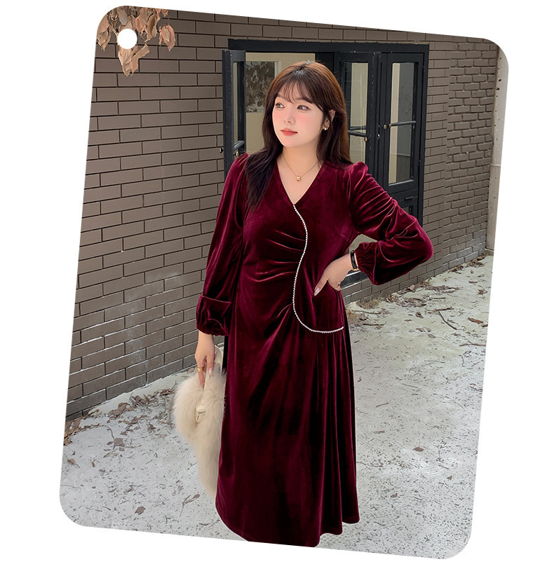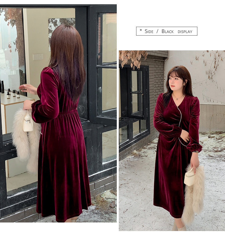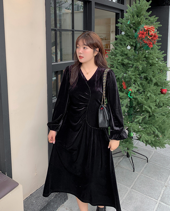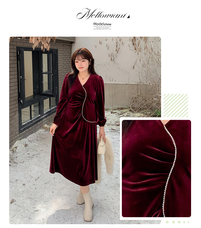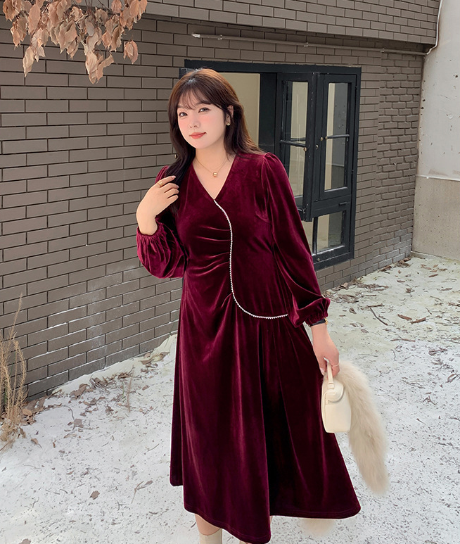 大きいサイズ レディース Vネックラインストーン装飾エレガントベルベットワンピース LL 3L 4L 5L