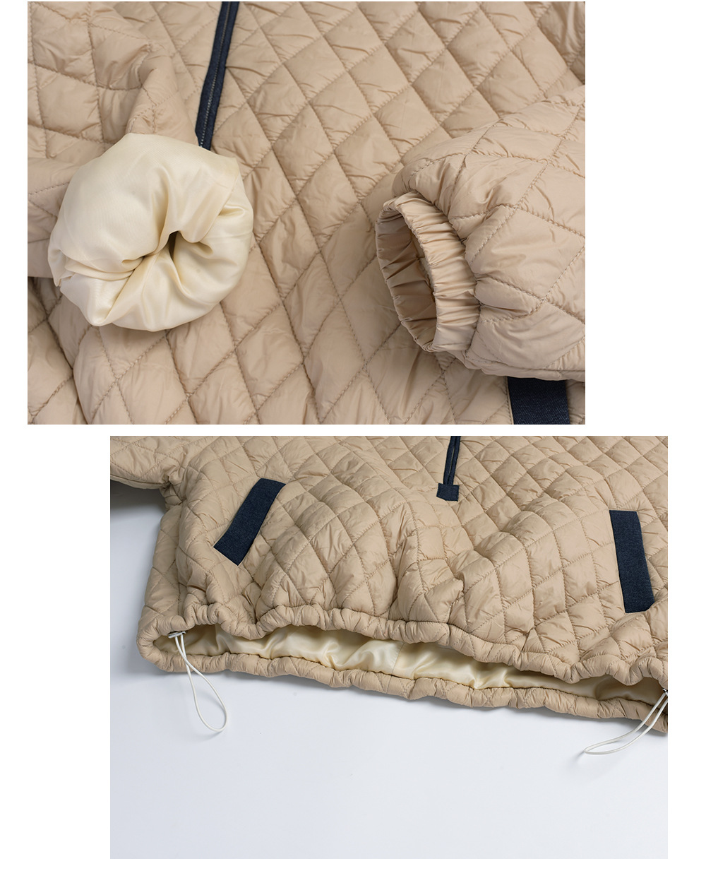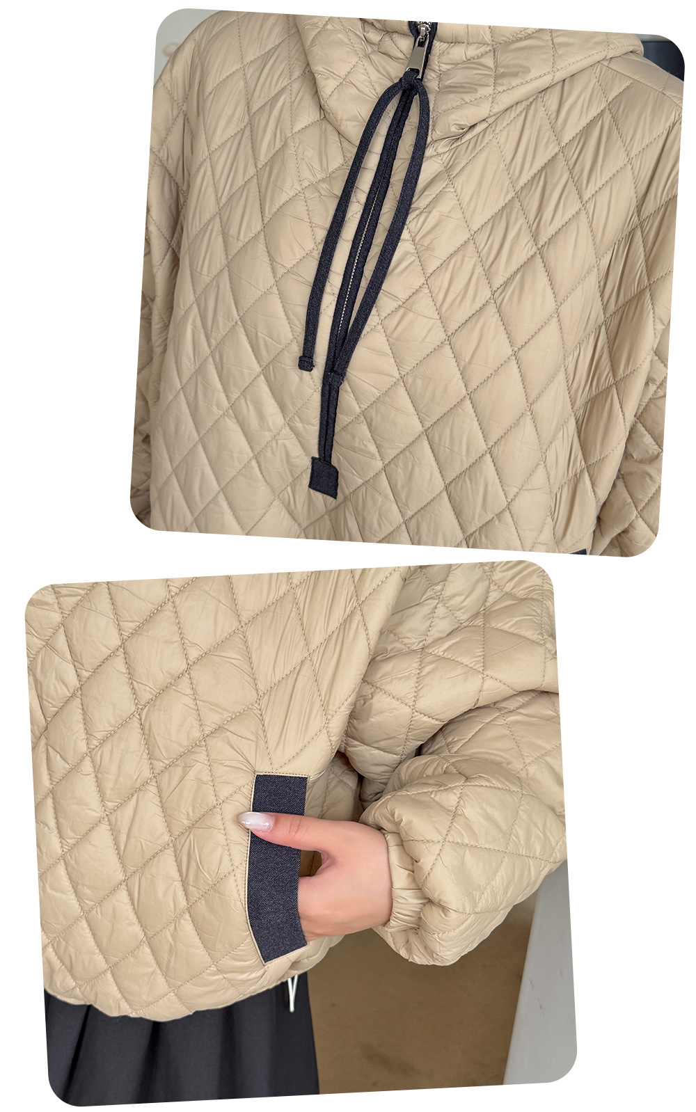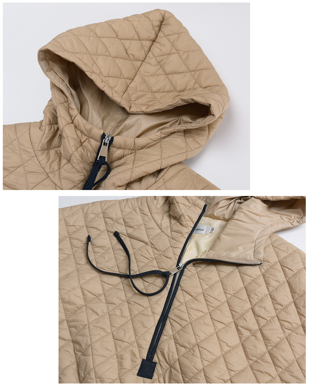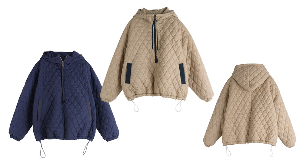 プルオーバースタイルのフード付きキルティングスウェットパーカーは、カジュアルなダウンジャケットとしても着用できます。織り込まれたキルティング生地は滑らかな肌触りで、軽くて暖かい着心地です。ネックラインにジッパーが付いたフード付きデザインで、フロントにポケットが2つ付いています。ゆったりとしたドロップショルダーデザインです。裾には伸縮性のあるドローストリングが付いており、裾周りを調節できます。インナーとしても単体でも着用可能で、軽やかでスタイリッシュな毎日を演出します。