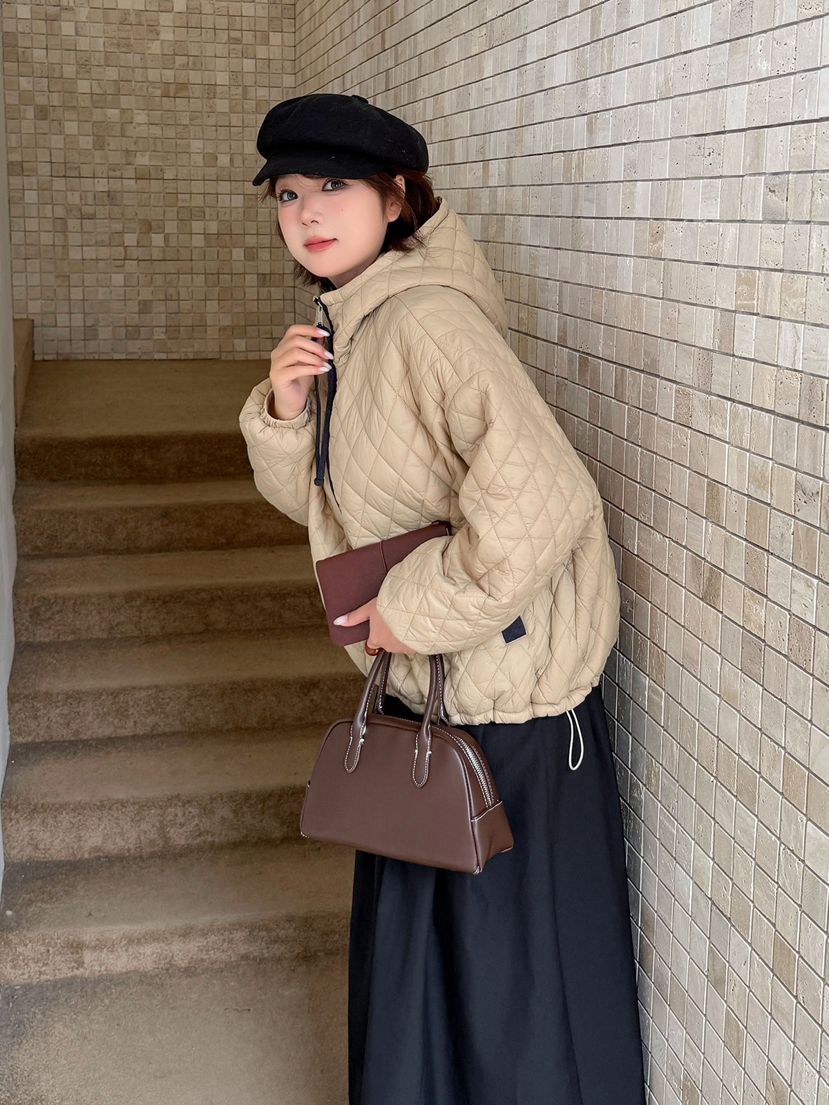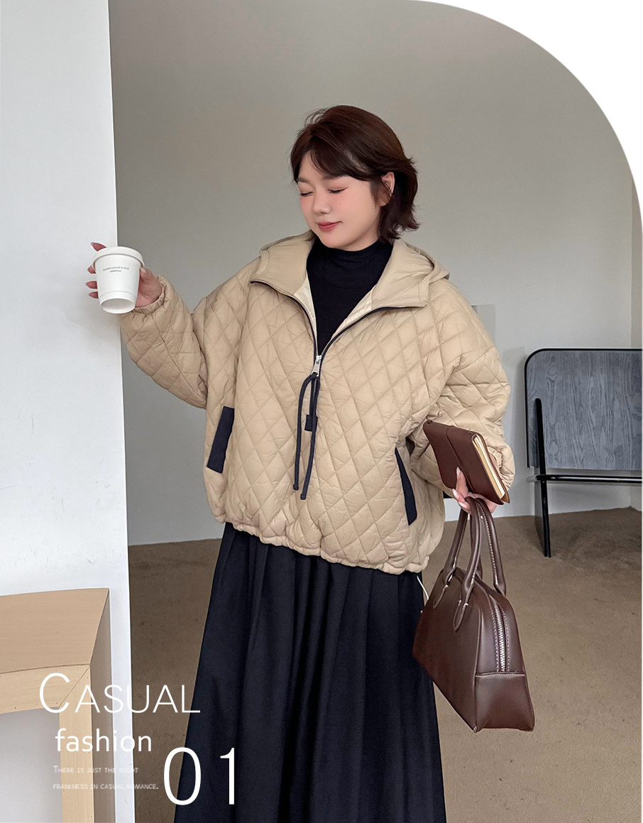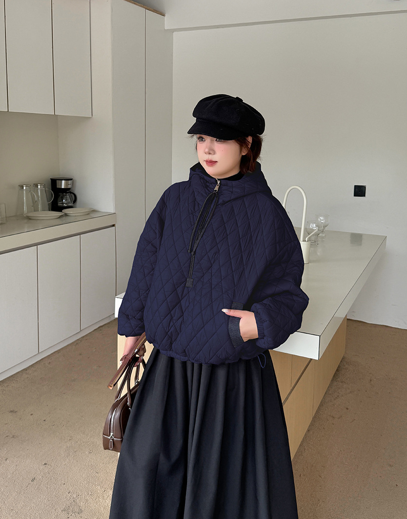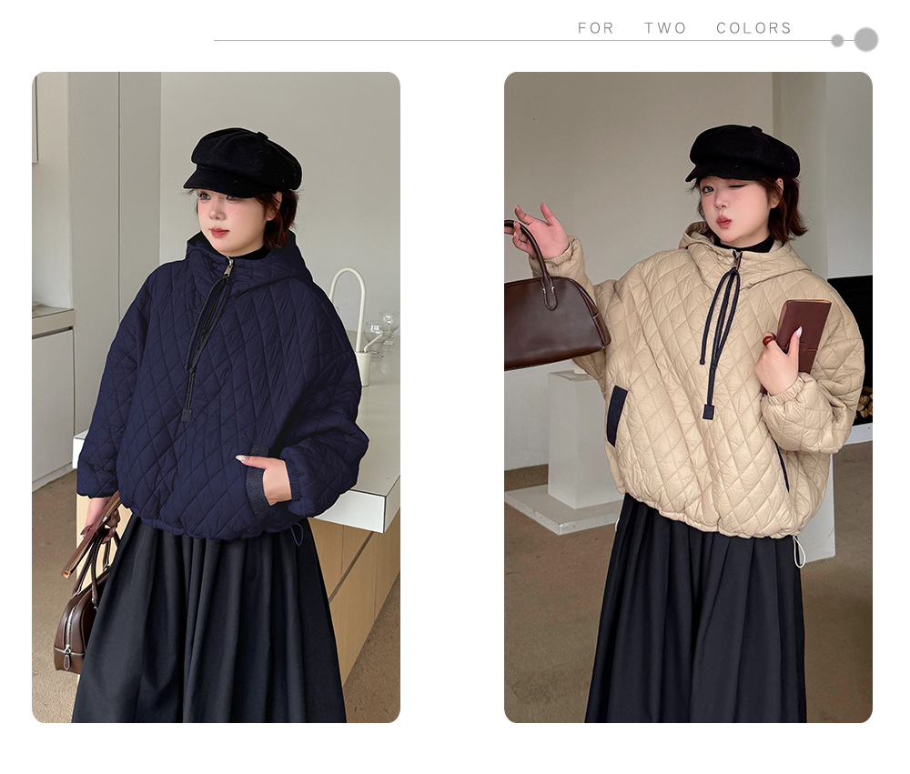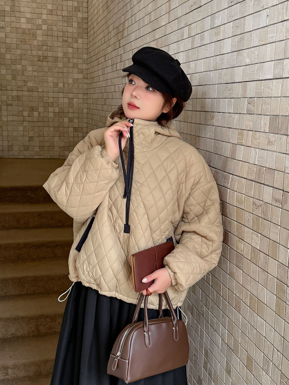 プルオーバースタイルのフード付きキルティングスウェットパーカーは、カジュアルなダウンジャケットとしても着用できます。織り込まれたキルティング生地は滑らかな肌触りで、軽くて暖かい着心地です。ネックラインにジッパーが付いたフード付きデザインで、フロントにポケットが2つ付いています。ゆったりとしたドロップショルダーデザインです。裾には伸縮性のあるドローストリングが付いており、裾周りを調節できます。インナーとしても単体でも着用可能で、軽やかでスタイリッシュな毎日を演出します。