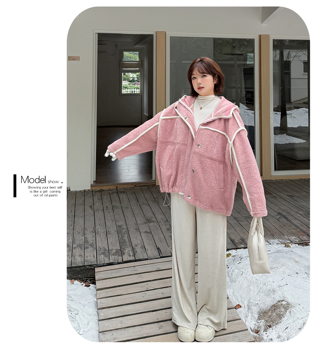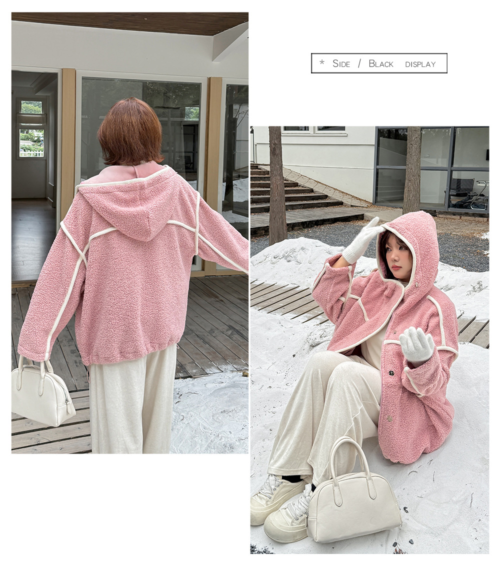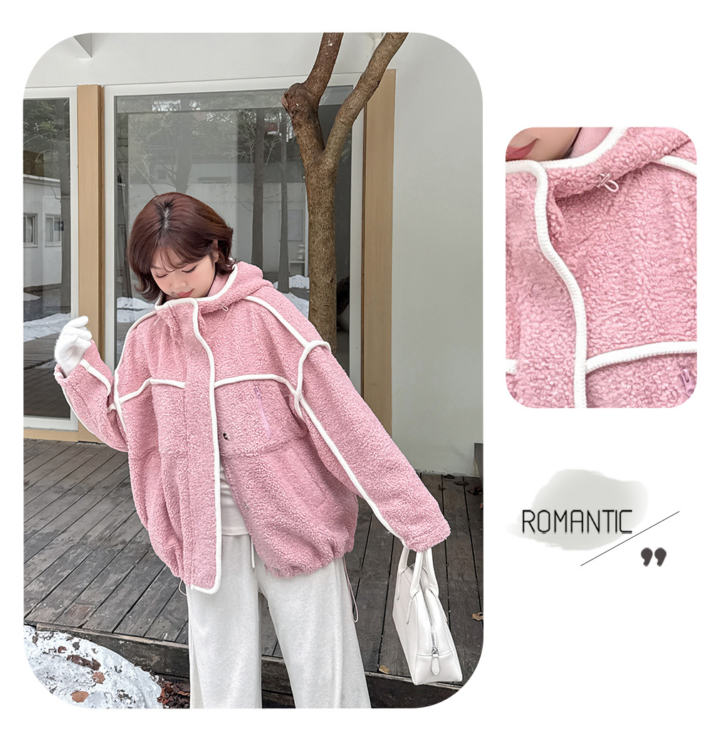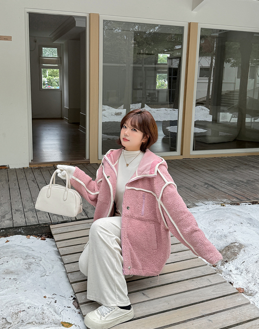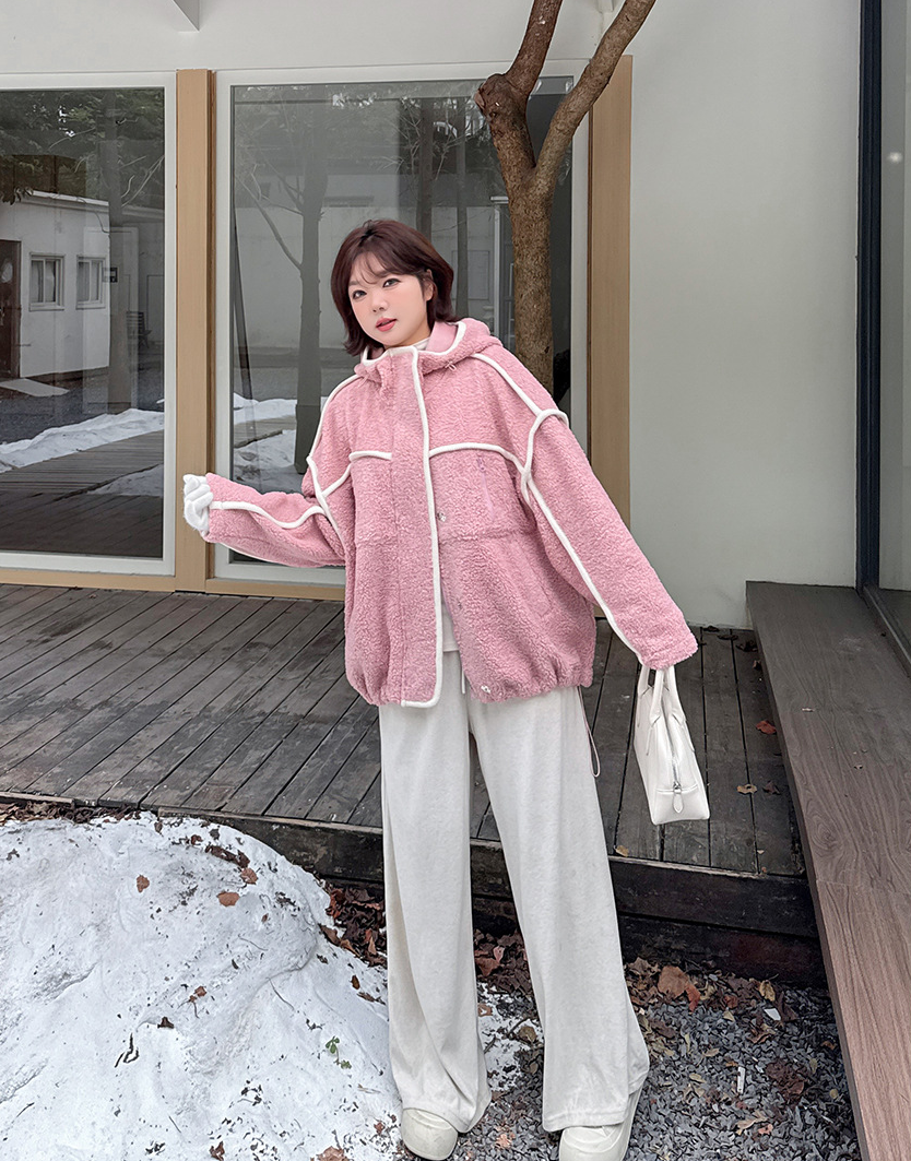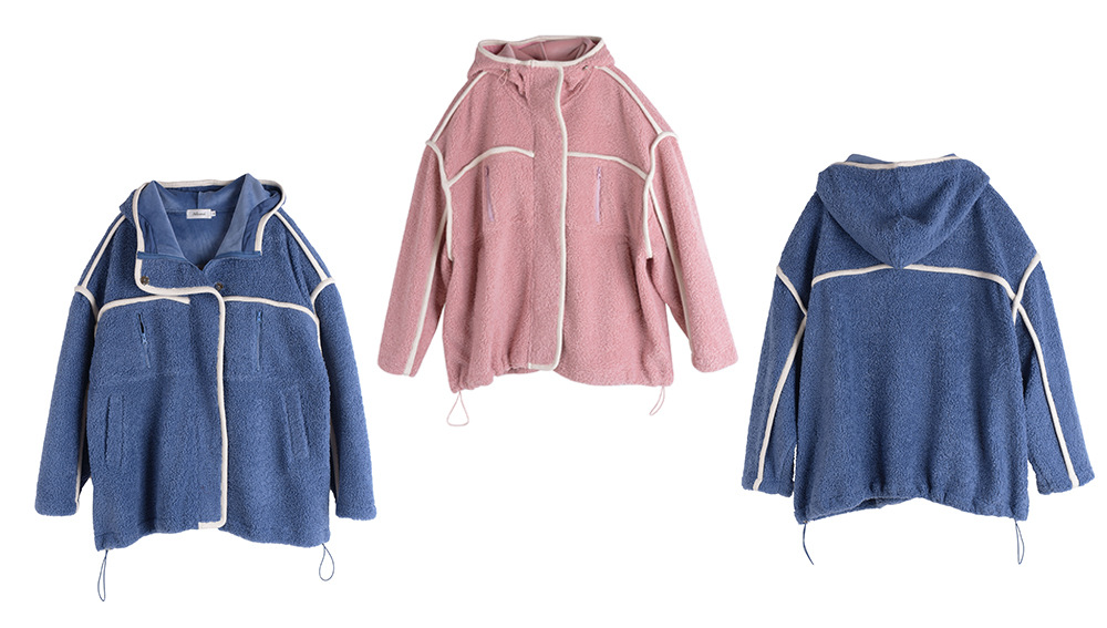コントラストのあるパイピングデザインのボアフリースジャケット。立体的で明瞭なカットラインを使用して、個性とオーラを強調します。内側と外側の起毛が粗く細かい、厚手のウールテリー風複合超ソフト生地で作られています。フード付きのデザインと高めの襟が冷たい風を遮断し、暖かく快適な着心地です。フードには紐が付いています。フロントには金属製のスナップとジッパーが付いており、サイドにはポケットが付いています。裾には調節可能なバックルと、裾周りを調節できるドローストリングが付いています。全体的にゆったりとしたフィット感で、寒い中でも暖かく快適に過ごせます。