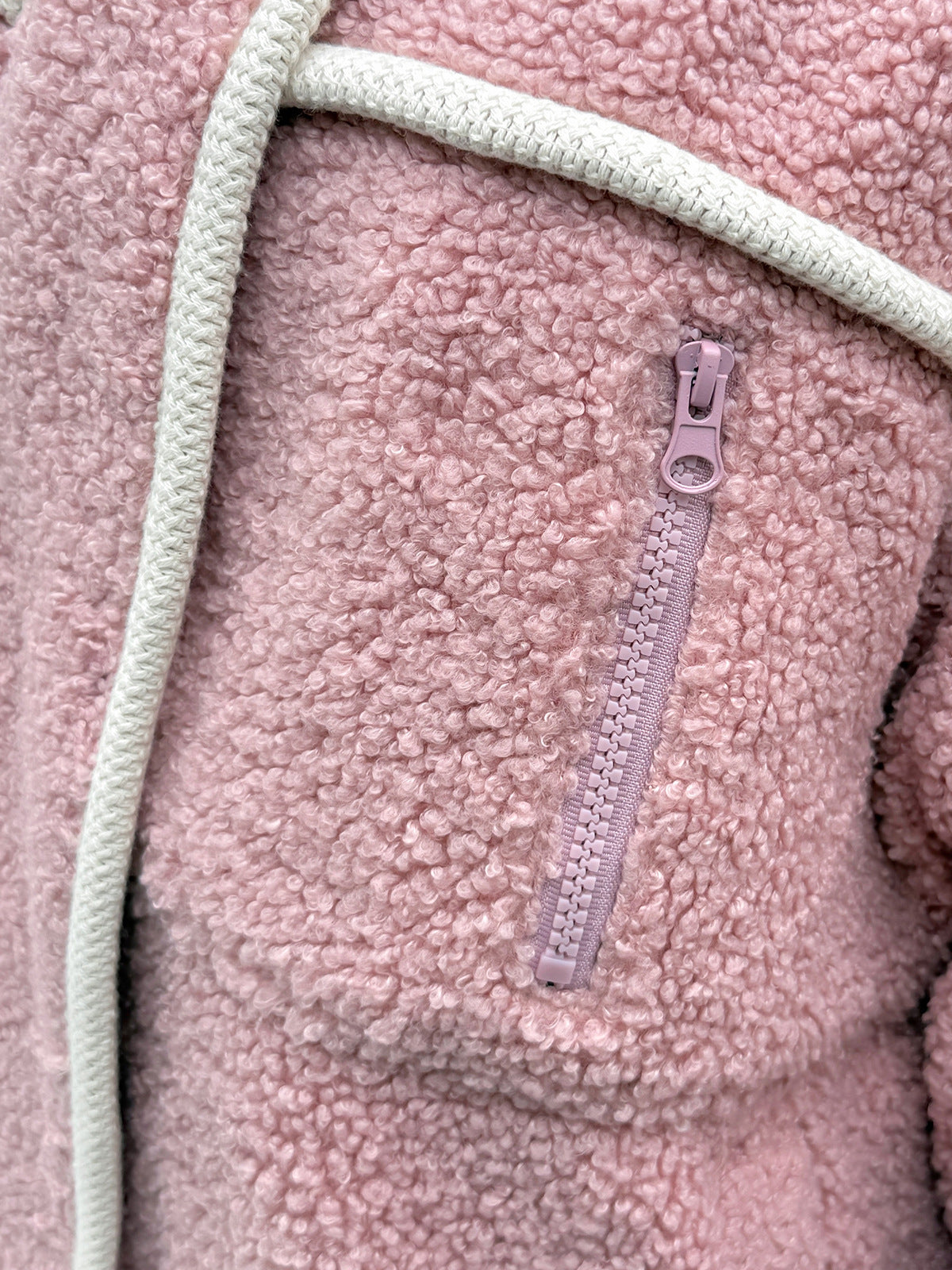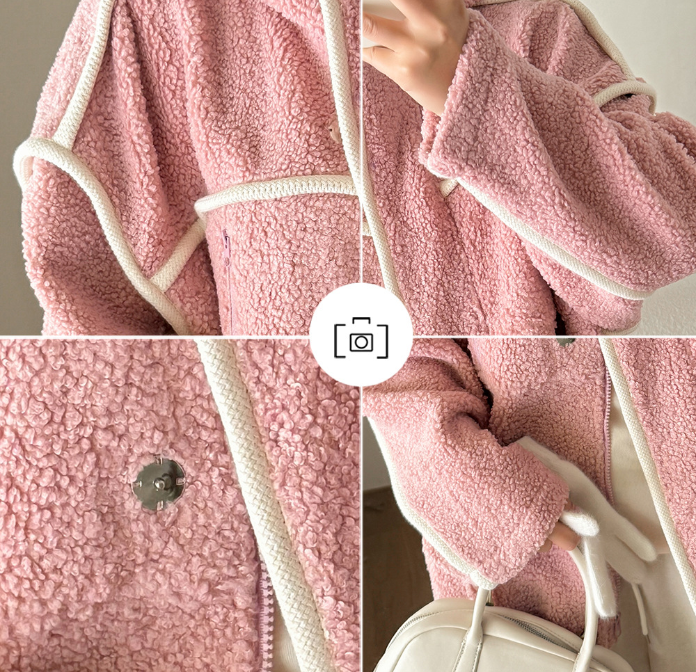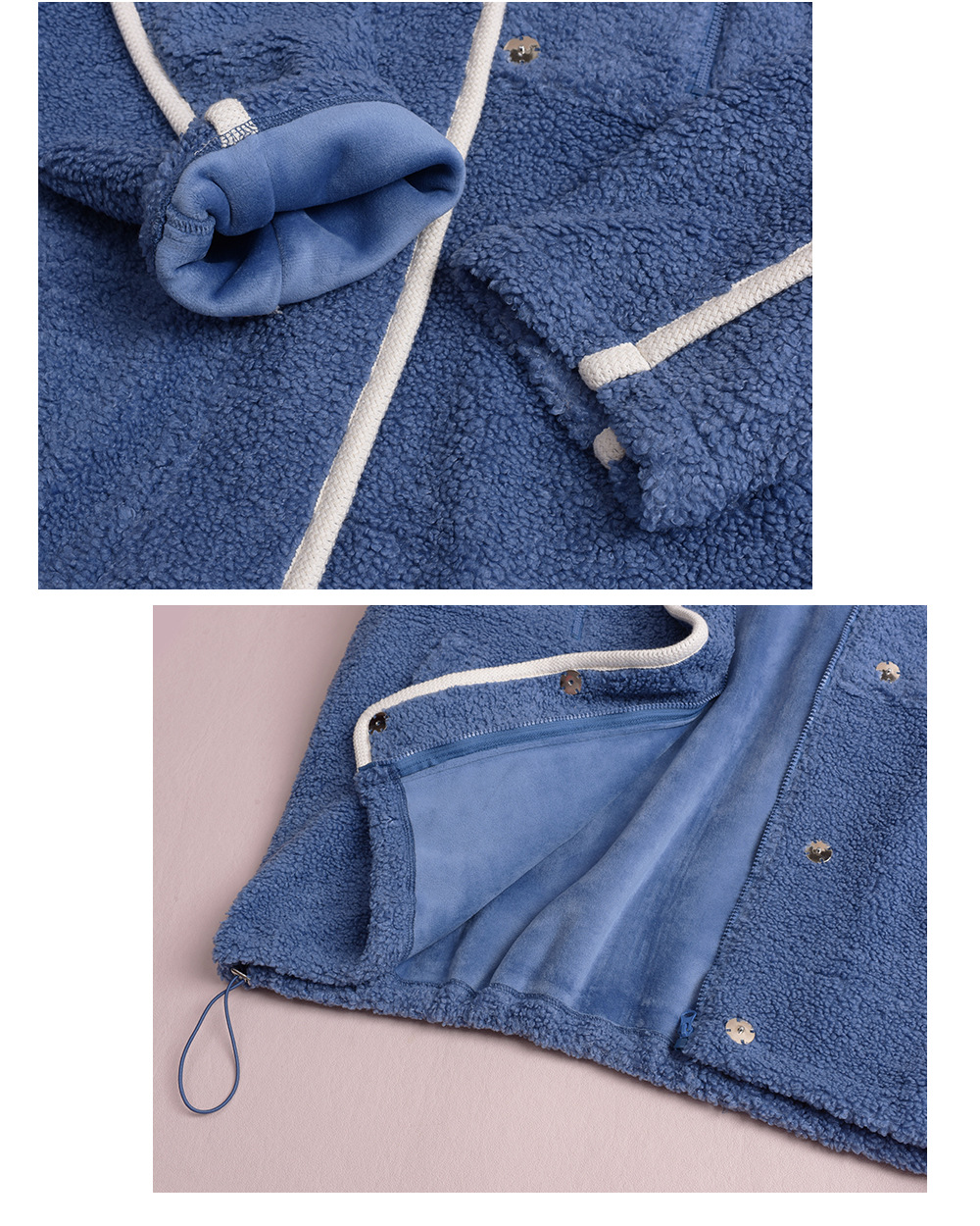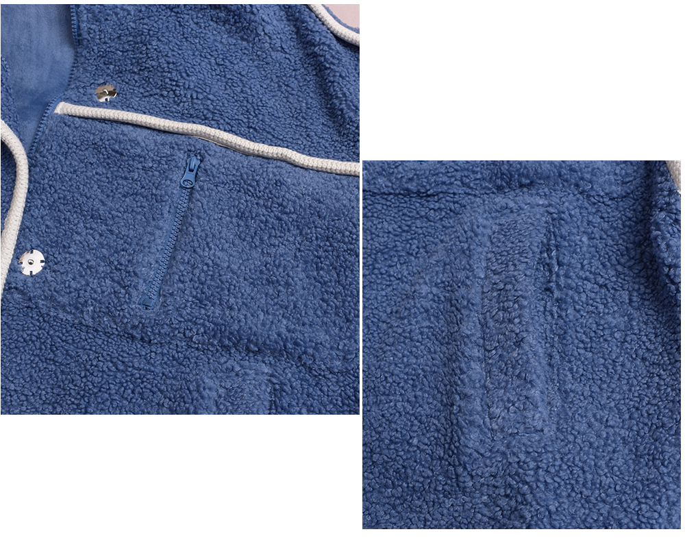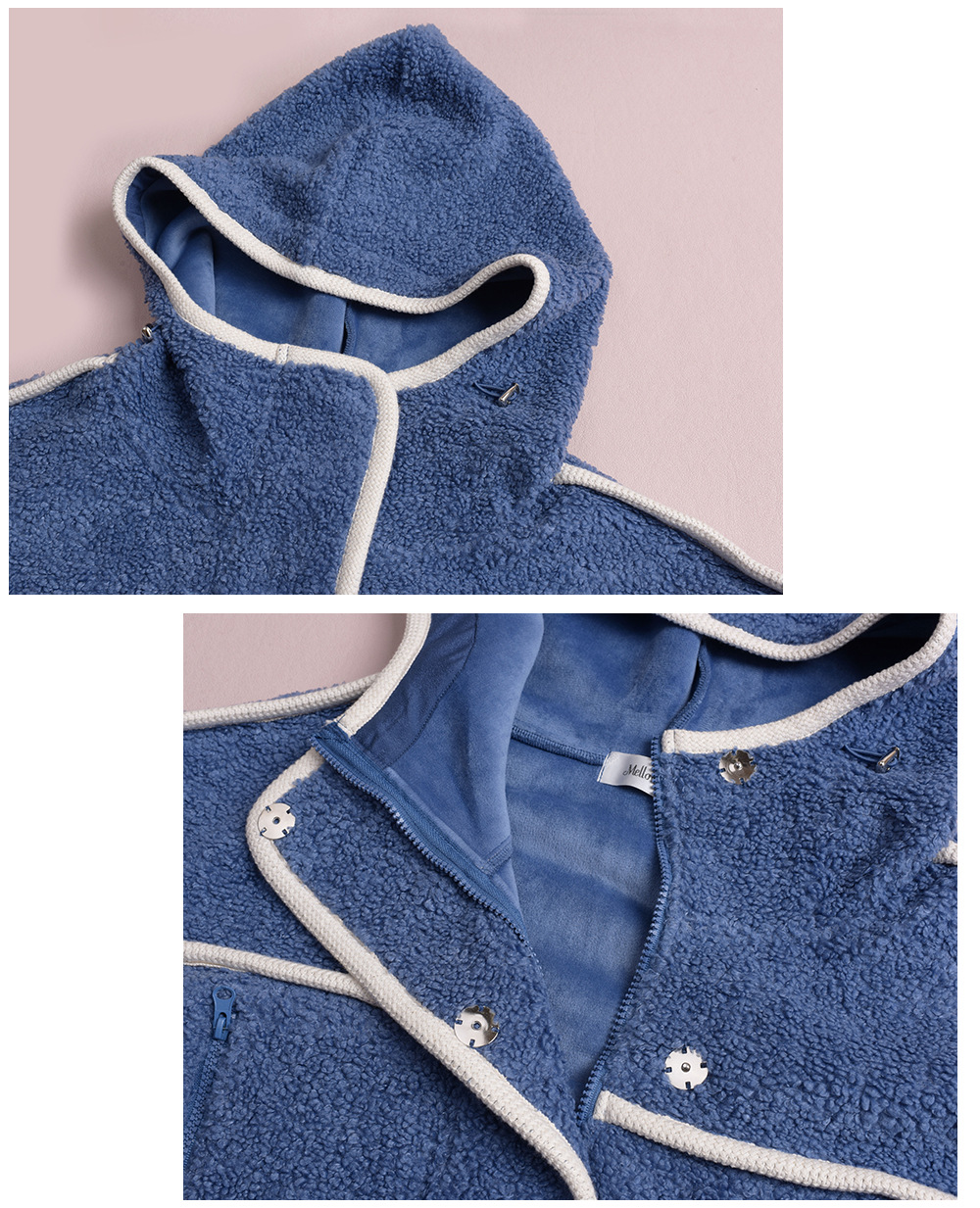 コントラストのあるパイピングデザインのボアフリースジャケット。立体的で明瞭なカットラインを使用して、個性とオーラを強調します。内側と外側の起毛が粗く細かい、厚手のウールテリー風複合超ソフト生地で作られています。フード付きのデザインと高めの襟が冷たい風を遮断し、暖かく快適な着心地です。フードには紐が付いています。フロントには金属製のスナップとジッパーが付いており、サイドにはポケットが付いています。裾には調節可能なバックルと、裾周りを調節できるドローストリングが付いています。全体的にゆったりとしたフィット感で、寒い中でも暖かく快適に過ごせます。