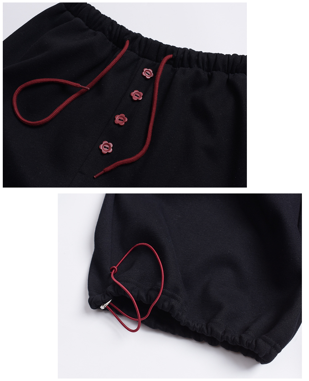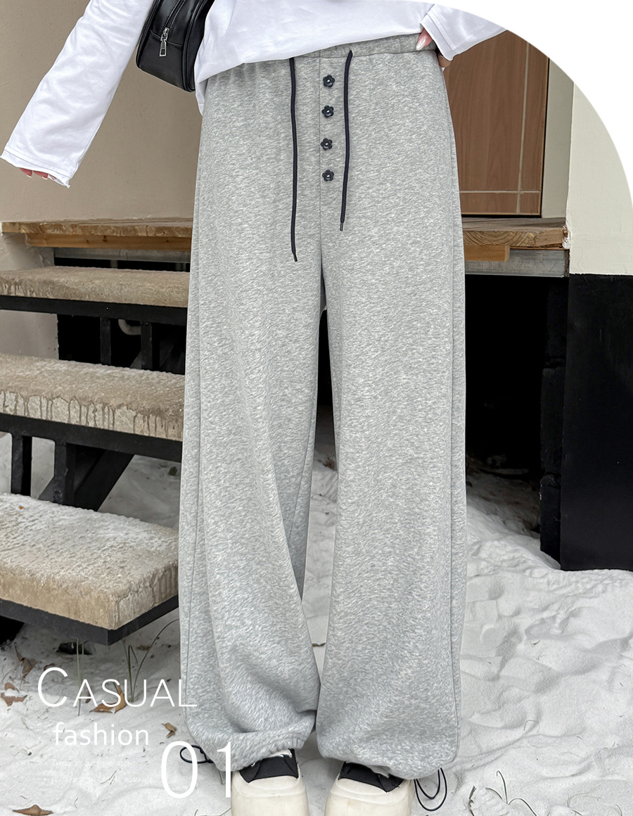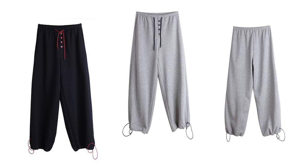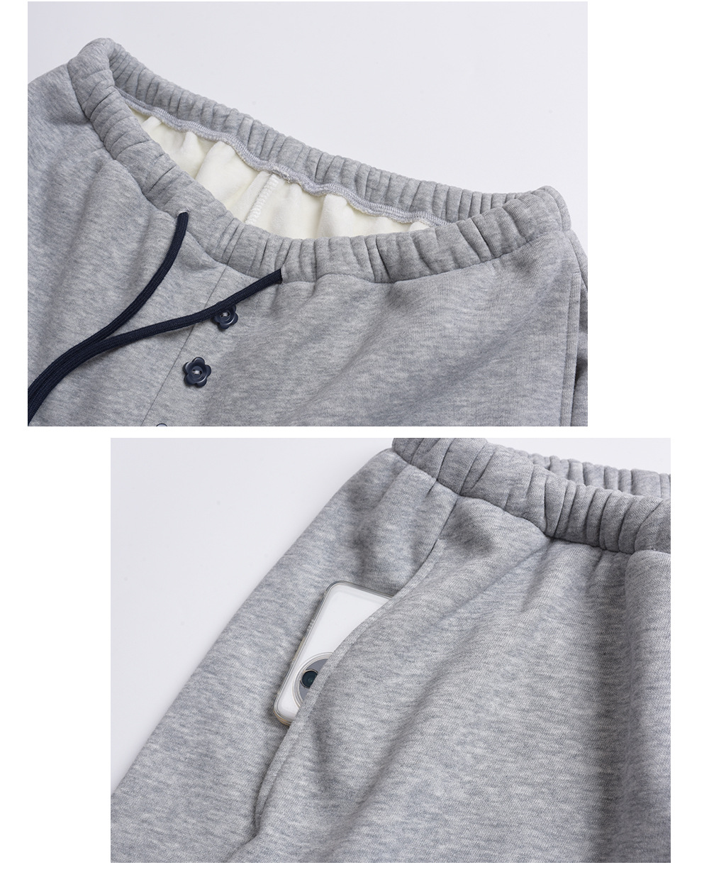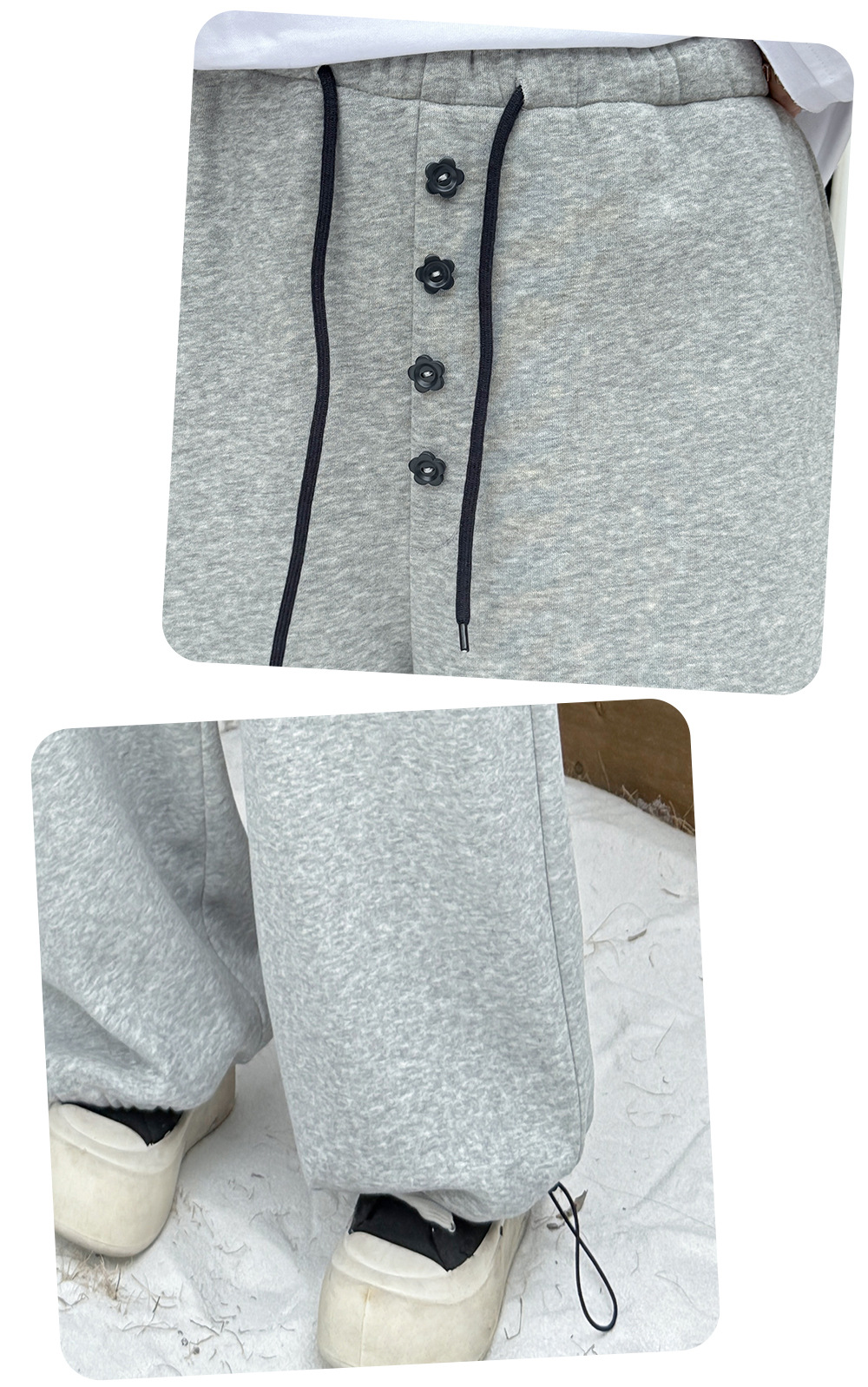 フラワーボタン付きフリース裏地スウェットパンツは、超ソフトな複合ニット生地で、内側には上質な暖かいフリース素材が使用されています。厚みがあり柔らかく、やや弾力があり、暖かい着心地です。ウエストゴムで伸縮性があり、フロント中央に小さな花のボタンで飾られています。ウエストと足首のドローストリングが同じ色の組み合わせで、脚口は調整可能です。カジュアルで、フラワーボタンのお洒落なスウェットパンツを是非お試しください。