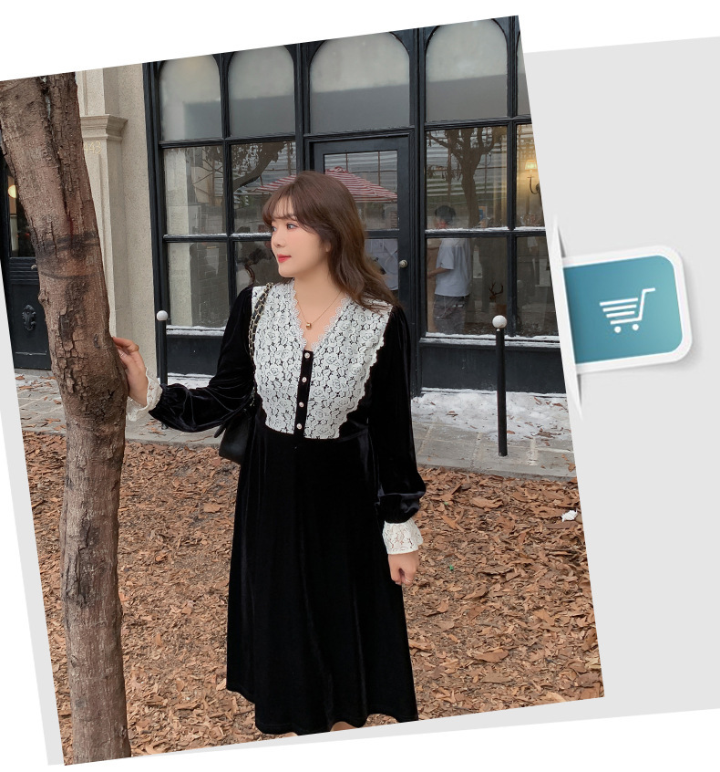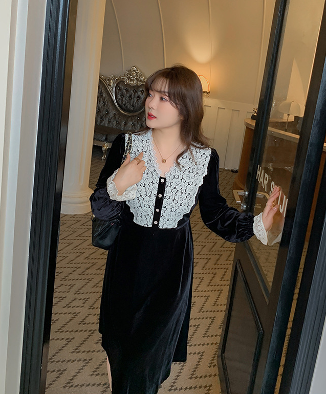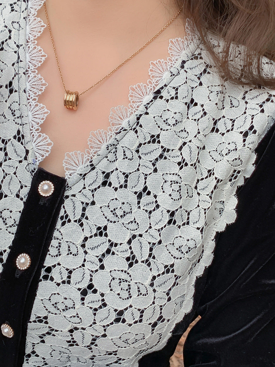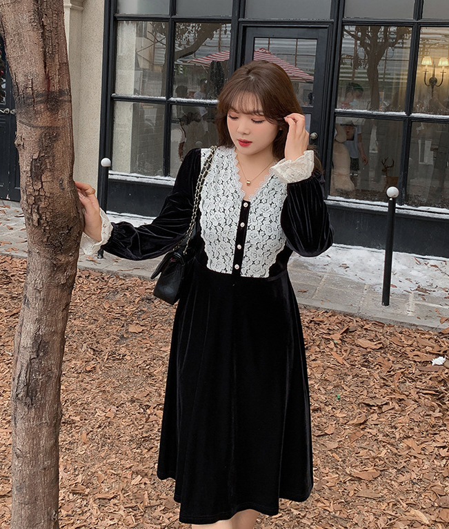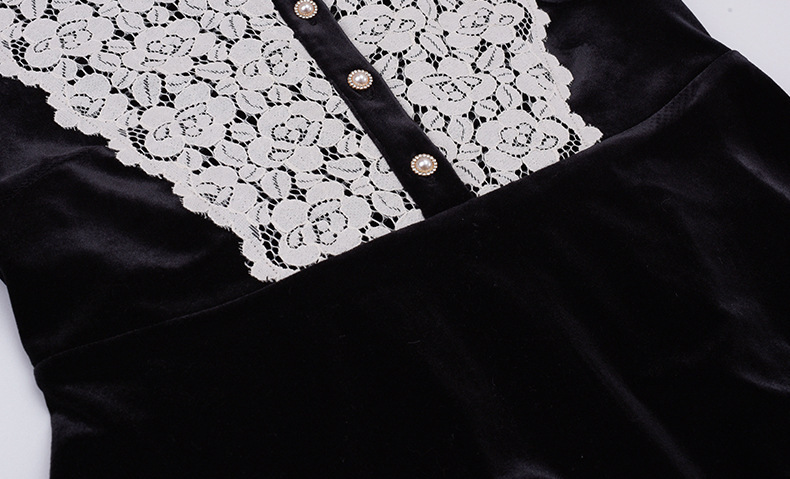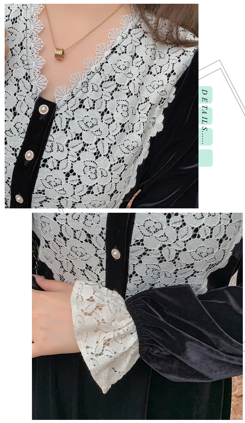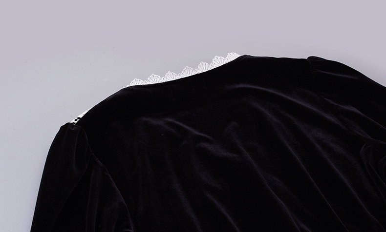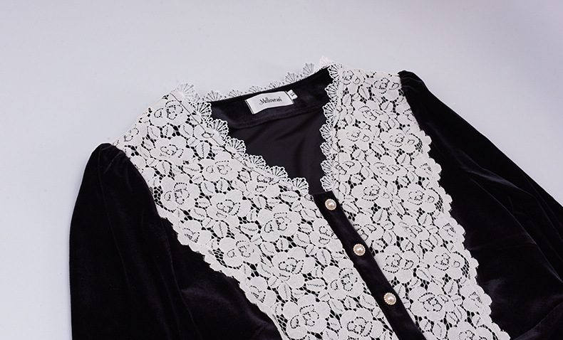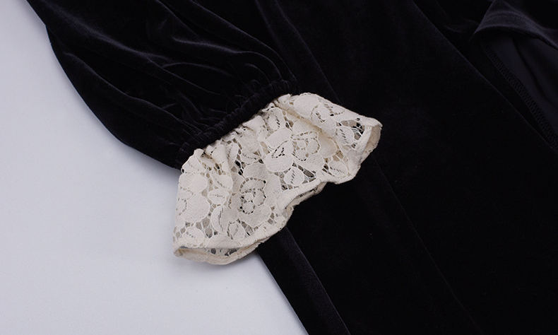 フロントにはベルベットとレースの生地を大胆に組み合わせ、シンプルながらもエレガントでコントラストが強いデザインです。この組み合わせは、洗練されたハイファッションなルックを演出します。ベルベット素材は滑らかで柔らかく、光沢のあるストレッチ性を備えています。Vネックで、フロントは取り外し可能なボタンが付いています。袖口にレース飾りが施され、ゆったりとした袖が特徴です。ウエストを絞り、裾に向かって広がるシルエットで、スタイルアップ効果が期待できます。