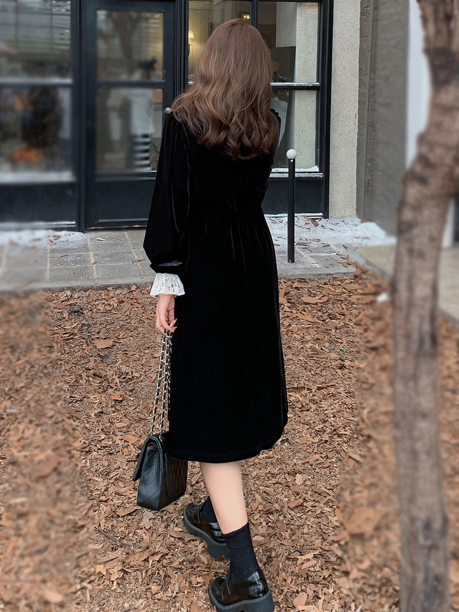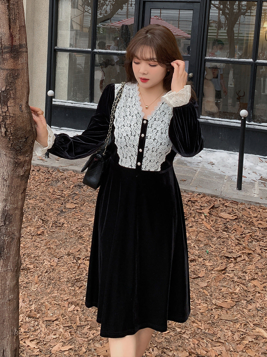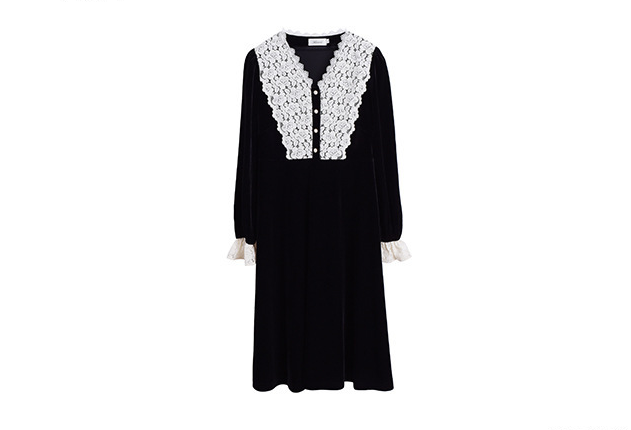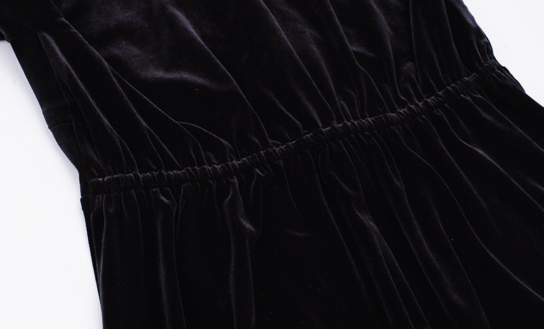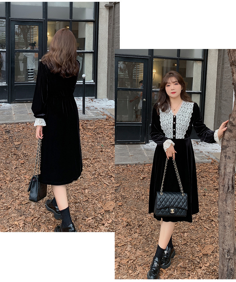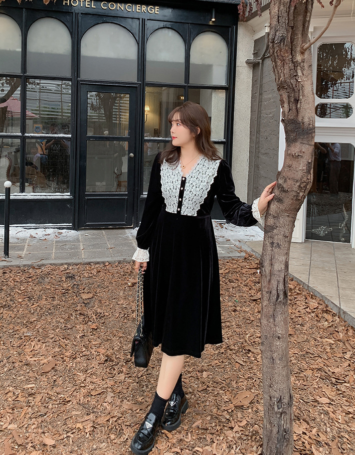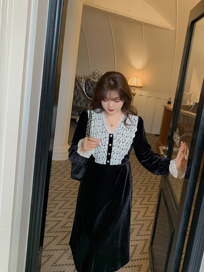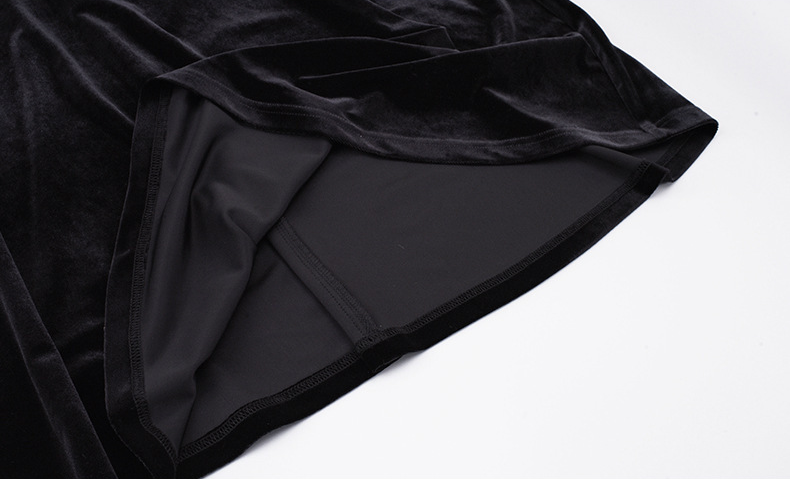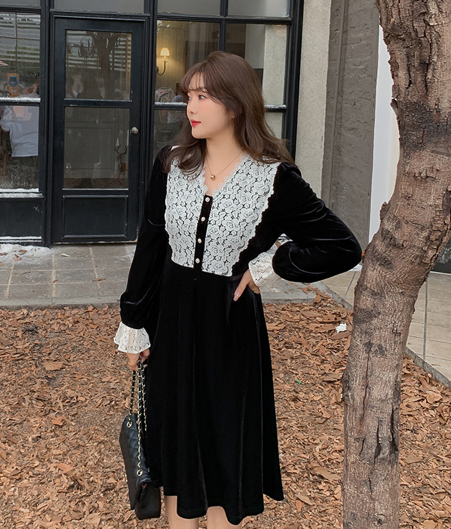 フロントにはベルベットとレースの生地を大胆に組み合わせ、シンプルながらもエレガントでコントラストが強いデザインです。この組み合わせは、洗練されたハイファッションなルックを演出します。ベルベット素材は滑らかで柔らかく、光沢のあるストレッチ性を備えています。Vネックで、フロントは取り外し可能なボタンが付いています。袖口にレース飾りが施され、ゆったりとした袖が特徴です。ウエストを絞り、裾に向かって広がるシルエットで、スタイルアップ効果が期待できます。