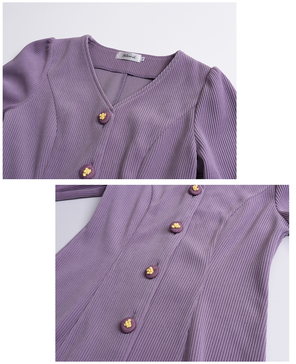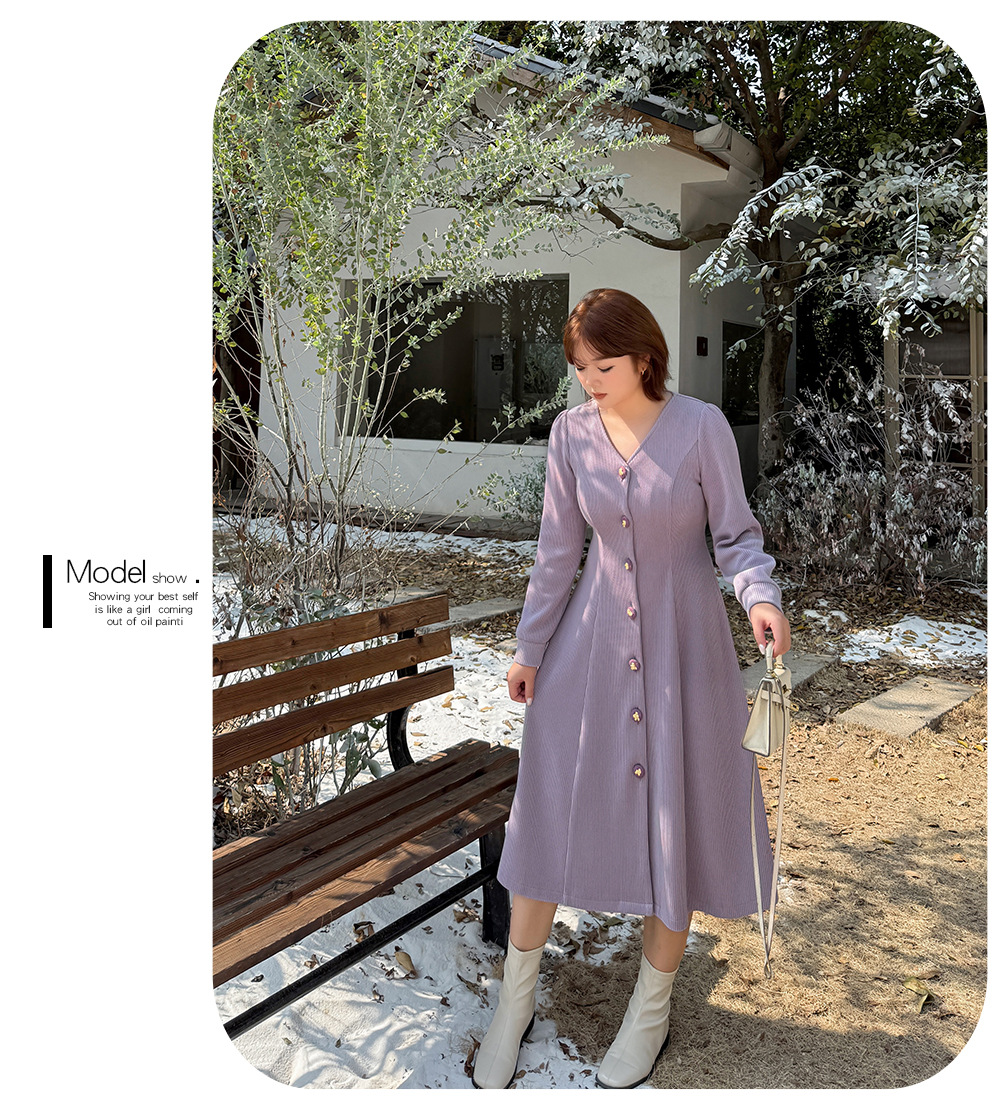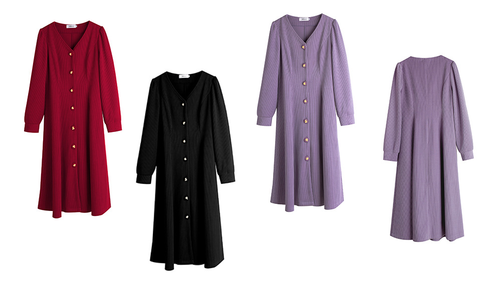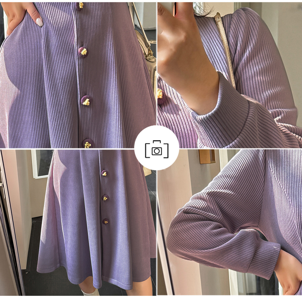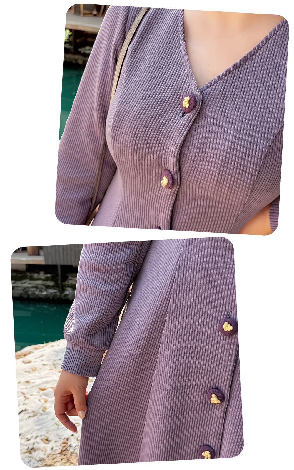 VネックでウエストにフィットしたAラインワンピースは、柔らかくしなやかなリブ編み生地を使用しています。厚手で暖かく、しっかりとした弾力性のある着心地です。小さめのVネックと、花の雄しべのようなフロントボタンのデザインがユニークです。フィットしたウエストとシンプルでエレガントなデザインが、スラリとした優雅なシルエットを保ちます。