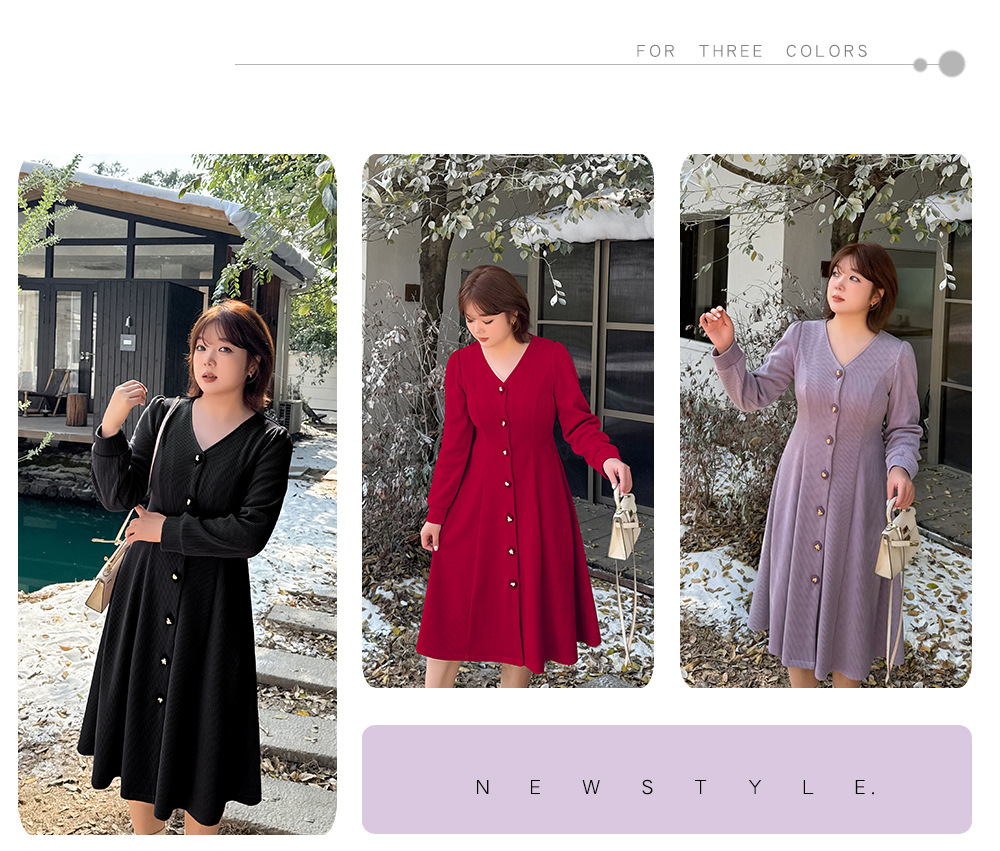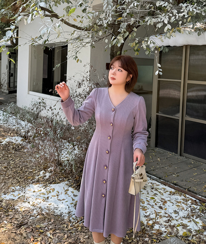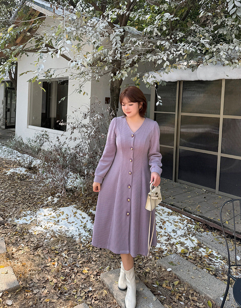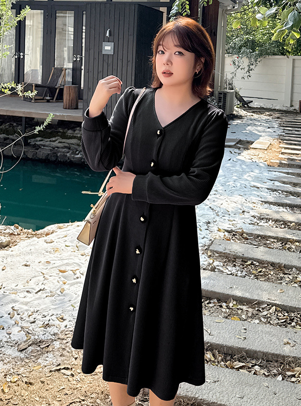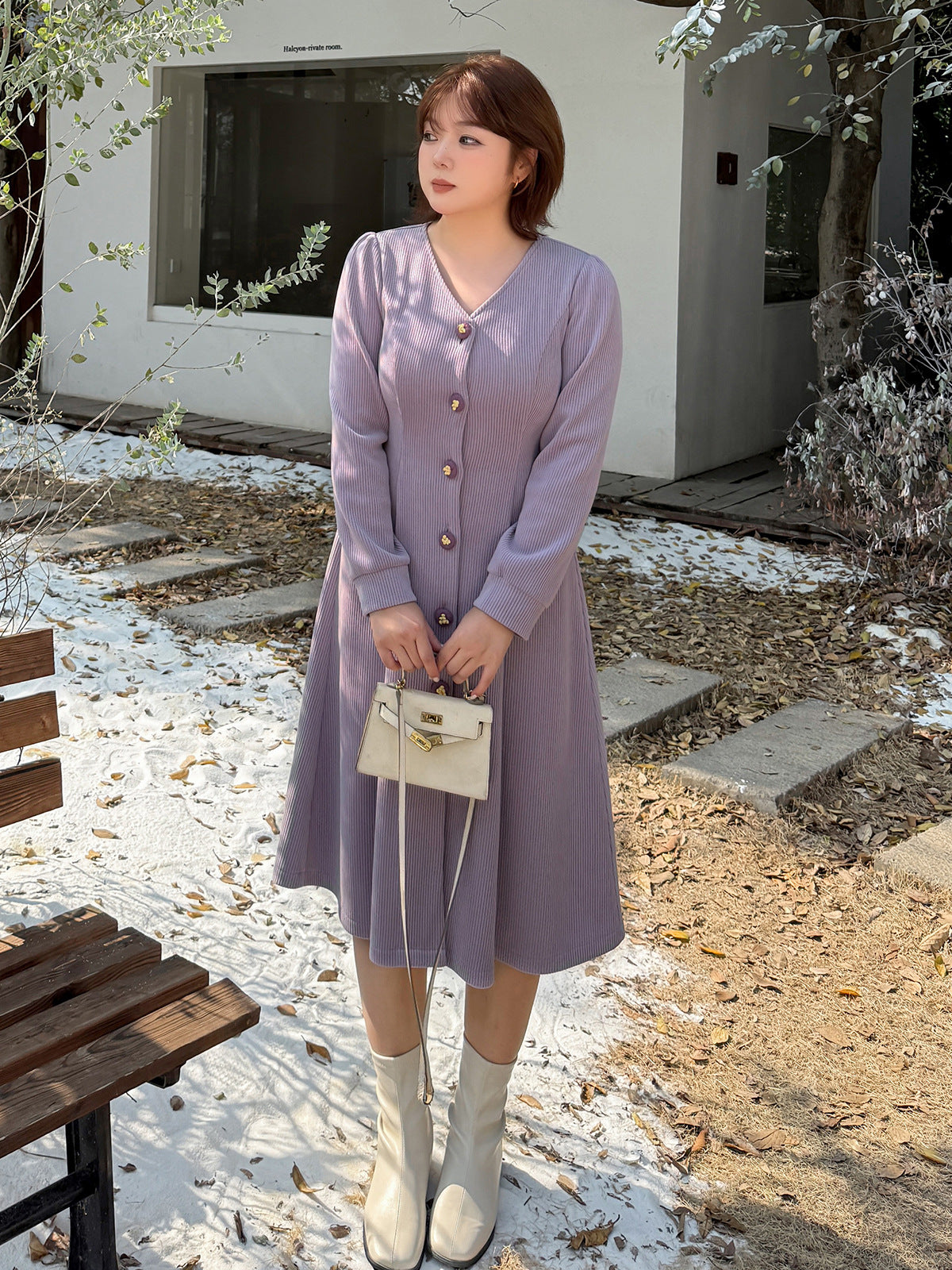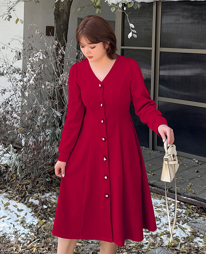 VネックでウエストにフィットしたAラインワンピースは、柔らかくしなやかなリブ編み生地を使用しています。厚手で暖かく、しっかりとした弾力性のある着心地です。小さめのVネックと、花の雄しべのようなフロントボタンのデザインがユニークです。フィットしたウエストとシンプルでエレガントなデザインが、スラリとした優雅なシルエットを保ちます。