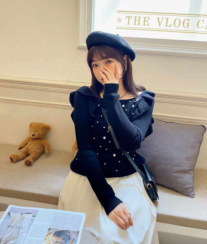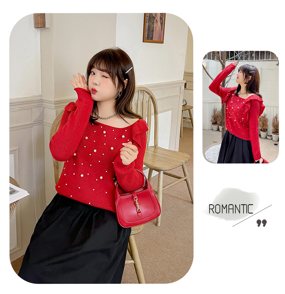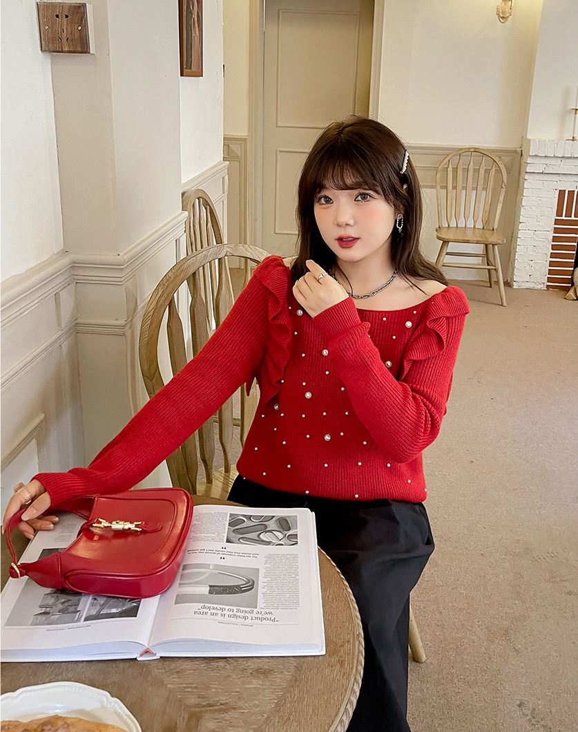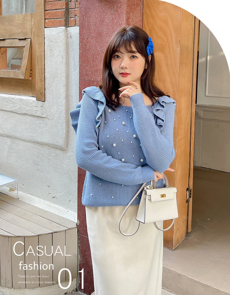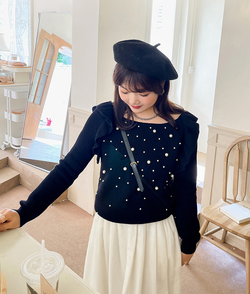細部までこだわり抜いたオフショルダーニットセーター。毛羽立ちにくい加工を施した柔らかなコアスパン糸を使用し、暖かい着心地です。肩にはフリルを、胸元にはビーズをあしらったデザインで、ビーズが落ちにくいのも嬉しいポイントです。裾に向かって細くなるデザインで、ゆったりとしたシルエットとストレッチ性があり、スカートにもパンツにも合わせやすいアイテムです。