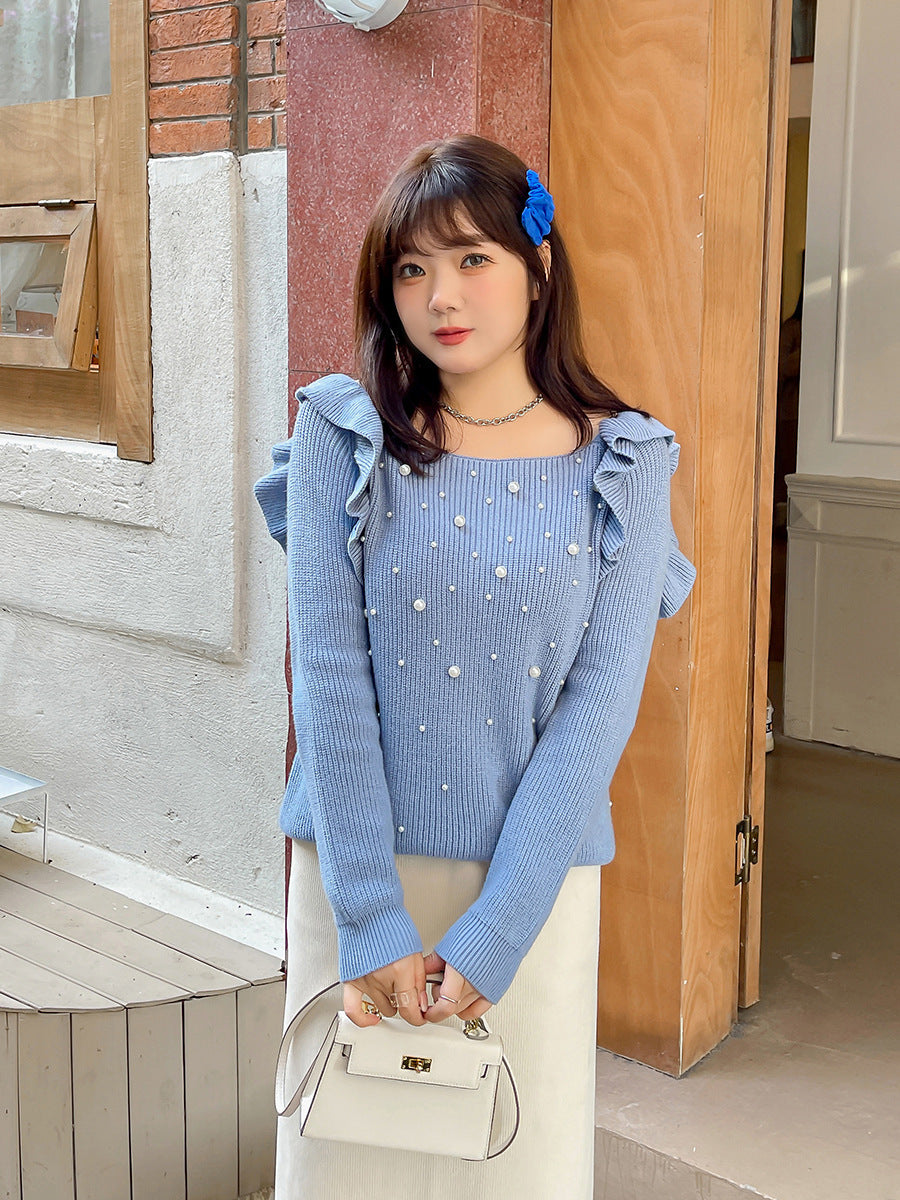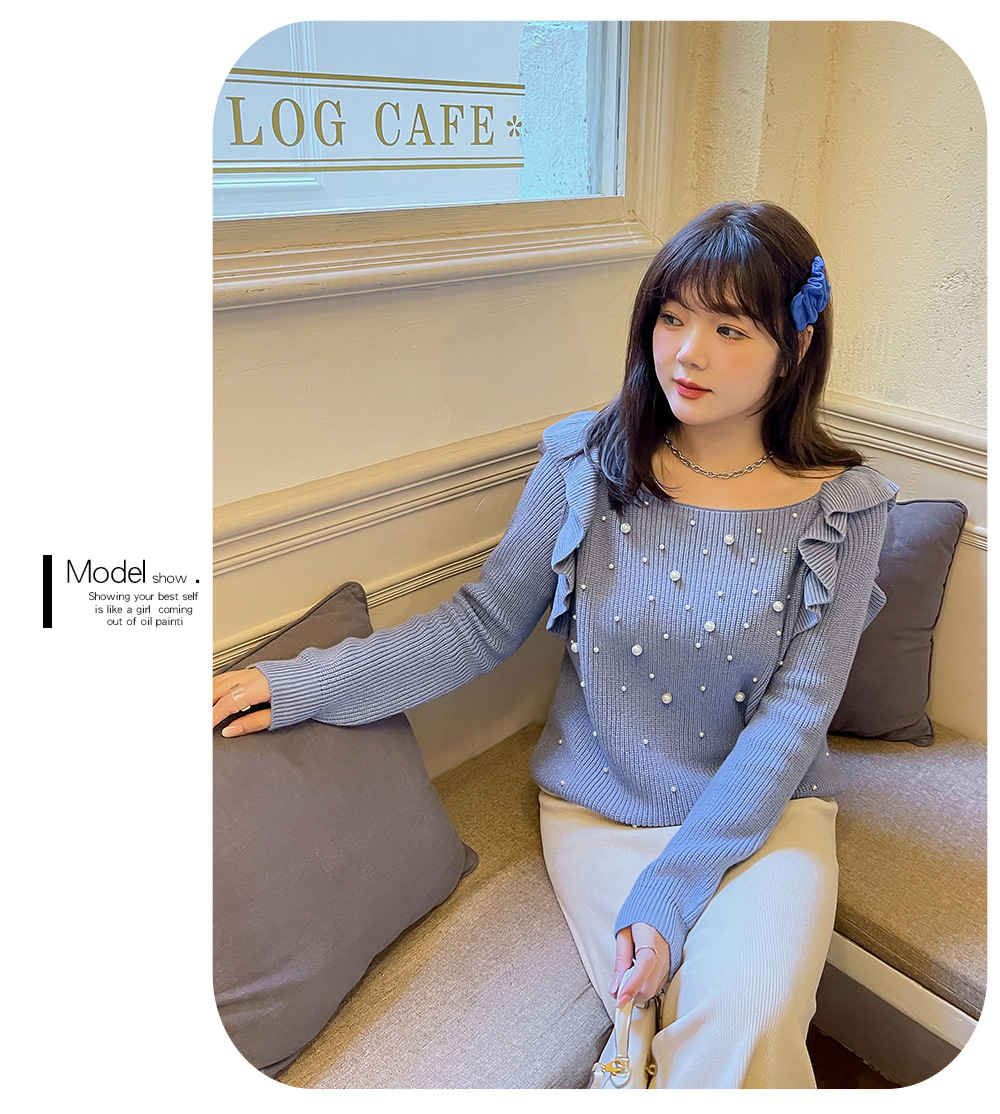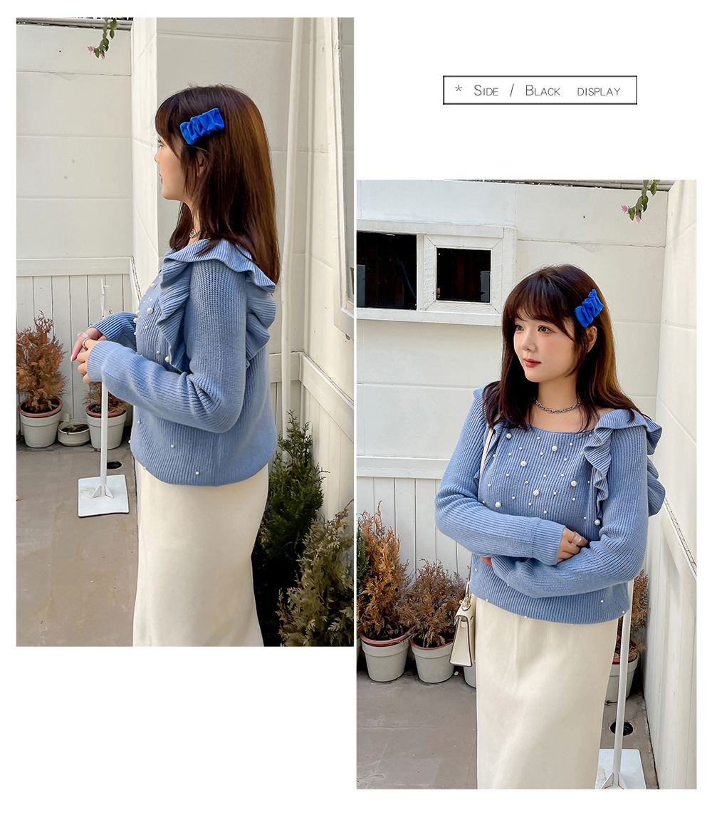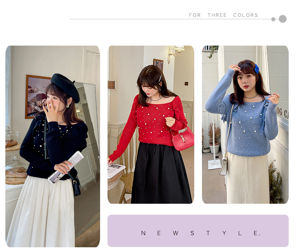 細部までこだわり抜いたオフショルダーニットセーター。毛羽立ちにくい加工を施した柔らかなコアスパン糸を使用し、暖かい着心地です。肩にはフリルを、胸元にはビーズをあしらったデザインで、ビーズが落ちにくいのも嬉しいポイントです。裾に向かって細くなるデザインで、ゆったりとしたシルエットとストレッチ性があり、スカートにもパンツにも合わせやすいアイテムです。