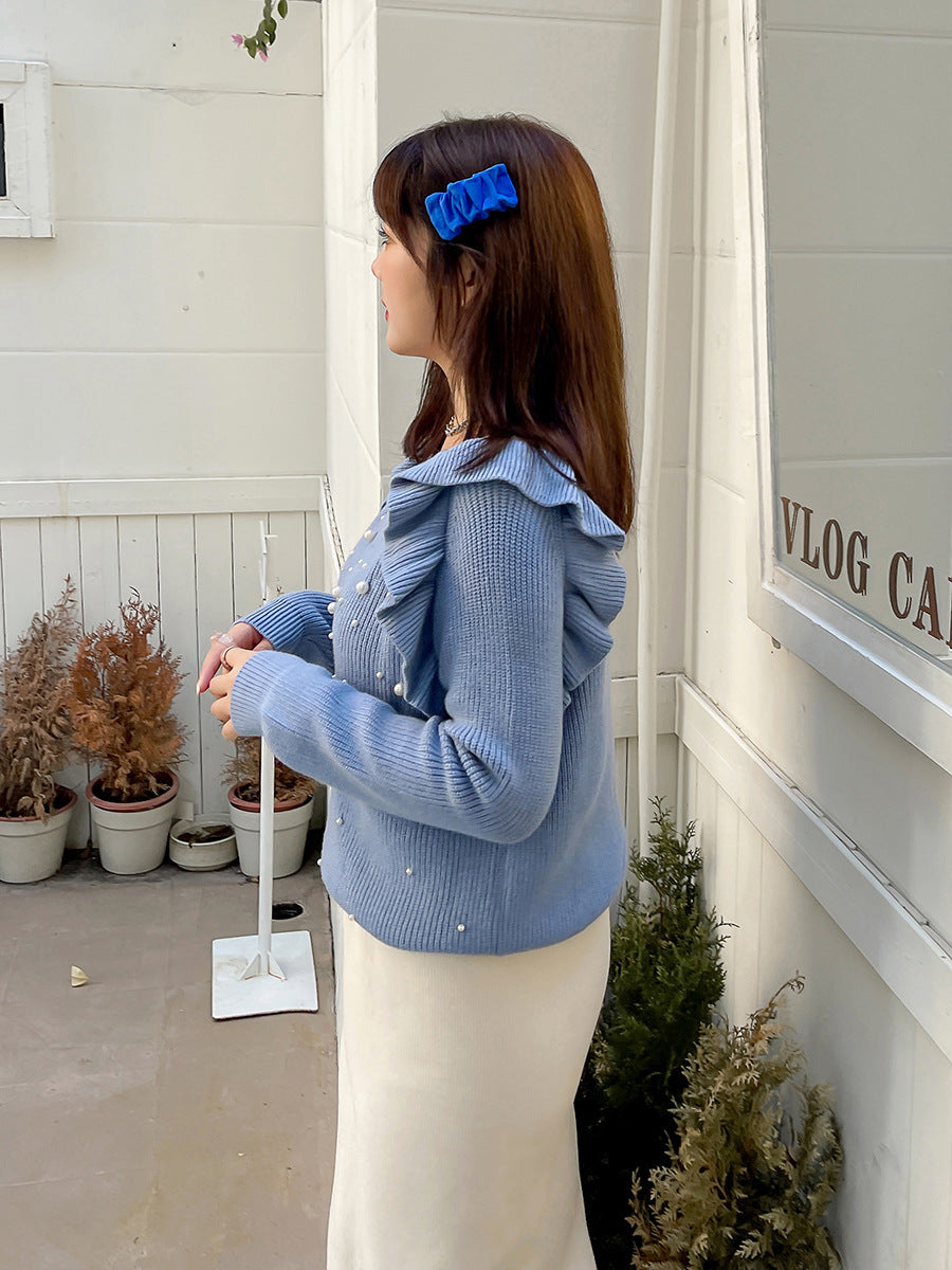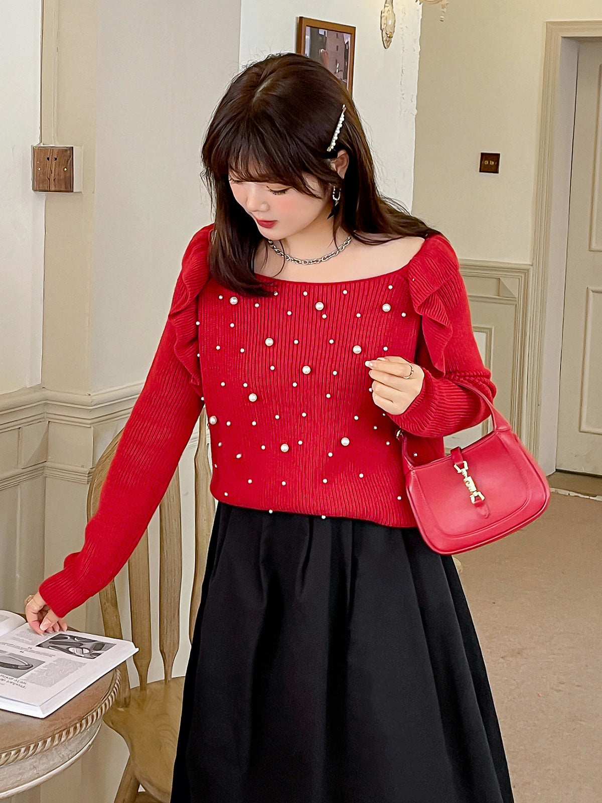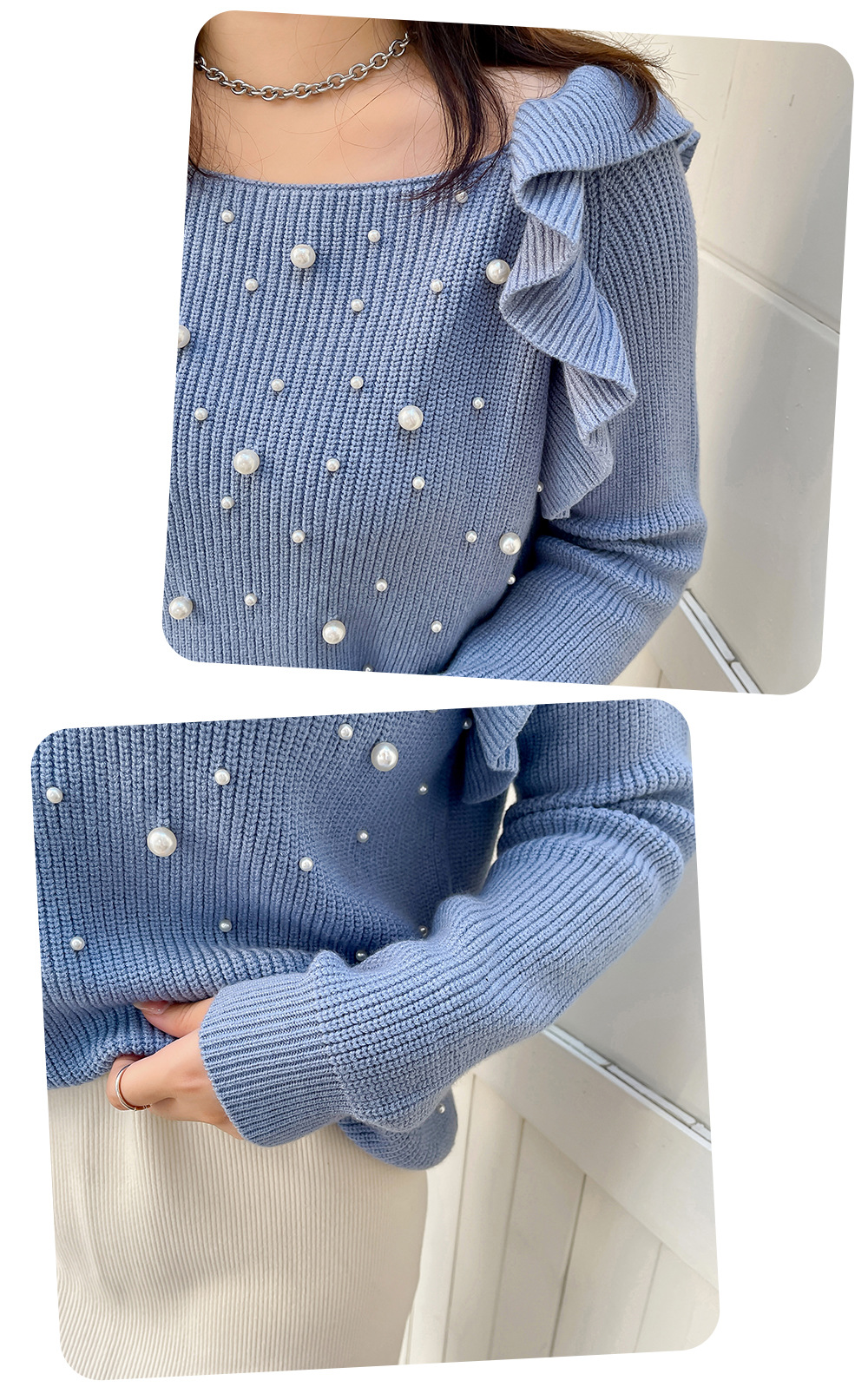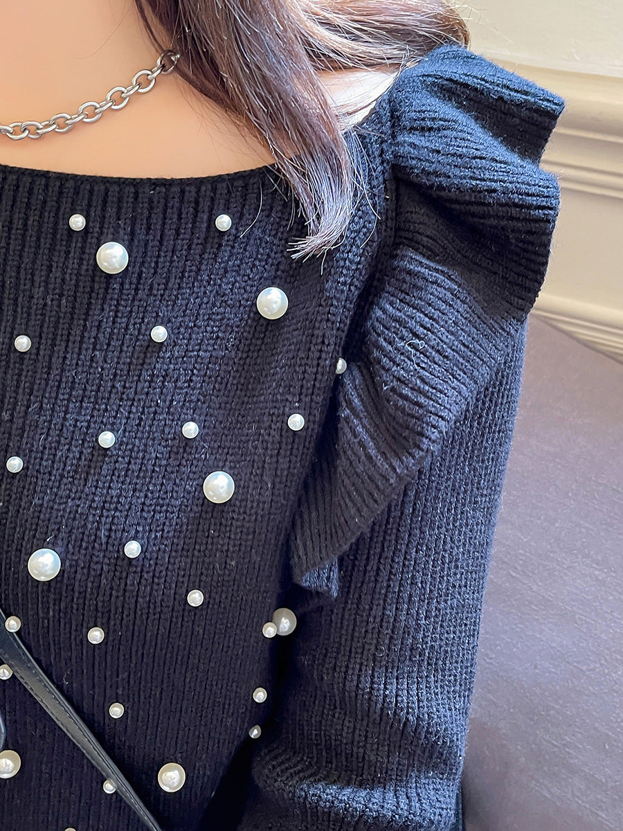 細部までこだわり抜いたオフショルダーニットセーター。毛羽立ちにくい加工を施した柔らかなコアスパン糸を使用し、暖かい着心地です。肩にはフリルを、胸元にはビーズをあしらったデザインで、ビーズが落ちにくいのも嬉しいポイントです。裾に向かって細くなるデザインで、ゆったりとしたシルエットとストレッチ性があり、スカートにもパンツにも合わせやすいアイテムです。
