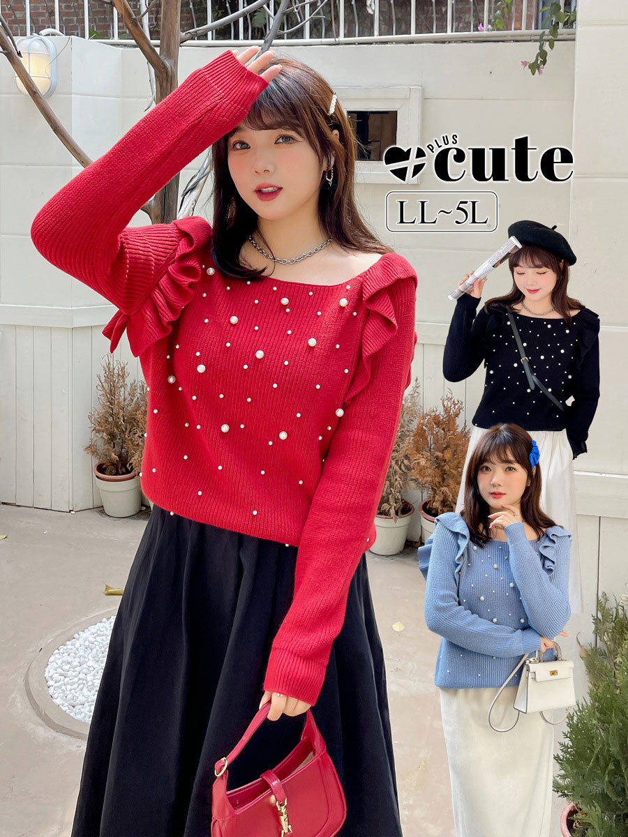 大きいサイズ レディース ビーズフリルオフショルダーニットセーター LL 3L 4L 5L