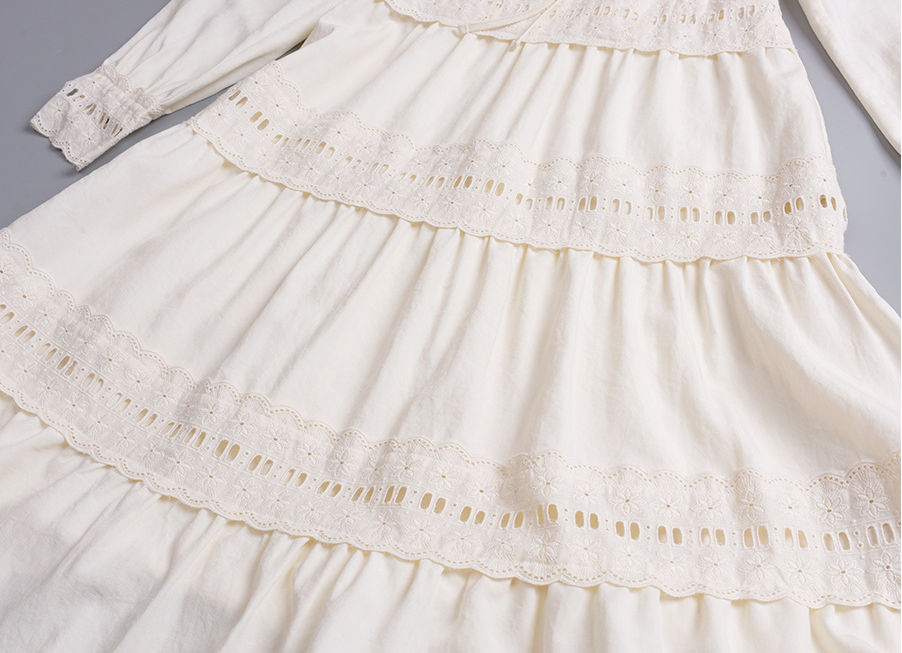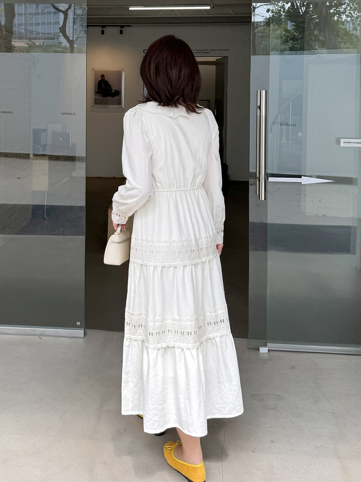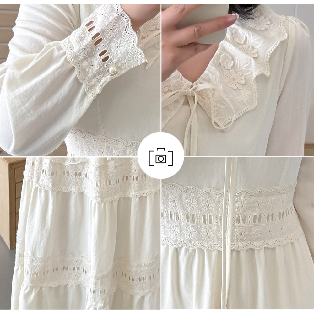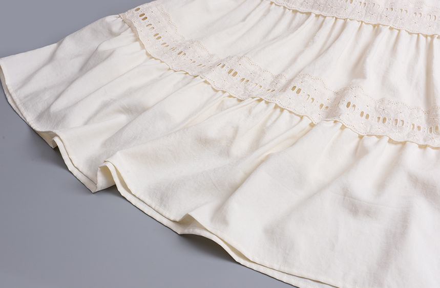 スカート部分は透かし彫りのジャカードレースを使った3段ティアードデザイン。それぞれの層がふんわりと重なり合い、歩くたびに優雅に揺れる流れるようなシルエットを演出します。リゾートやお出かけ、ちょっと特別な日のお散歩など、ロマンチックな気分を楽しみたい日にぴったりの一着です。