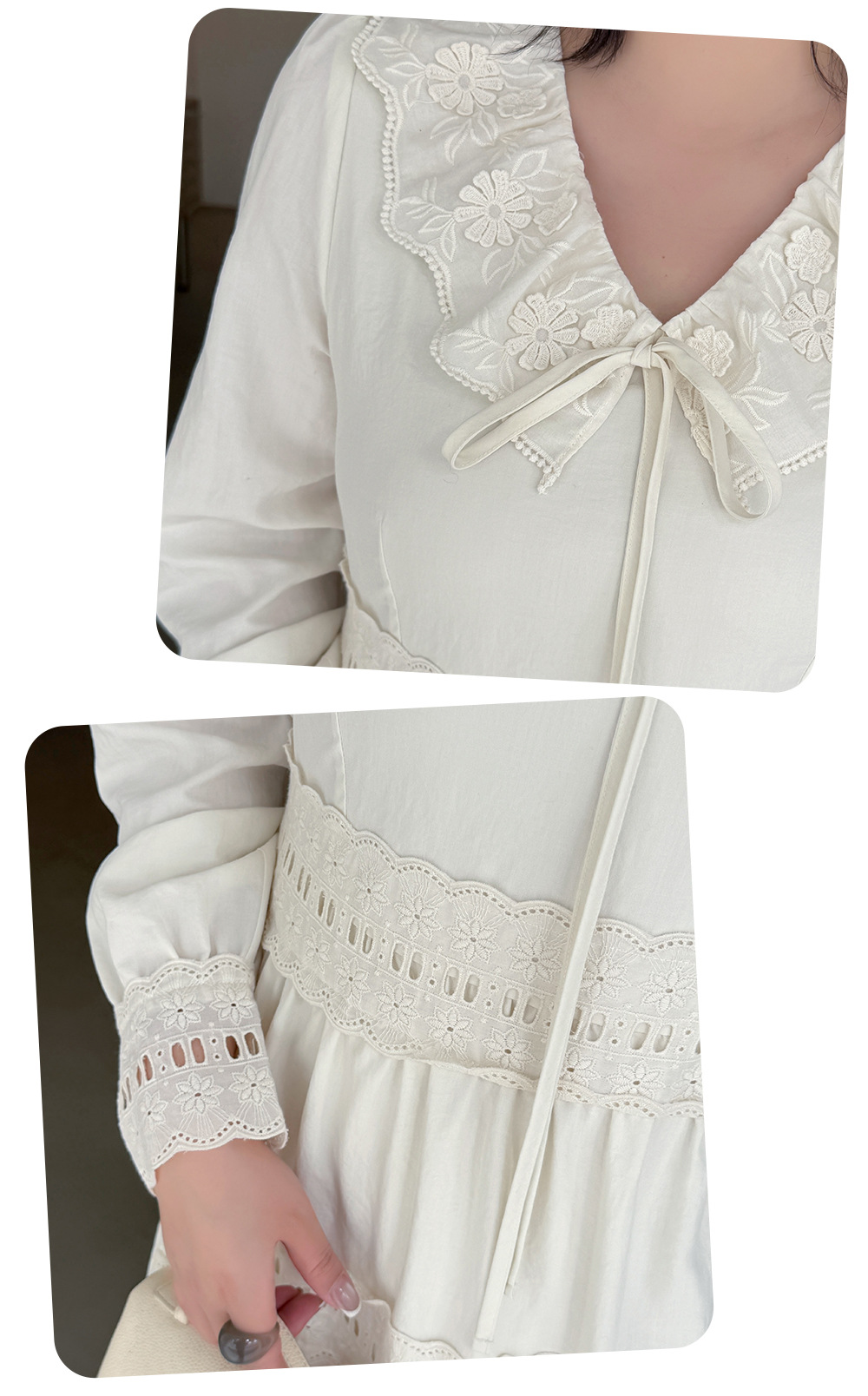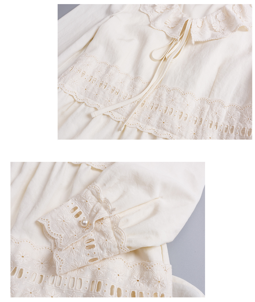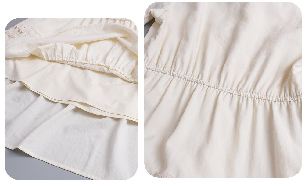 スカート部分は透かし彫りのジャカードレースを使った3段ティアードデザイン。それぞれの層がふんわりと重なり合い、歩くたびに優雅に揺れる流れるようなシルエットを演出します。リゾートやお出かけ、ちょっと特別な日のお散歩など、ロマンチックな気分を楽しみたい日にぴったりの一着です。