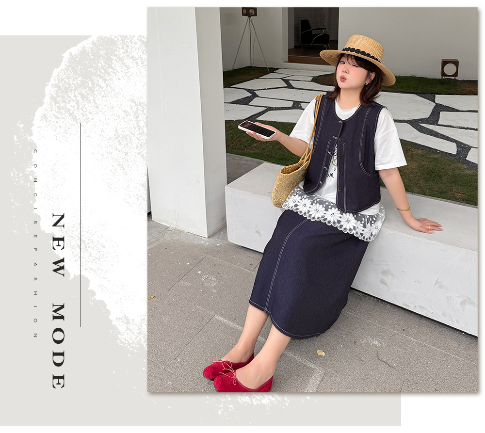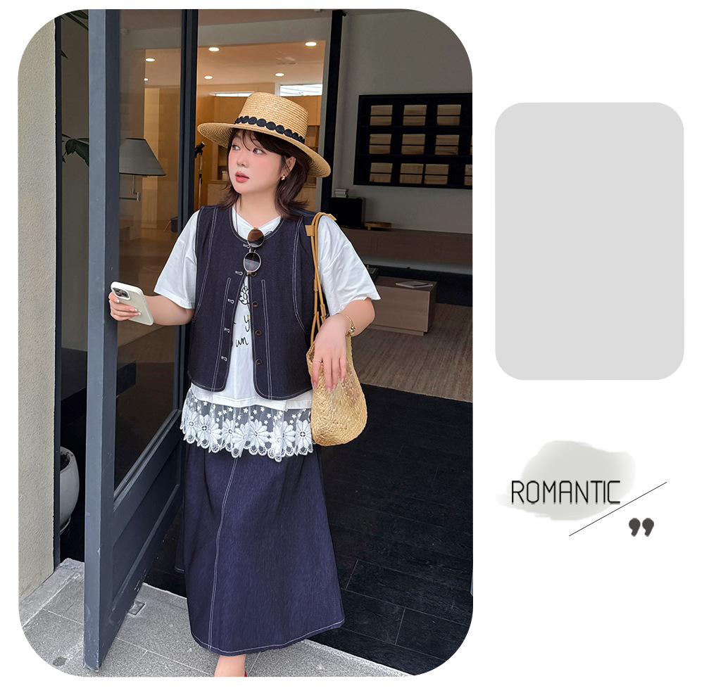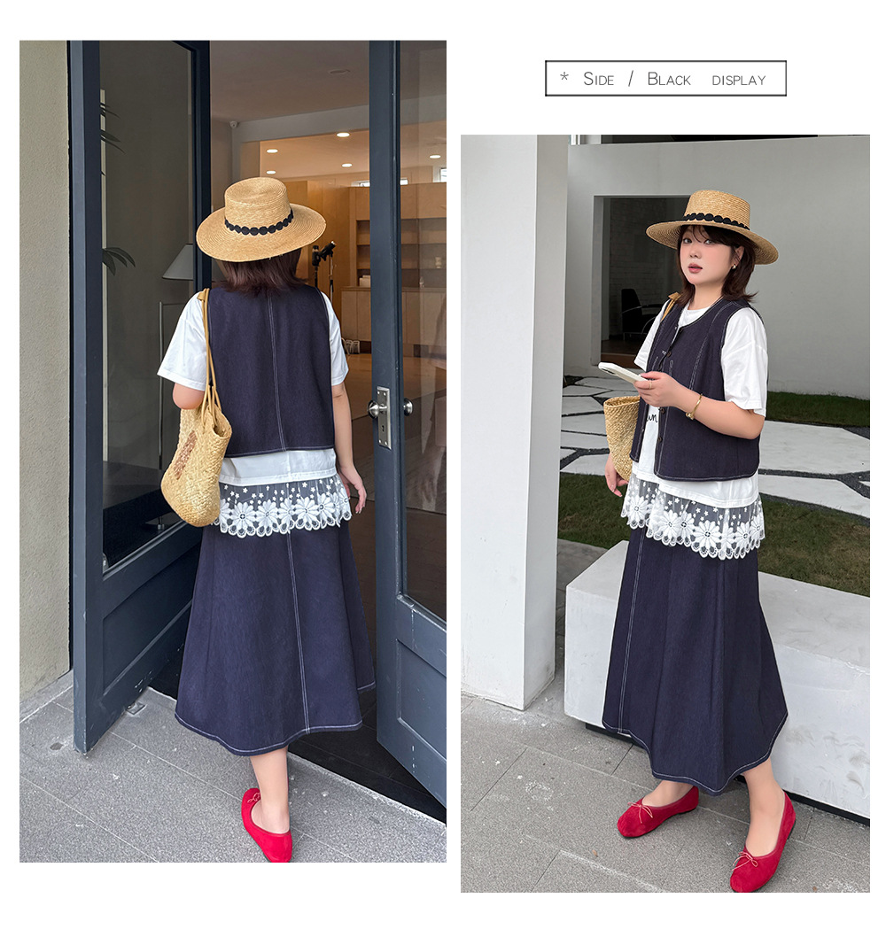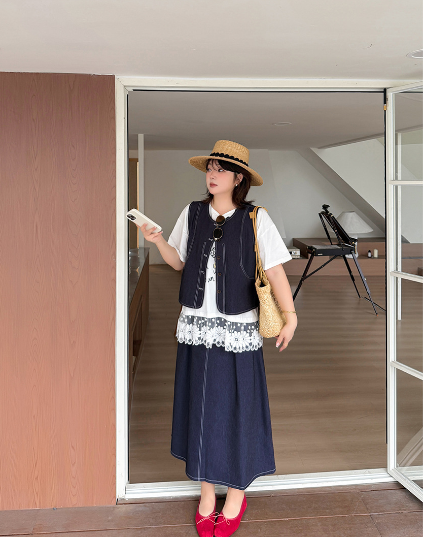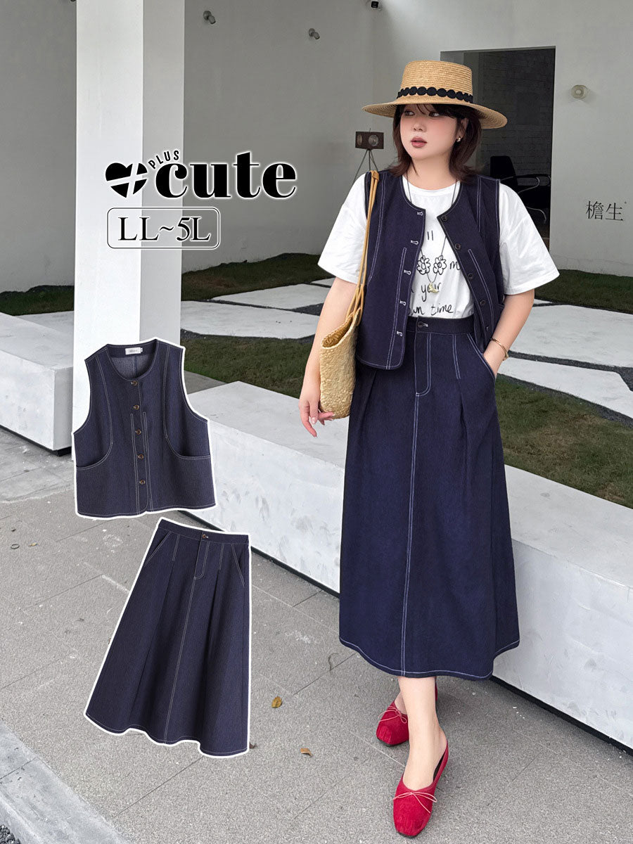 大きいサイズ レディース セットアップ(フェイクデニムステッチベスト+スカート) LL 3L 4L 5L