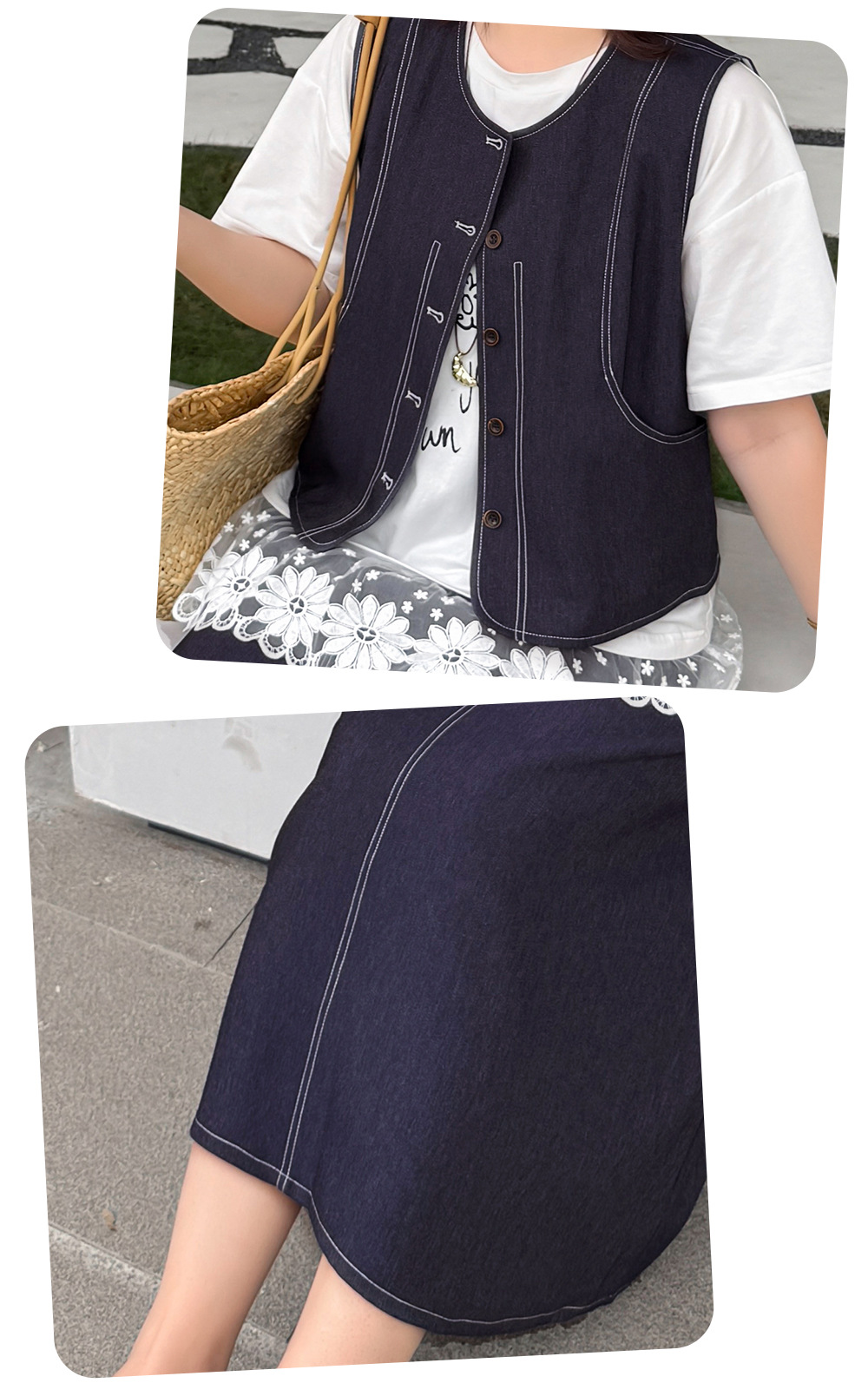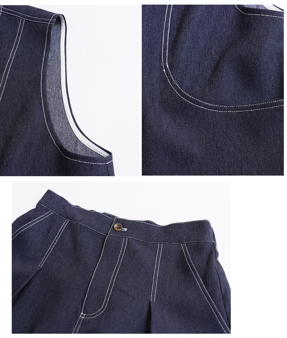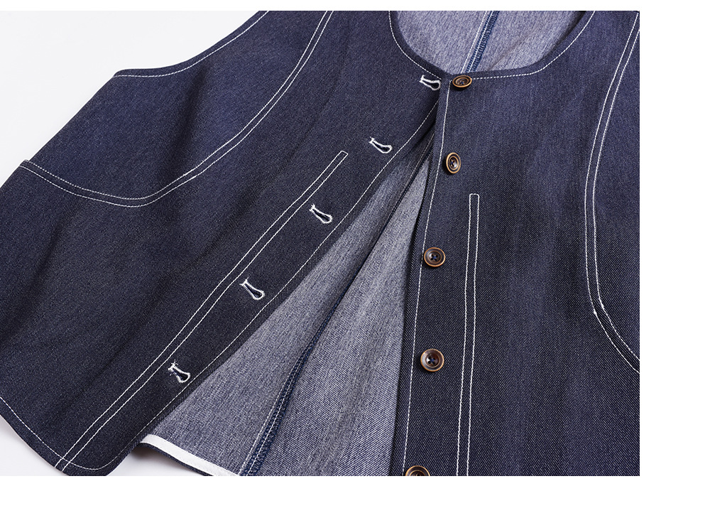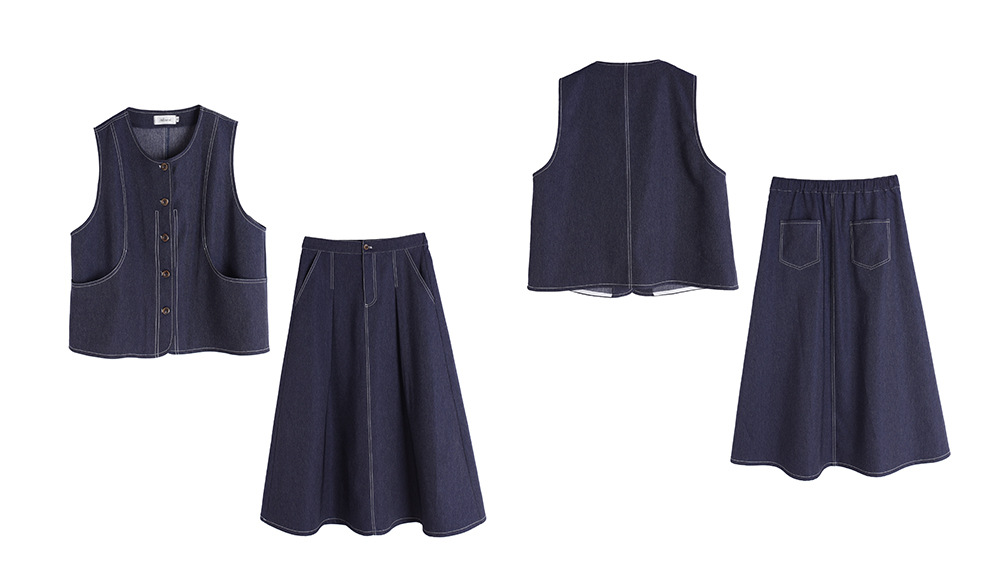 レトロスタイルのフェイクデニムベストとスカートのセットは、柔らかく肌触りの良いフェイクデニム生地を使用しており、程よい伸縮性と美しいドレープが特徴です。ベストはすっきりとしたシンプルなシルエットで、ステッチがラインを際立たせ、ワークウェアらしいタフな雰囲気を演出しています。フロント中央のボタンは留め具の有無を選択でき、両サイドの大きくてカーブしたポケットは、実用性と美しさを兼ね備えています。同系色のハイウエストAラインスカート。ウエスト部分にボタンとファスナー付きです。フロントのプリーツがウエストを美しく見せ、サイドポケットも付いています。ステッチが目立つウエストゴム部分はベストのディテールと合わせ、若々しい雰囲気を演出します。いろいろなコーディネートをお楽しみください。