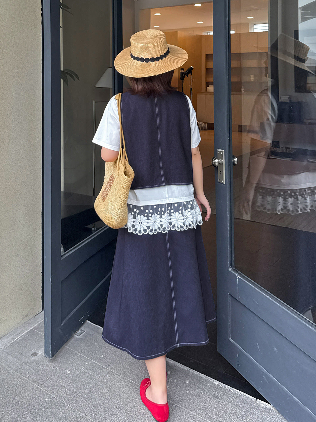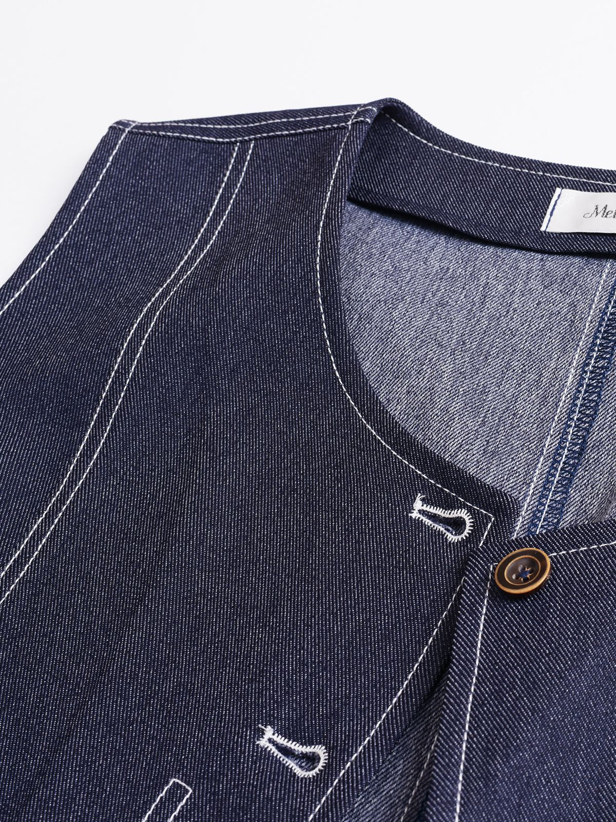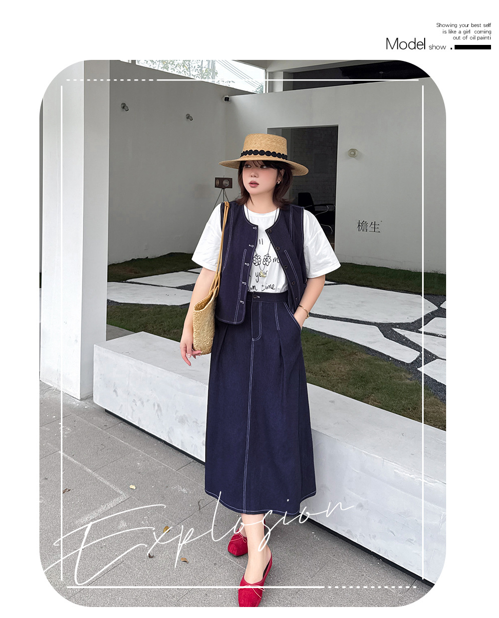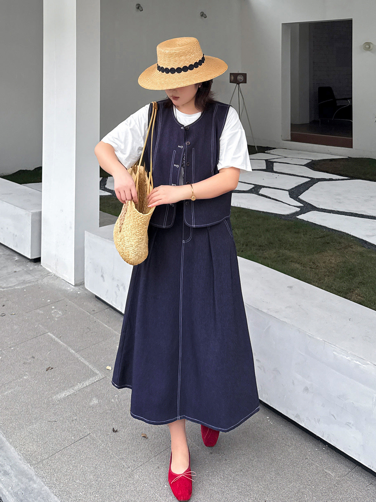 レトロスタイルのフェイクデニムベストとスカートのセットは、柔らかく肌触りの良いフェイクデニム生地を使用しており、程よい伸縮性と美しいドレープが特徴です。ベストはすっきりとしたシンプルなシルエットで、ステッチがラインを際立たせ、ワークウェアらしいタフな雰囲気を演出しています。フロント中央のボタンは留め具の有無を選択でき、両サイドの大きくてカーブしたポケットは、実用性と美しさを兼ね備えています。同系色のハイウエストAラインスカート。ウエスト部分にボタンとファスナー付きです。フロントのプリーツがウエストを美しく見せ、サイドポケットも付いています。ステッチが目立つウエストゴム部分はベストのディテールと合わせ、若々しい雰囲気を演出します。いろいろなコーディネートをお楽しみください。