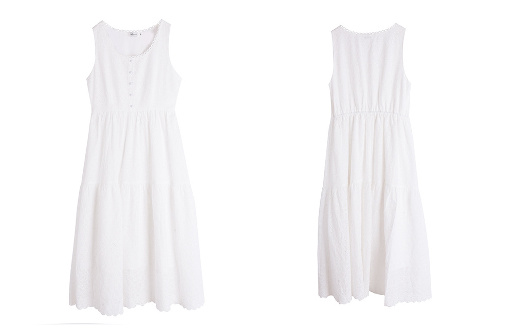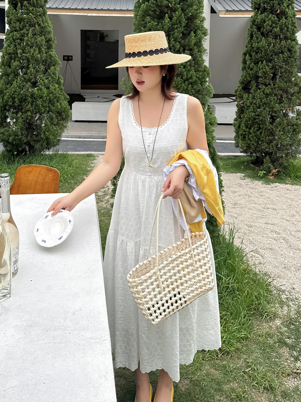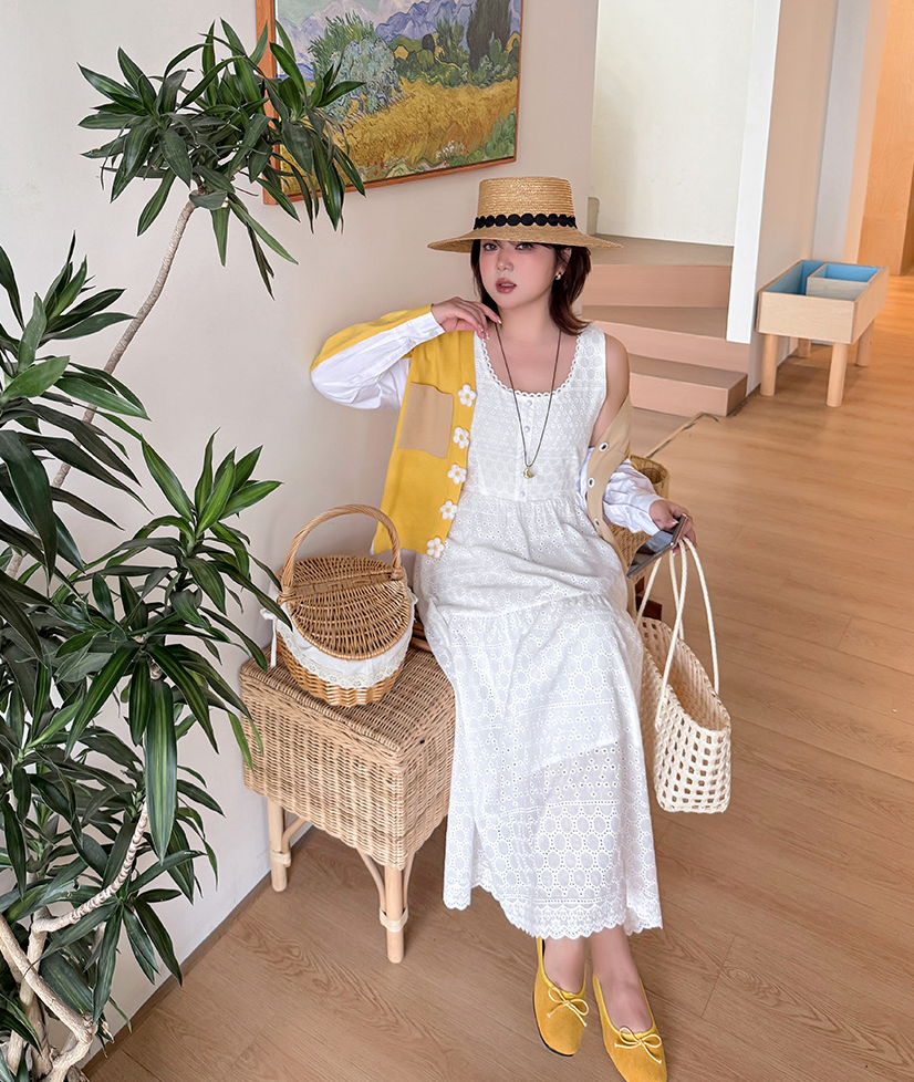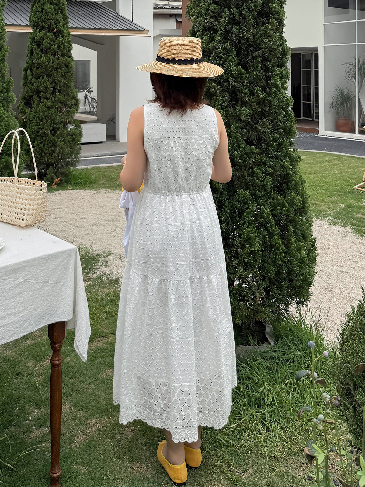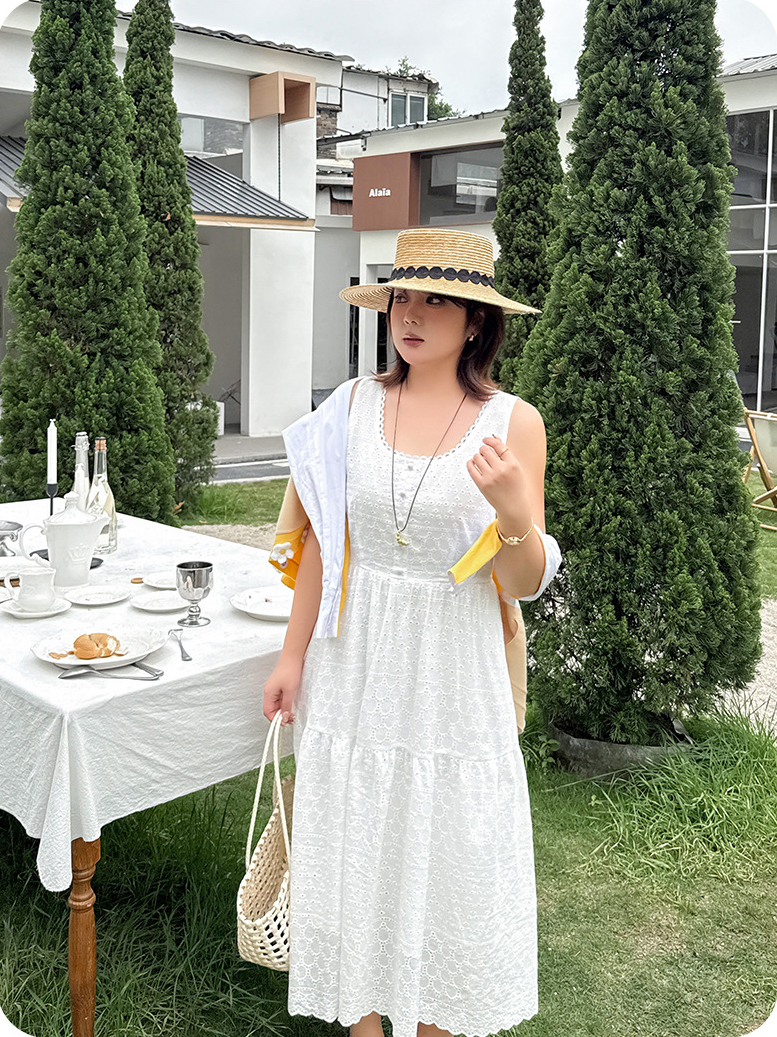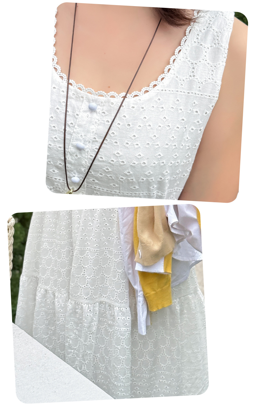 フレッシュで若々しい雰囲気と日常使いしやすいアイテムを組み合わせ、穏やかでリラックスした夏らしい着こなしを楽しめるスタイルです。素材には透かし刺繍が施されたコットン生地を使用しており、通気性・肌触り・ドレープ性に優れています。表面に浮かび上がる美しい透かし模様が上品な質感を醸し出しながらも、シンプルで着回しやすい印象をキープしています。丸首のデザインには繊細なレーストリムと装飾的な布ボタンをあしらい、さりげないおしゃれ感とレイヤード感を演出。ノースリーブのすっきりとしたシルエットとバックウエストのゴム仕様が、肩・首まわりのラインを美しく見せてくれます。軽やかで通気性の高い二重仕立てのティアードスカートは、ふんわりとしたボリューム感が女性らしさを引き立て、夏の装いをより華やかに仕上げます。