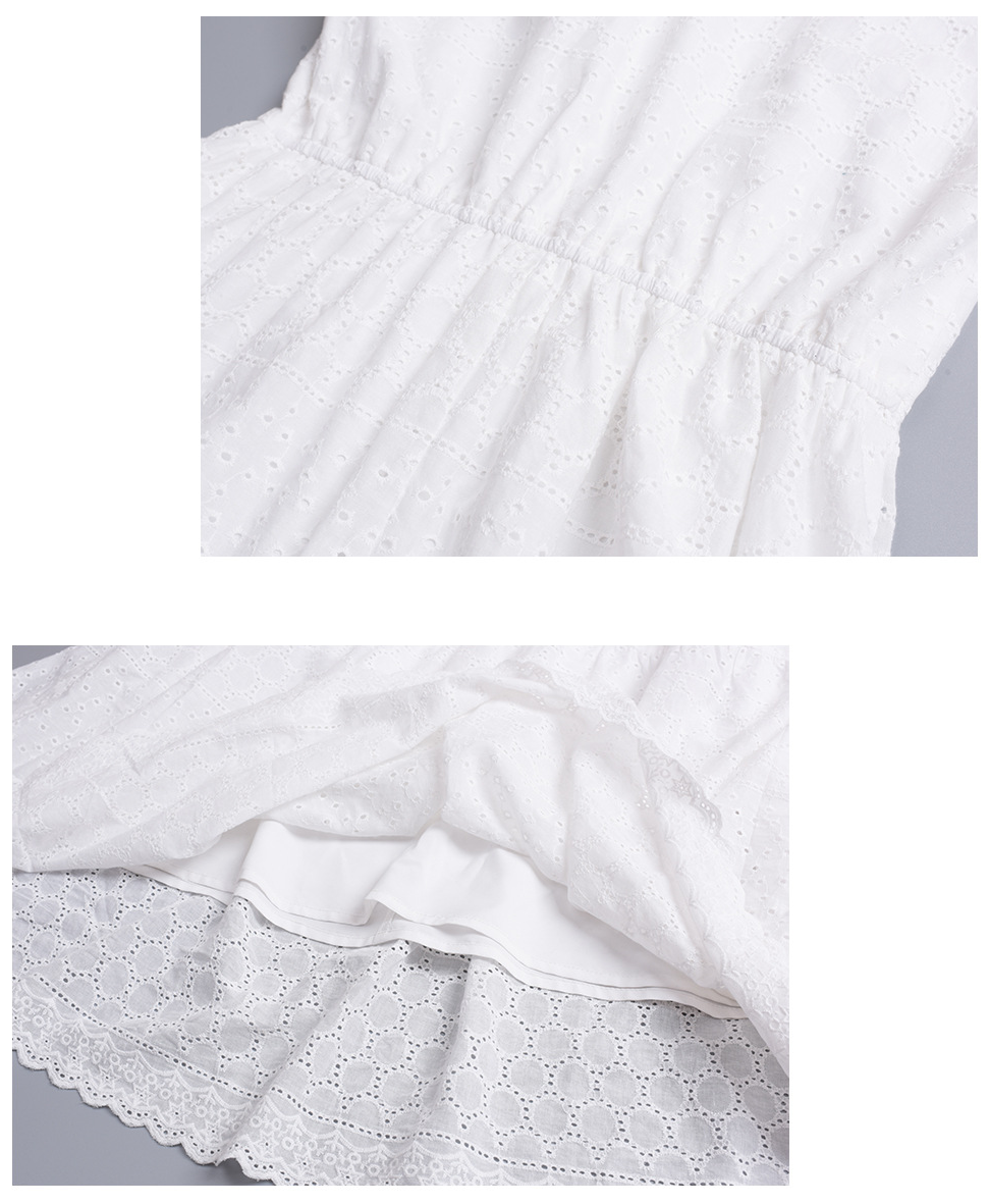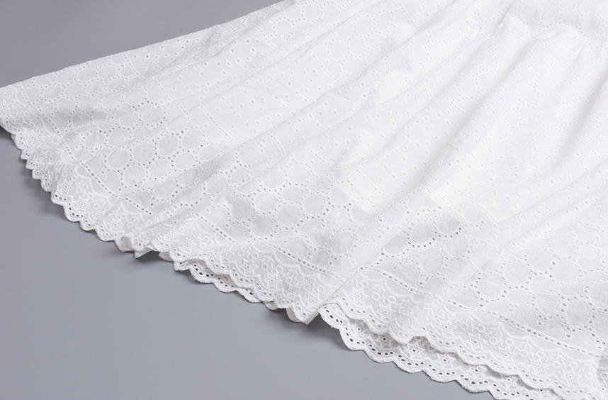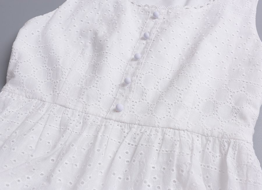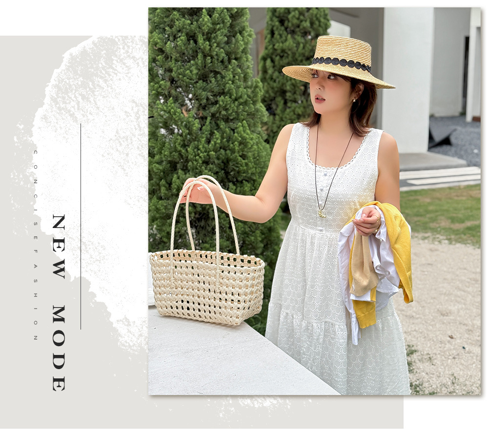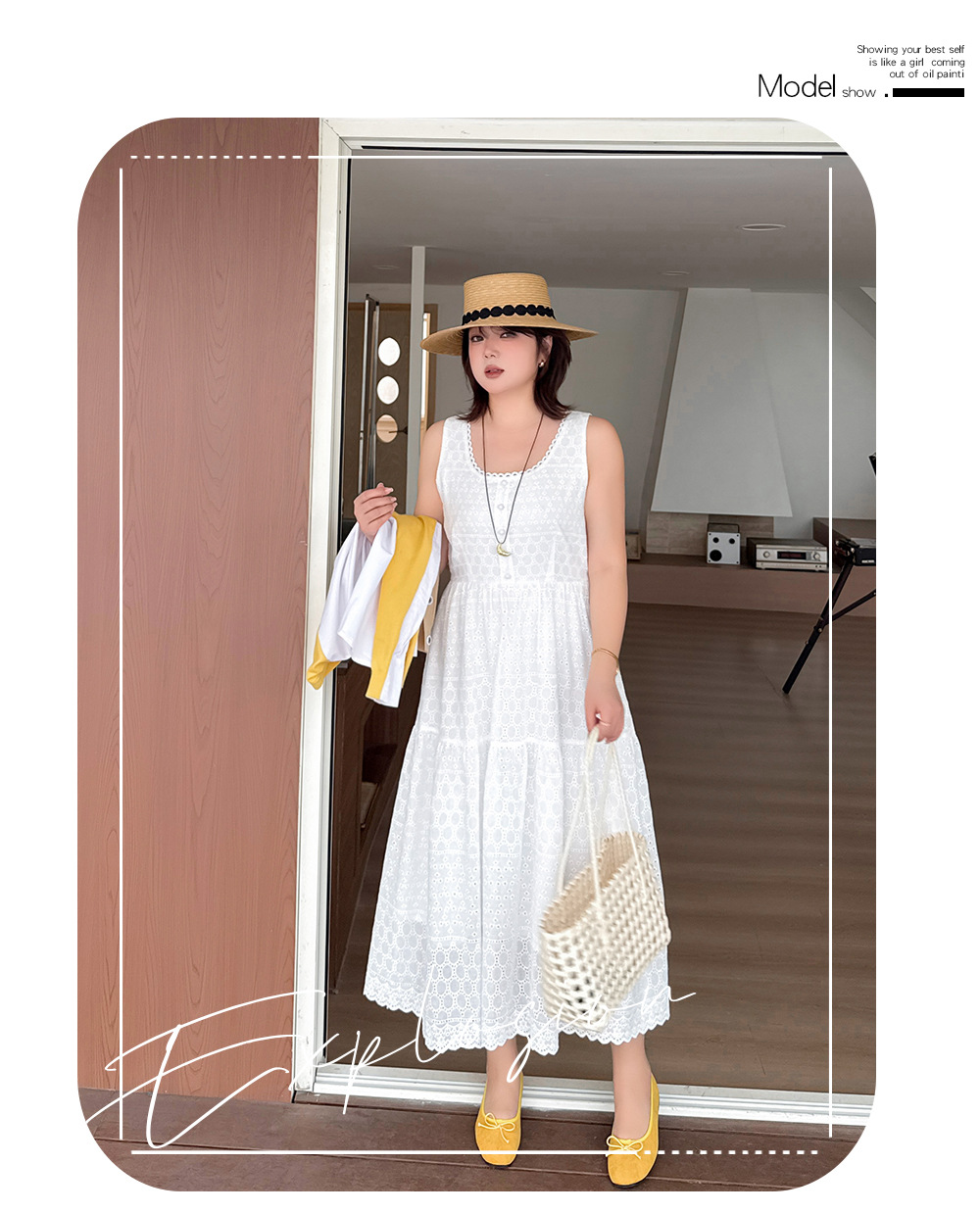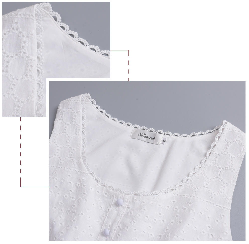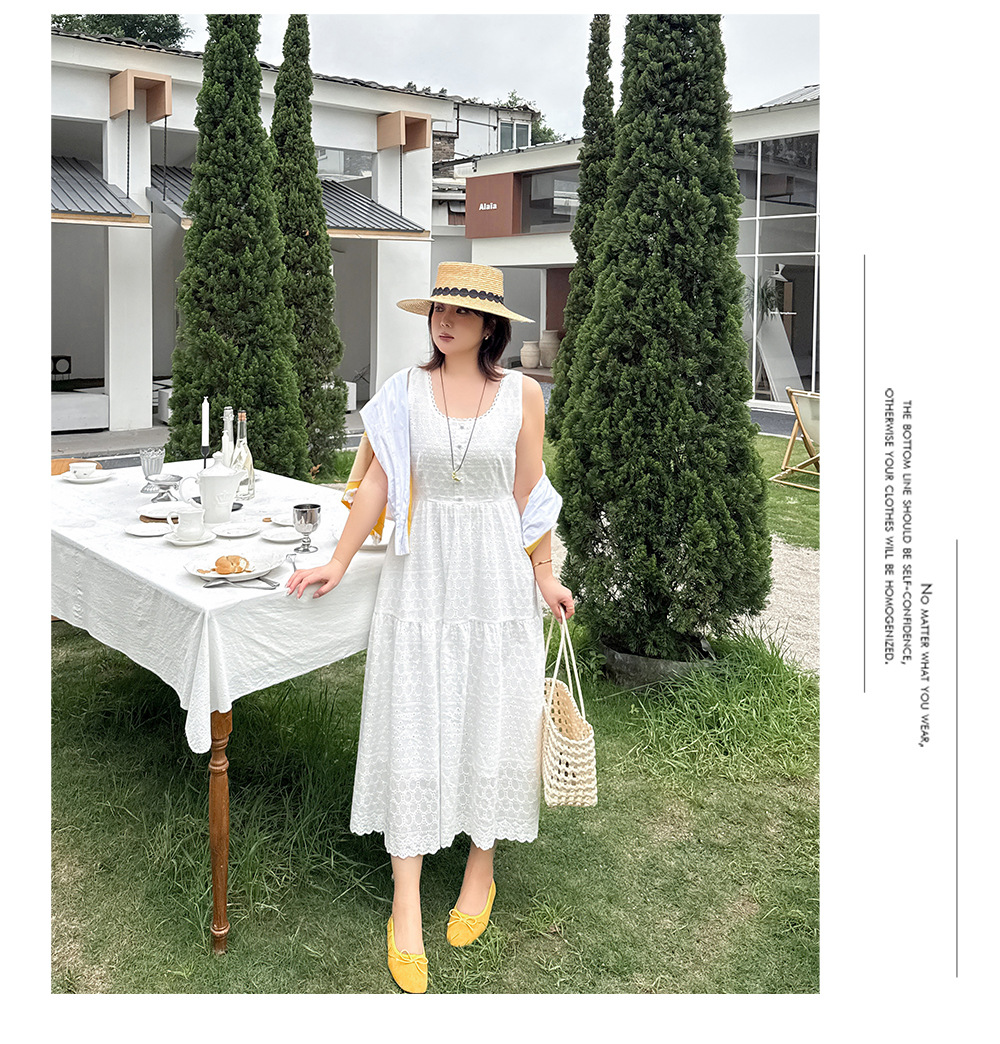 フレッシュで若々しい雰囲気と日常使いしやすいアイテムを組み合わせ、穏やかでリラックスした夏らしい着こなしを楽しめるスタイルです。素材には透かし刺繍が施されたコットン生地を使用しており、通気性・肌触り・ドレープ性に優れています。表面に浮かび上がる美しい透かし模様が上品な質感を醸し出しながらも、シンプルで着回しやすい印象をキープしています。丸首のデザインには繊細なレーストリムと装飾的な布ボタンをあしらい、さりげないおしゃれ感とレイヤード感を演出。ノースリーブのすっきりとしたシルエットとバックウエストのゴム仕様が、肩・首まわりのラインを美しく見せてくれます。軽やかで通気性の高い二重仕立てのティアードスカートは、ふんわりとしたボリューム感が女性らしさを引き立て、夏の装いをより華やかに仕上げます。