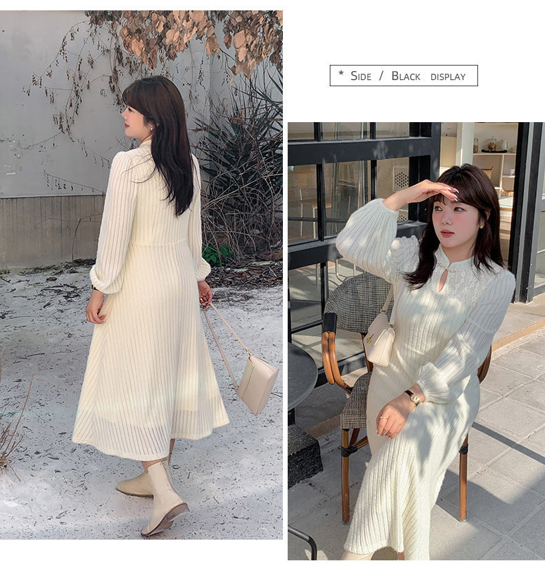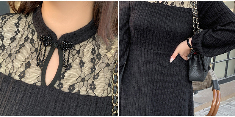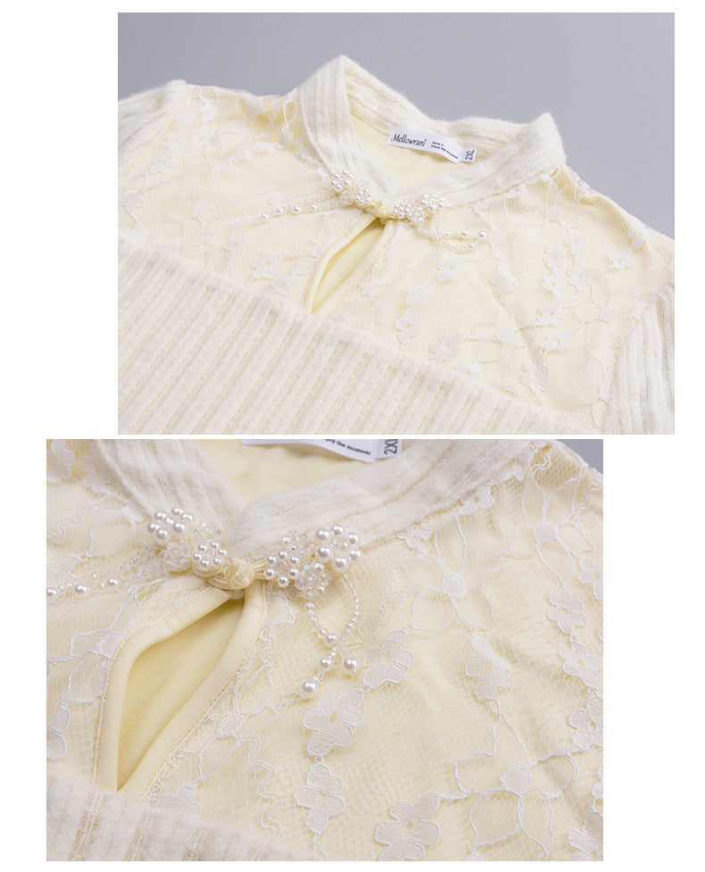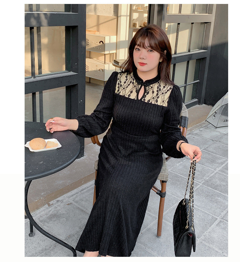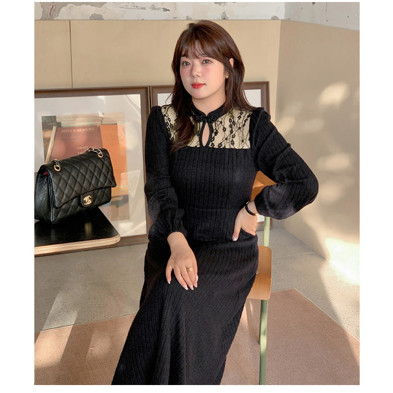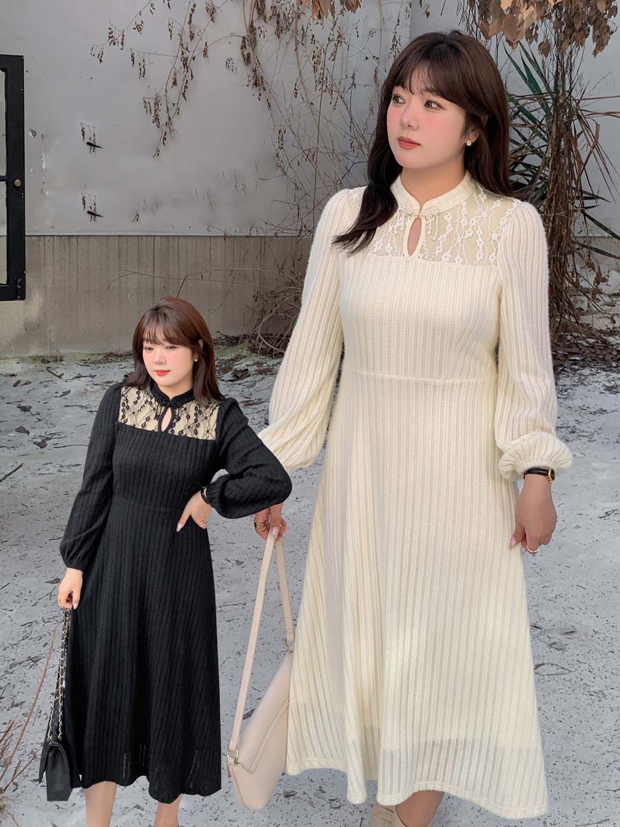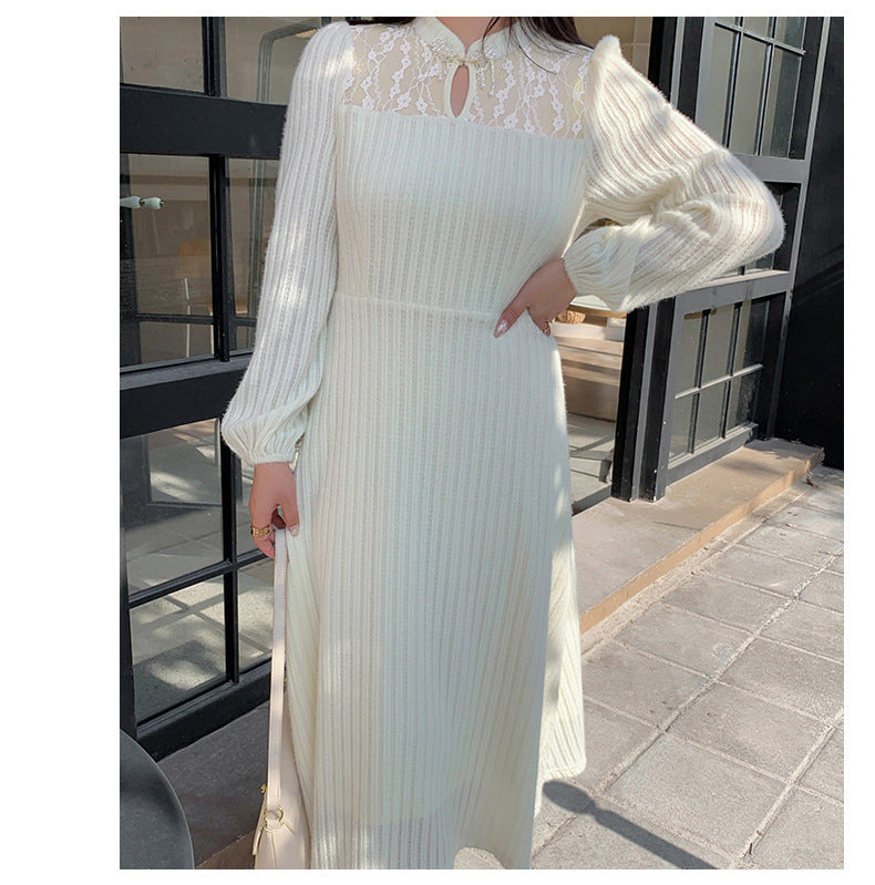 チャイナ風レースワンピース。暖かみのある素材とエレガントなレースデザインが絶妙に組み合わさり、上品な雰囲気を醸し出します。ボディラインを美しく演出するシルエットで、着るだけで女性らしい魅力を引き立ててくれます。クラシカルな雰囲気とモダンなデザインの融合が魅力の一着です。寒い季節でも、華やかでおしゃれな装いを楽しみたい方にぜひおすすめします。