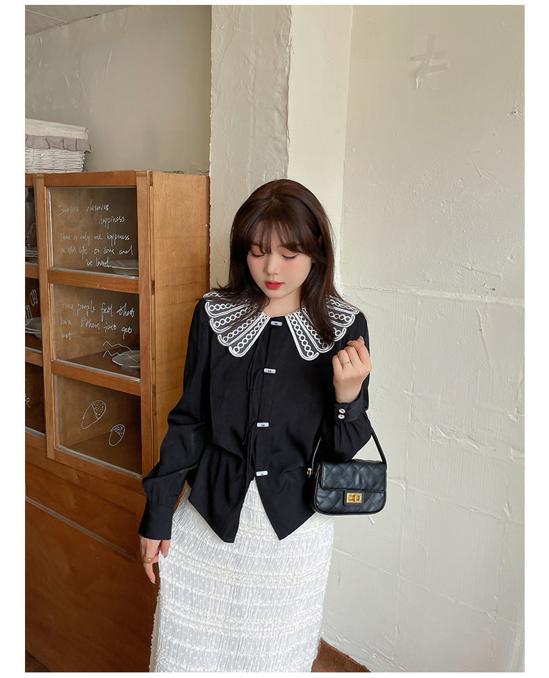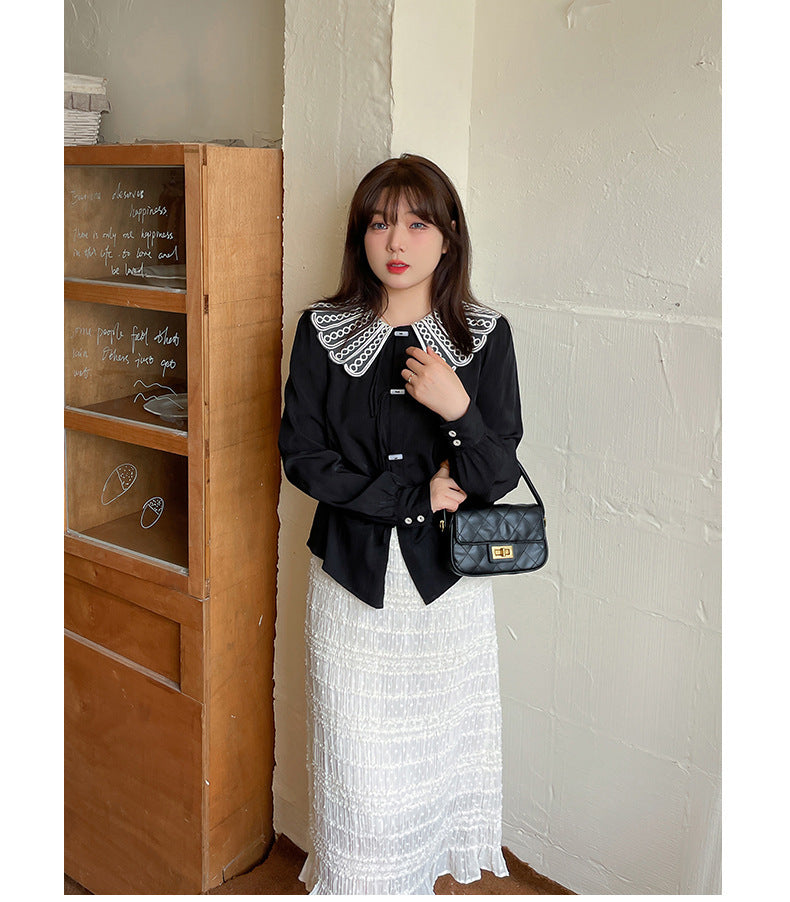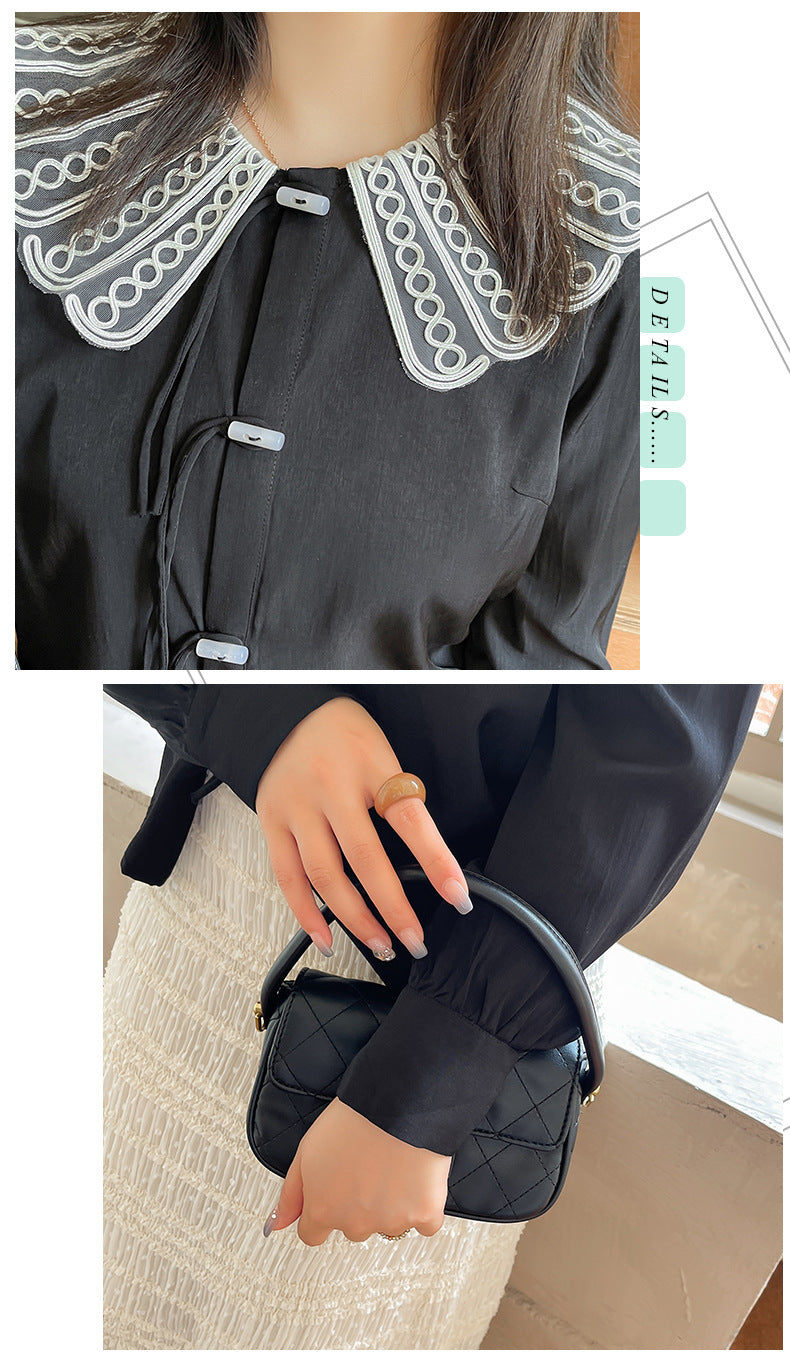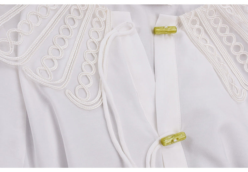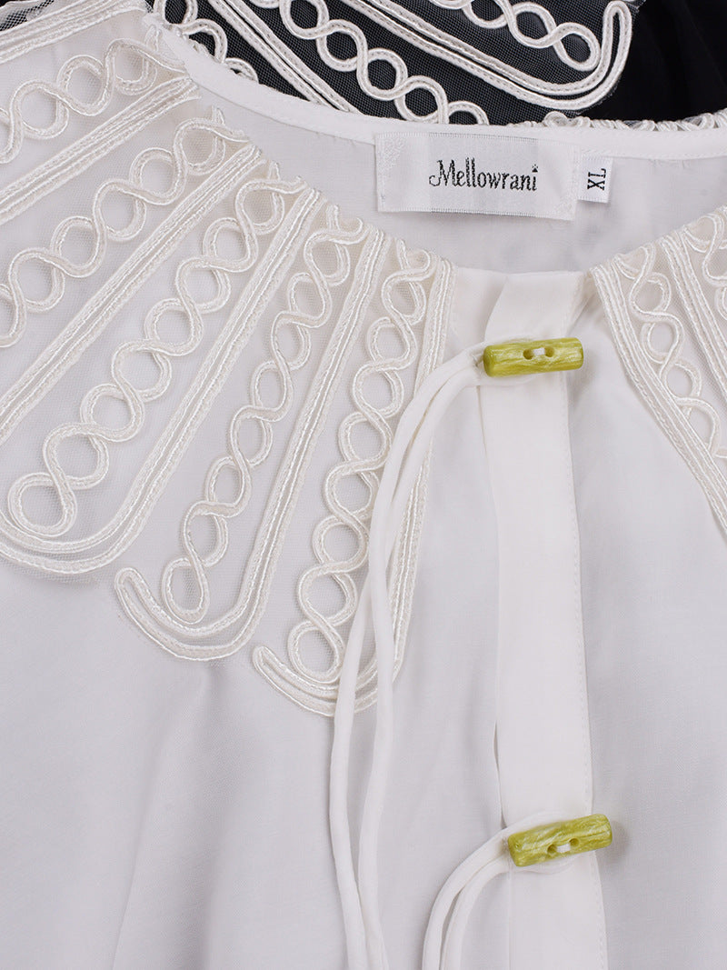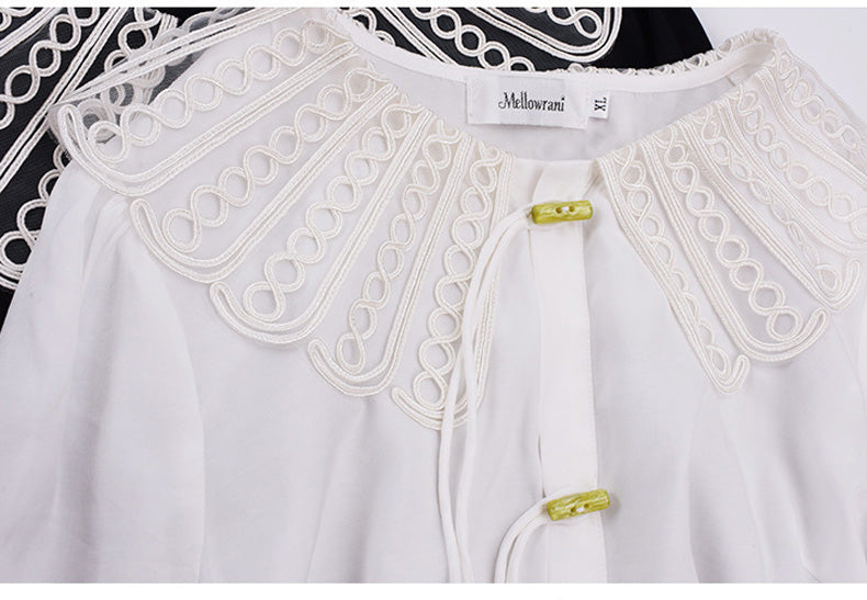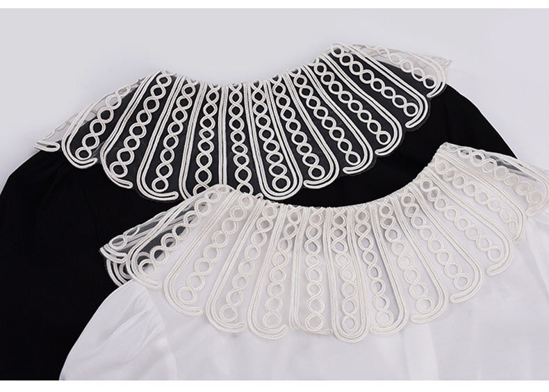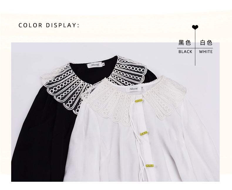 印象的なレースの装飾が施された、上品で華やかなデザインのブラウスです。ラウンドネックで着心地も抜群。華やかさと女性らしさを引き立てます。シンプルながらもエレガントで、着用するだけで気分が高まること間違いなし。一枚で着用はもちろん、レースカラーを利用して、インナーとして着用することでオシャレ上級者になり、周りの注目を集めること間違いなしのブラウスです!