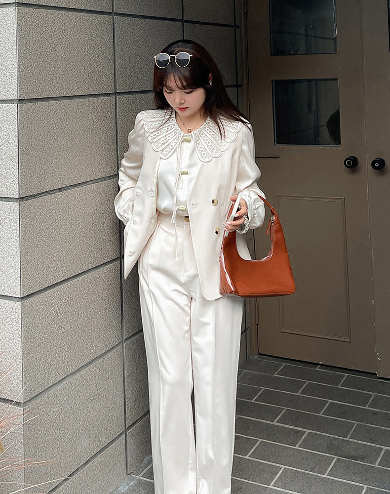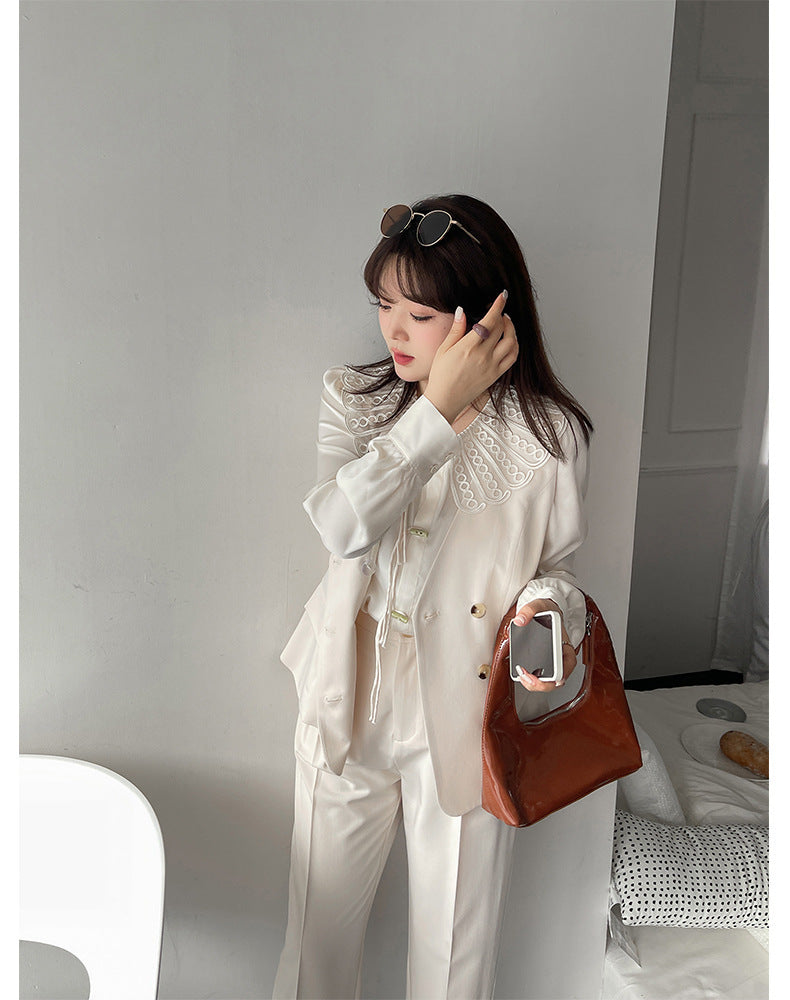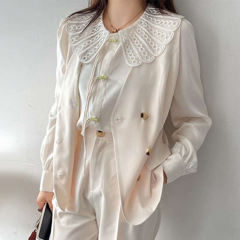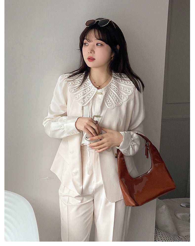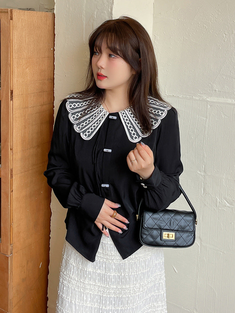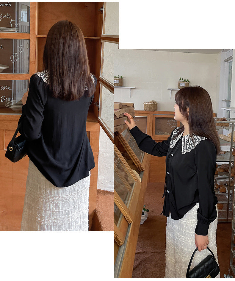 印象的なレースの装飾が施された、上品で華やかなデザインのブラウスです。ラウンドネックで着心地も抜群。華やかさと女性らしさを引き立てます。シンプルながらもエレガントで、着用するだけで気分が高まること間違いなし。一枚で着用はもちろん、レースカラーを利用して、インナーとして着用することでオシャレ上級者になり、周りの注目を集めること間違いなしのブラウスです!