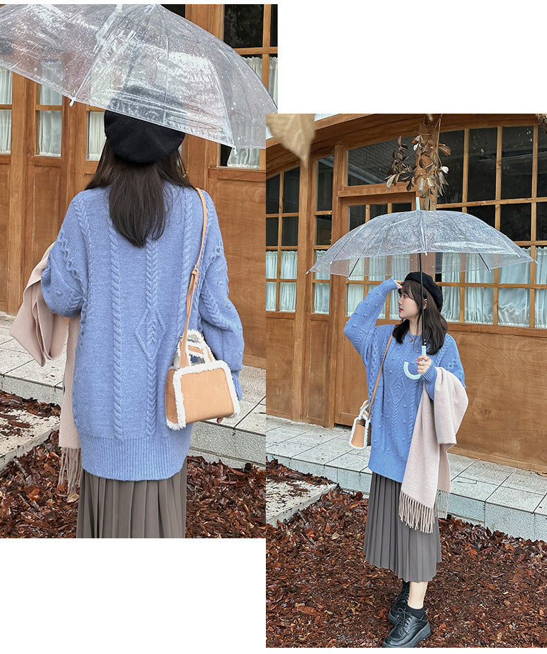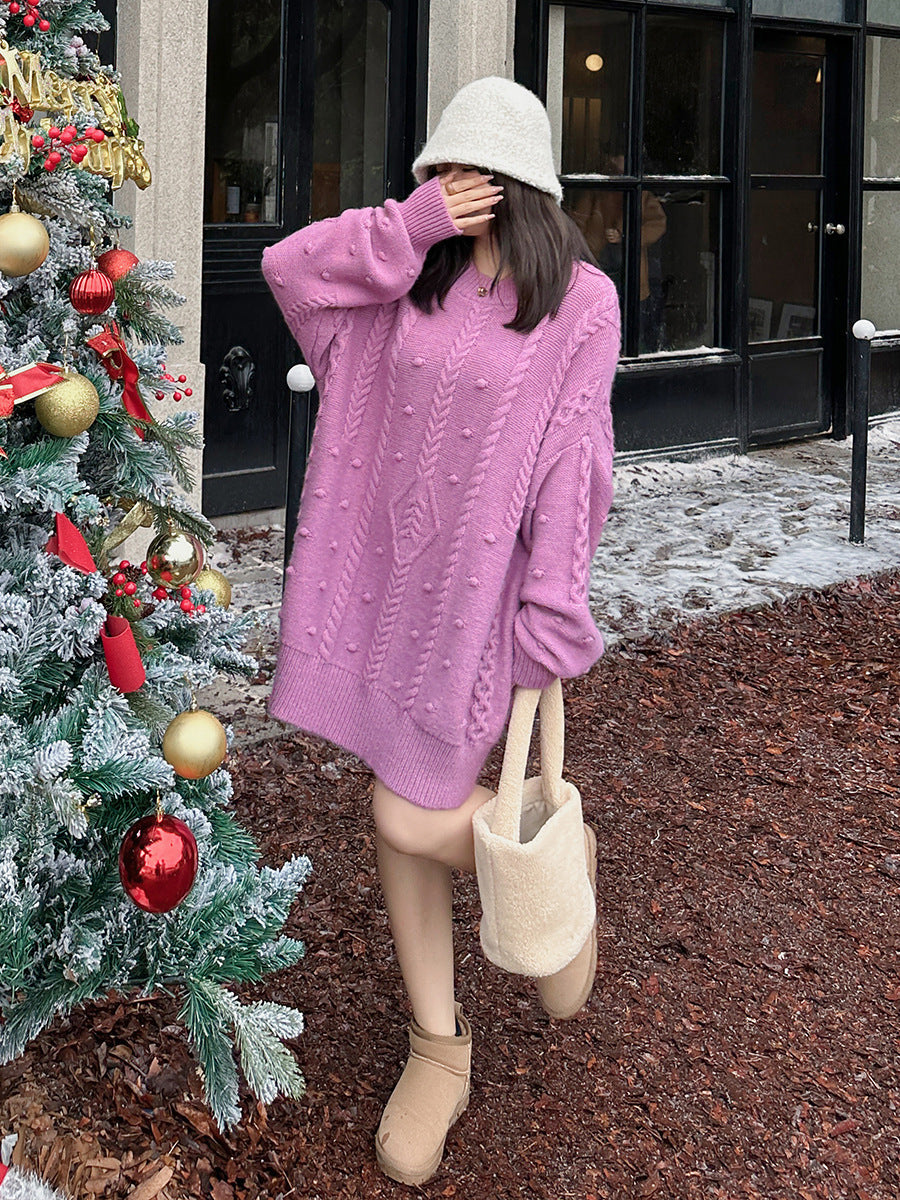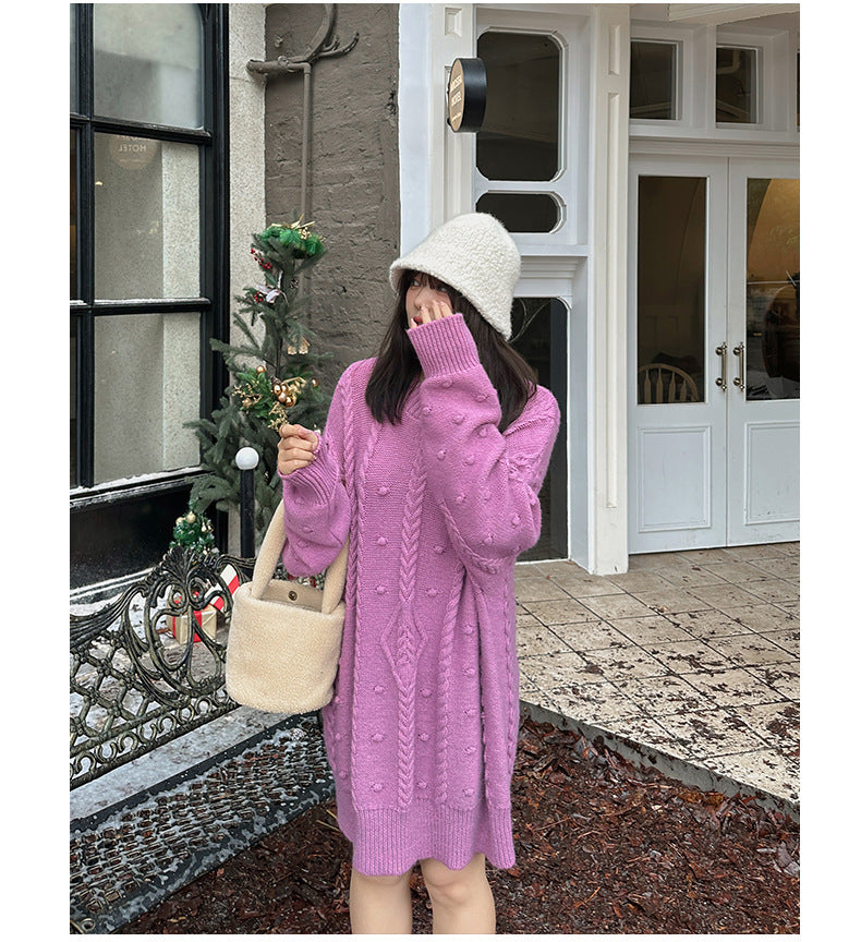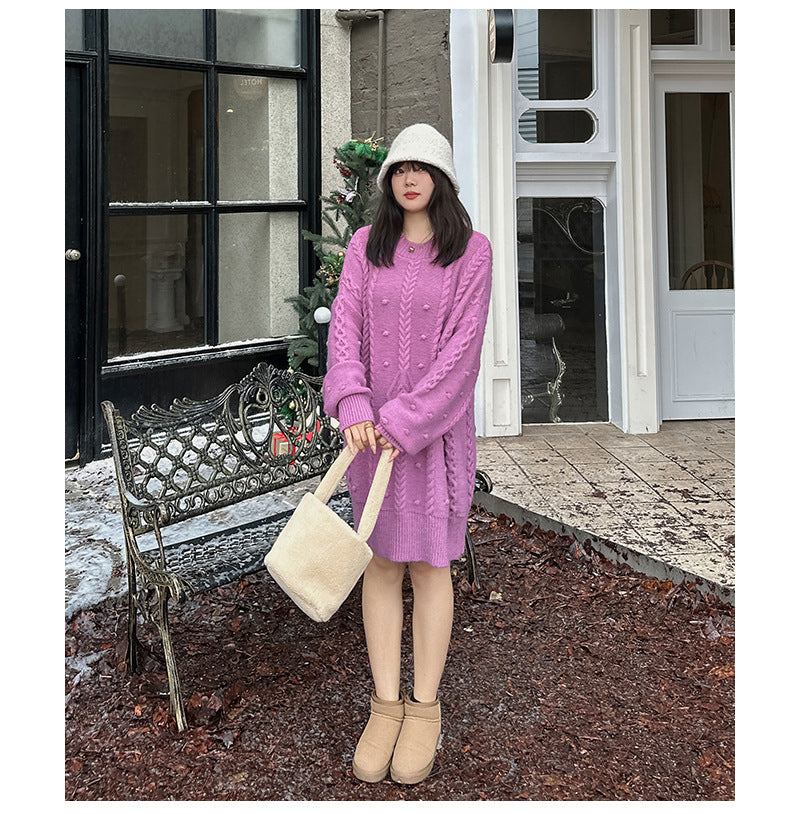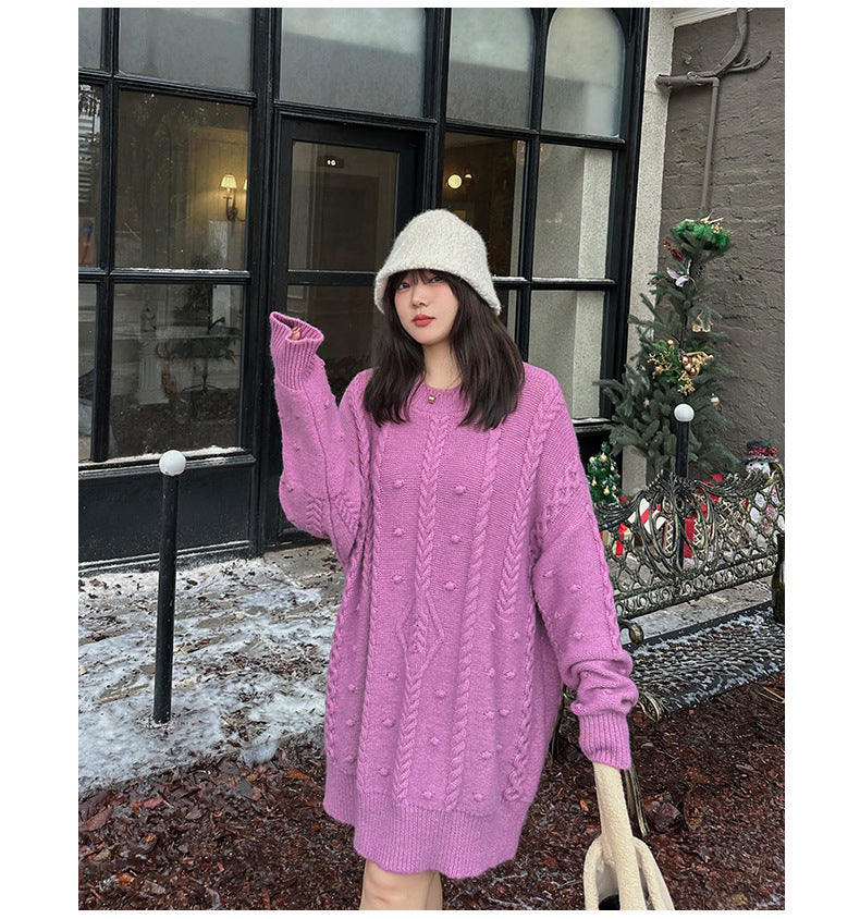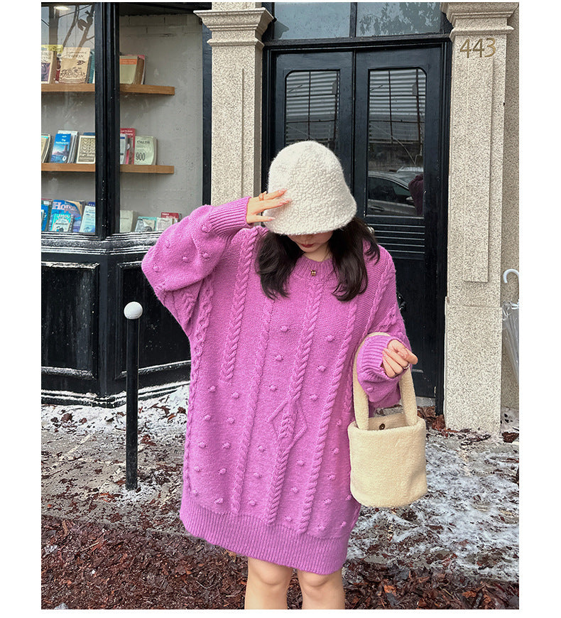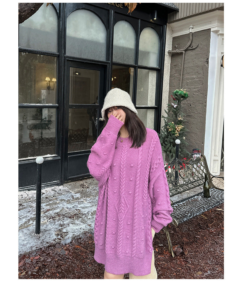 ケーブル織りのチュニック丈ニット最大のポイントは、複雑な模様が施されたケーブルデザイン。柔らかく快適な伸縮性がります。大きめのサイズ感で、ヒップにかかる丈感なので一枚で着ても、パンツやスカートとあわせても可愛いです。暖かくておしゃれな一枚です。