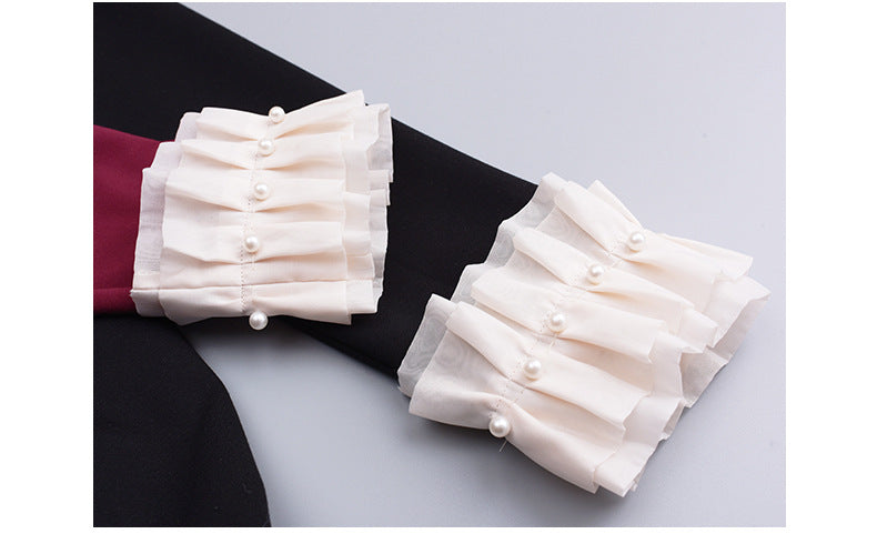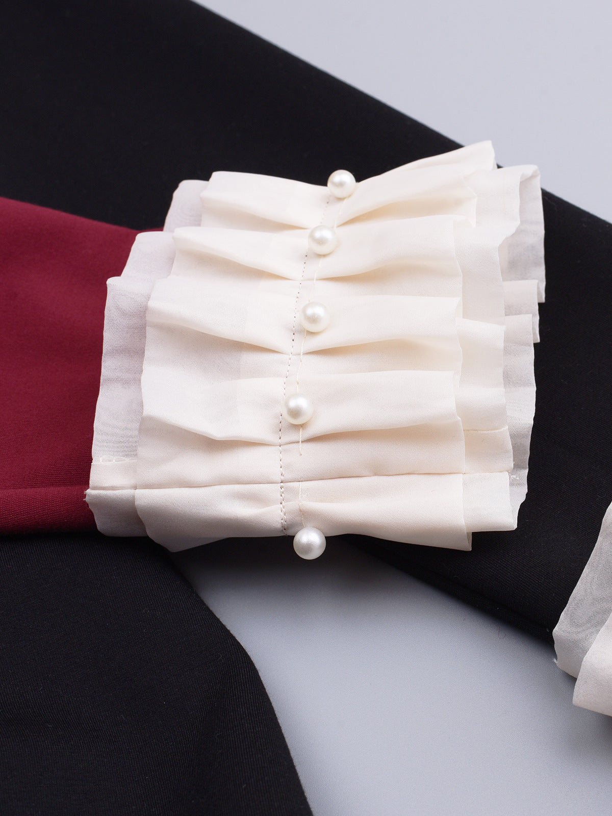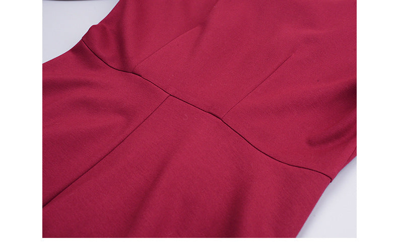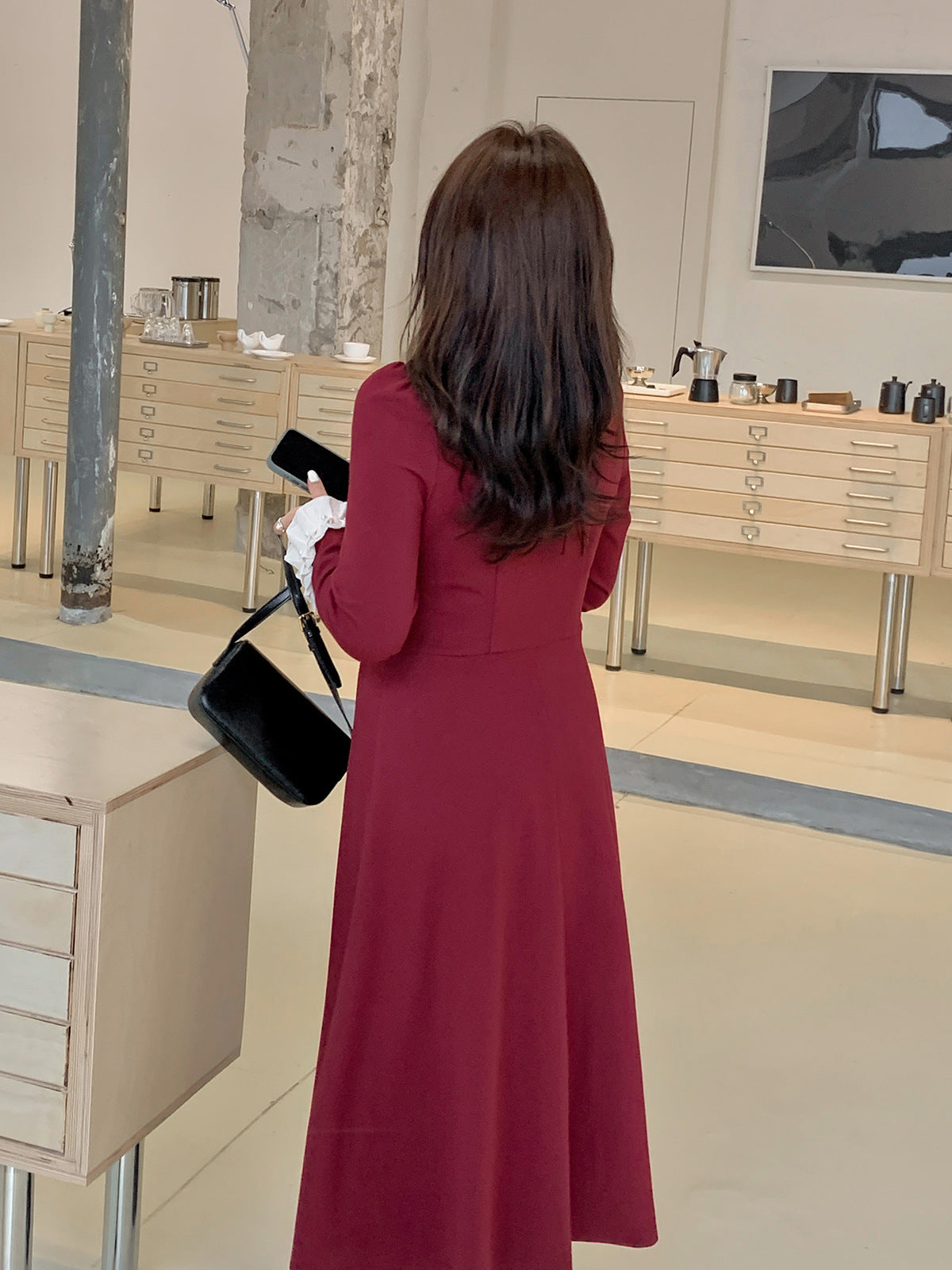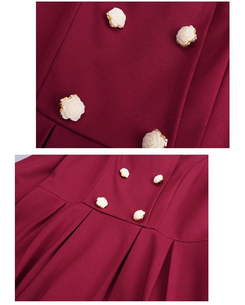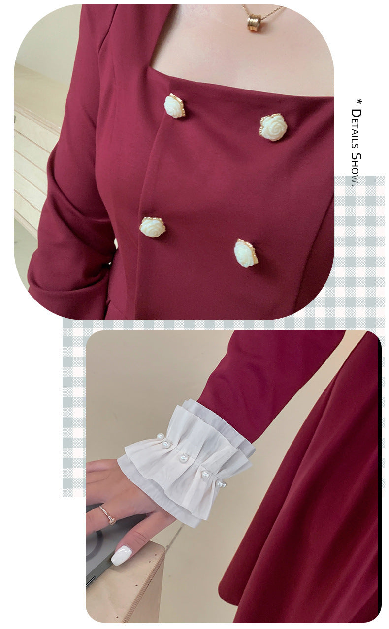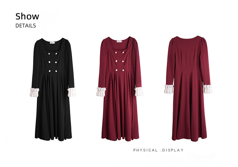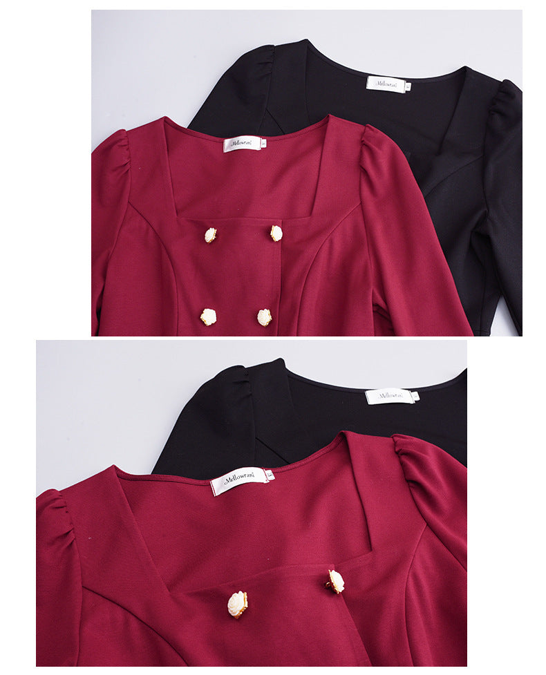 ダブルブレストのワンピースは、厚手で重量感のあるストレッチ生地で作られており、滑らかなドレープと伸縮性のあるスクエアカラーが特徴です。ネックラインはスクエアになっており、すっきりとみせてくれます。フロント中央にはダブルブレストのボタンが付いています。袖口のレースと完璧にマッチし、優美な印象を与えてくれます。特別な日の一枚に華をそえませんか?