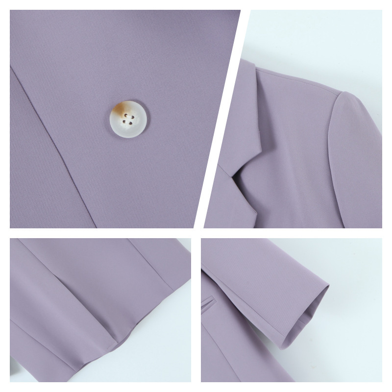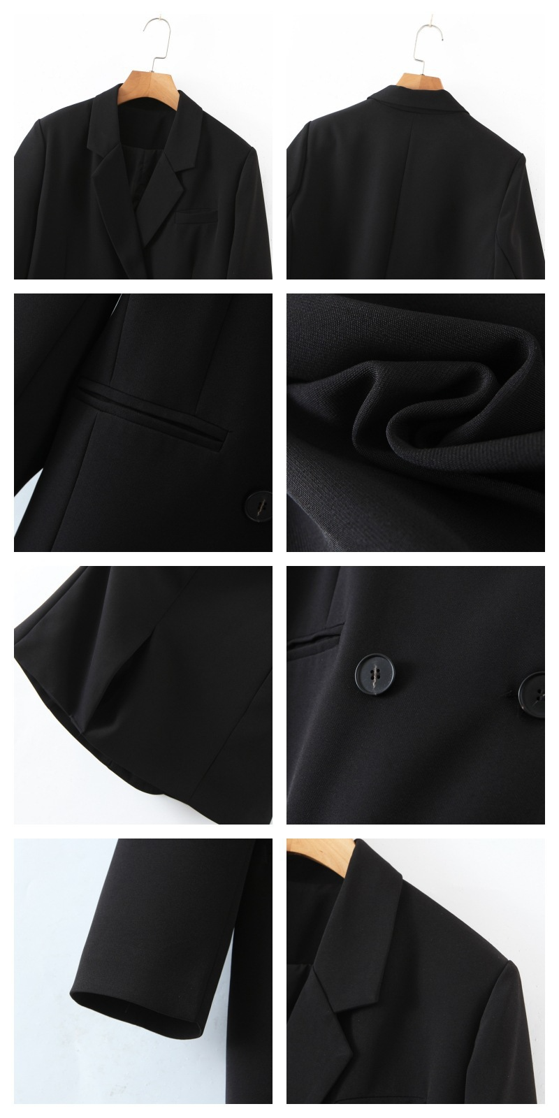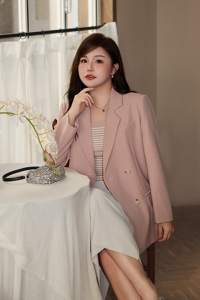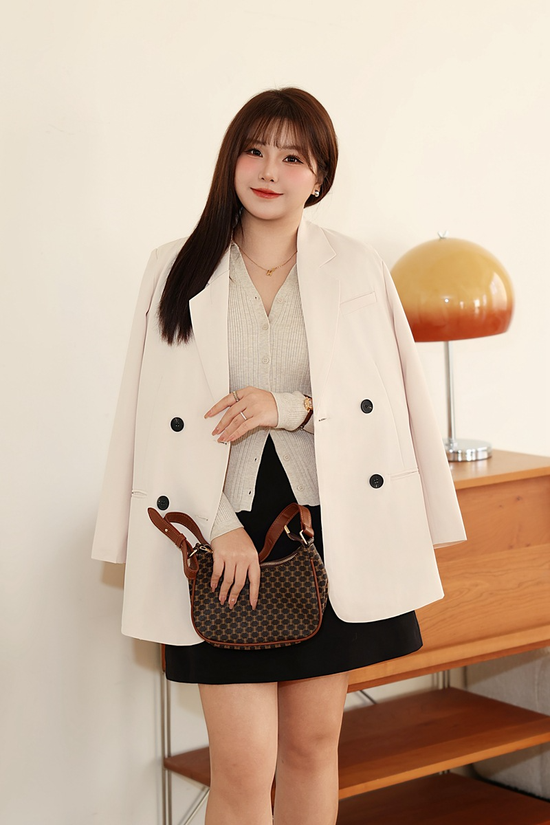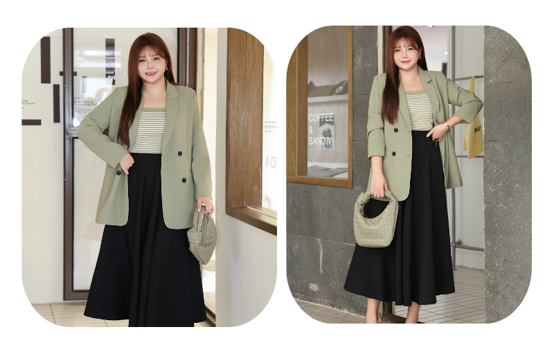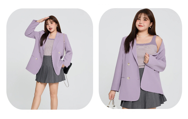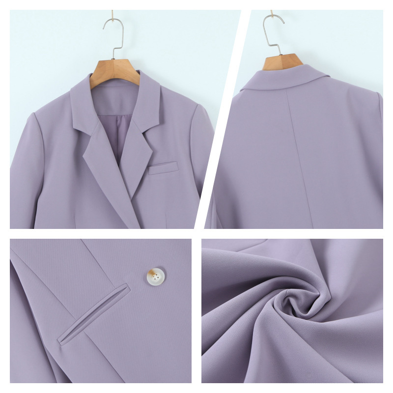 普段使いにも通勤にもぴったりなジャケットです。ダブルブレストで程よいカジュアル感をプラス。ボタンはすべて上質な樹脂素材を使用。ボタンを開けて普段使いもできます。両サイドにはポケット、フロントには飾りポケットなど、細かなディテールも魅力です。裏地付きで、すっきりとまとまりのあるシルエットに。ゆったりとしたシルエットながらも、かっちりとしたサイズ感は、オーバーサイズすぎずタイトすぎず、程よい厚みのある肩パッド入りで、なで肩の方にも着こなしやすく、スタイルアップ効果も期待できます。トップスは軽量で、滑らかにドレープし、非常に快適で通気性に優れています。程よいミドル丈ですが、だらしなく見えず、スタイリッシュで魅力的な印象を与えてくれます。体型を美しく見せてくれるだけでなく、カジュアルでリラックスした雰囲気も漂います。小柄な女性も、このスーツを着こなせると安心です!自信とスタイルを醸し出すことができ、カジュアルでありながらスリムに見え、全体的な見た目が単調になるのを防ぎ、実用性と美観の両方を高めます。