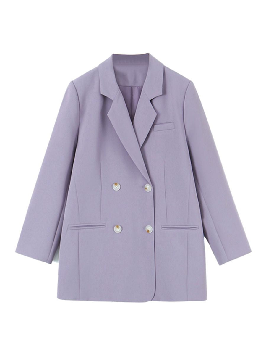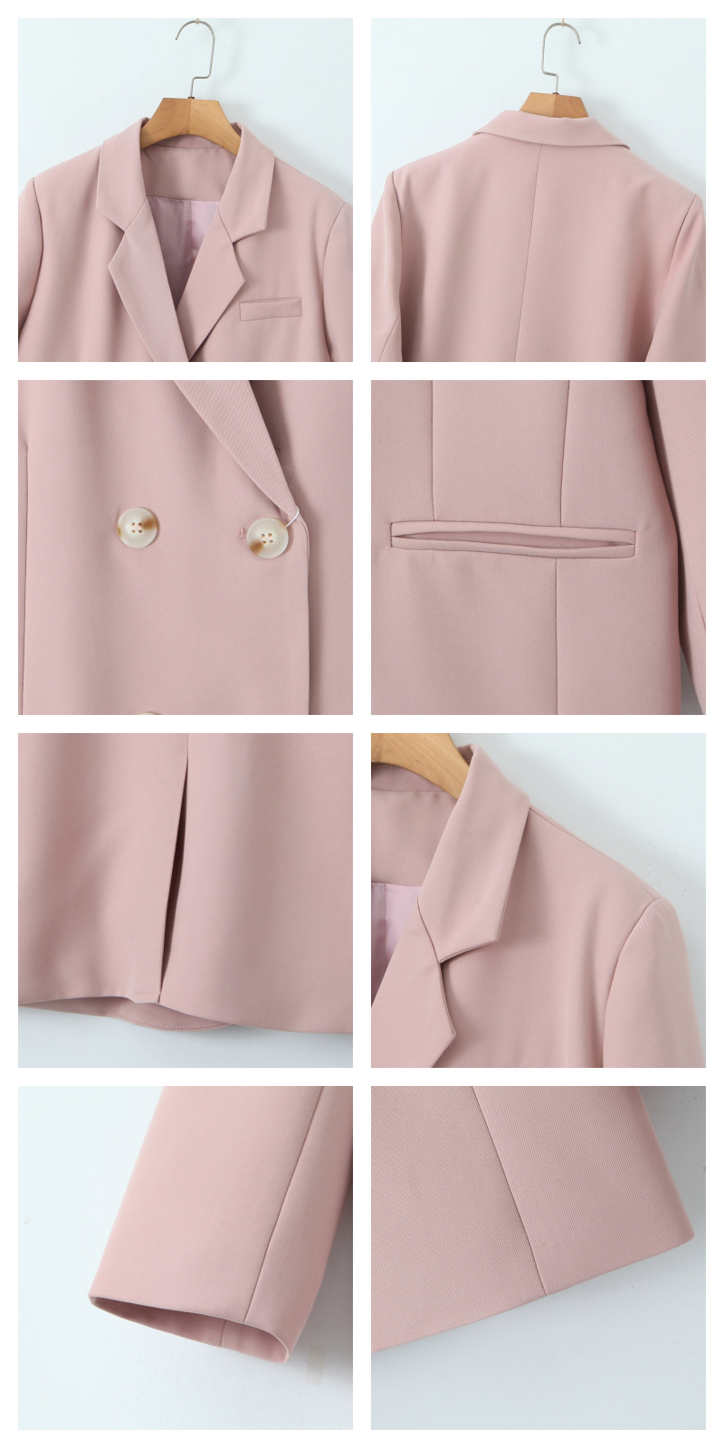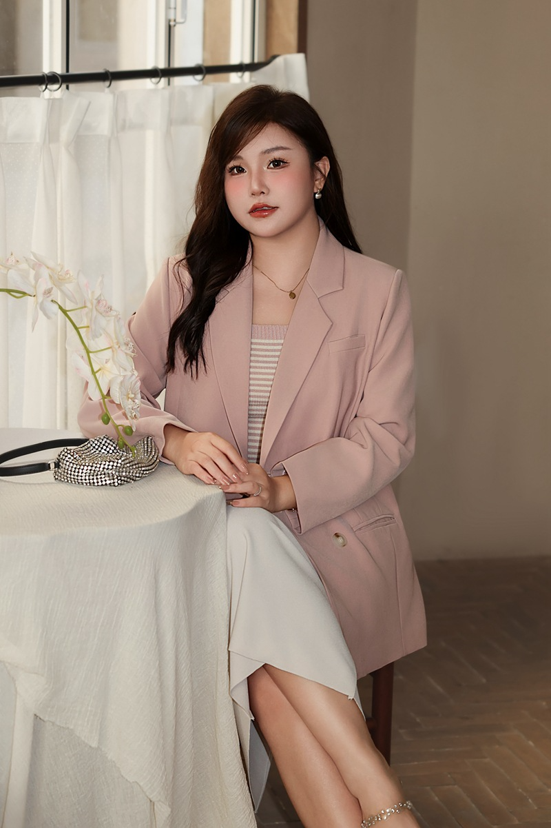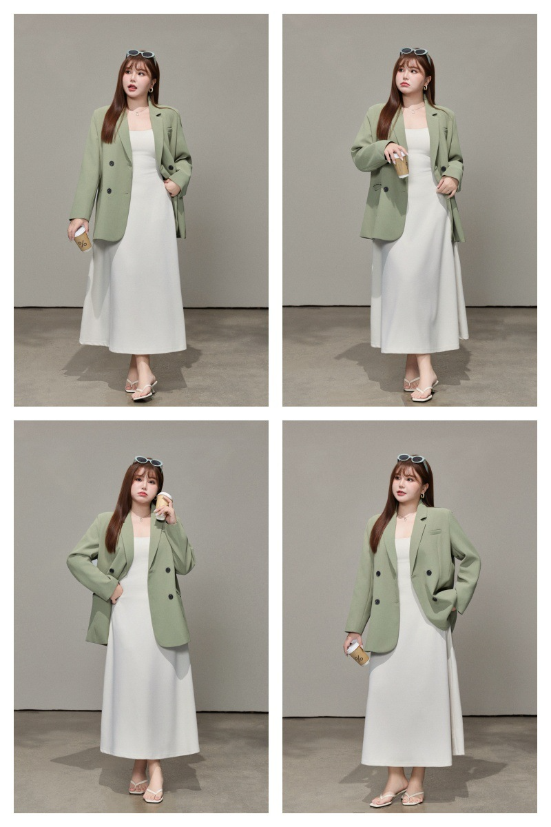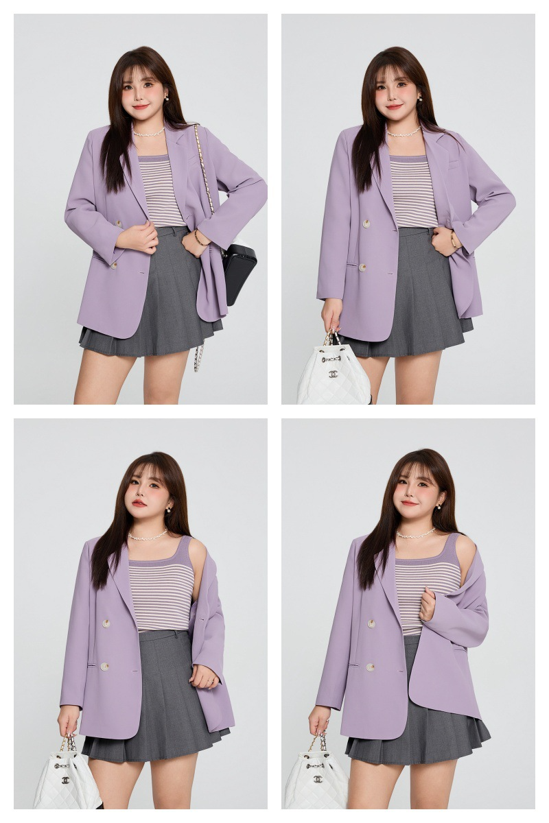 普段使いにも通勤にもぴったりなジャケットです。ダブルブレストで程よいカジュアル感をプラス。ボタンはすべて上質な樹脂素材を使用。ボタンを開けて普段使いもできます。両サイドにはポケット、フロントには飾りポケットなど、細かなディテールも魅力です。裏地付きで、すっきりとまとまりのあるシルエットに。ゆったりとしたシルエットながらも、かっちりとしたサイズ感は、オーバーサイズすぎずタイトすぎず、程よい厚みのある肩パッド入りで、なで肩の方にも着こなしやすく、スタイルアップ効果も期待できます。トップスは軽量で、滑らかにドレープし、非常に快適で通気性に優れています。程よいミドル丈ですが、だらしなく見えず、スタイリッシュで魅力的な印象を与えてくれます。体型を美しく見せてくれるだけでなく、カジュアルでリラックスした雰囲気も漂います。小柄な女性も、このスーツを着こなせると安心です!自信とスタイルを醸し出すことができ、カジュアルでありながらスリムに見え、全体的な見た目が単調になるのを防ぎ、実用性と美観の両方を高めます。
