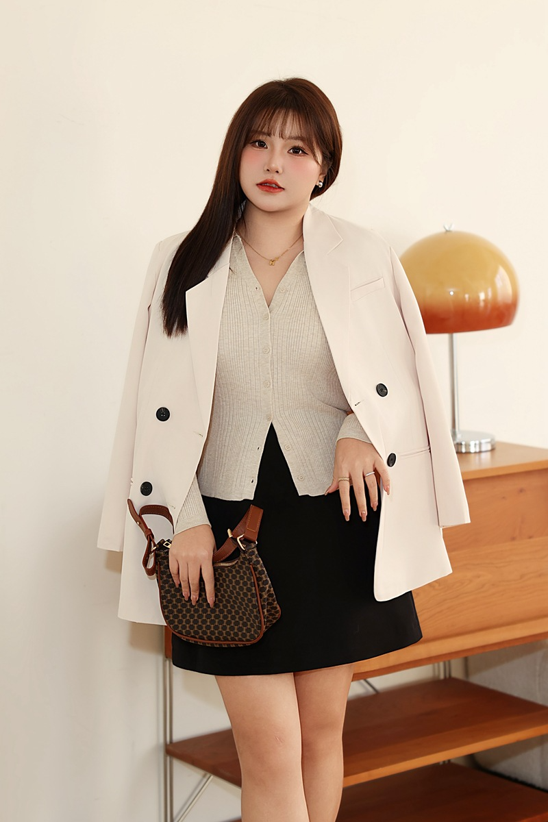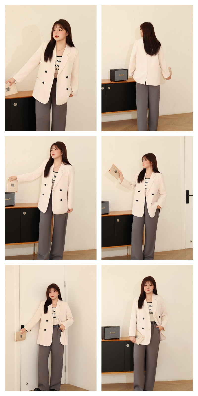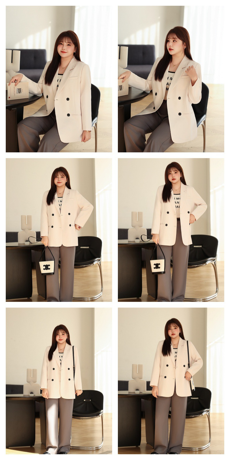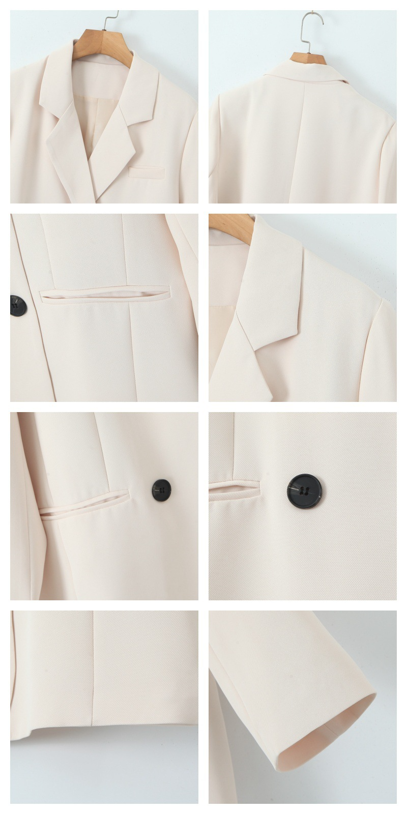 普段使いにも通勤にもぴったりなジャケットです。ダブルブレストで程よいカジュアル感をプラス。ボタンはすべて上質な樹脂素材を使用。ボタンを開けて普段使いもできます。両サイドにはポケット、フロントには飾りポケットなど、細かなディテールも魅力です。裏地付きで、すっきりとまとまりのあるシルエットに。ゆったりとしたシルエットながらも、かっちりとしたサイズ感は、オーバーサイズすぎずタイトすぎず、程よい厚みのある肩パッド入りで、なで肩の方にも着こなしやすく、スタイルアップ効果も期待できます。トップスは軽量で、滑らかにドレープし、非常に快適で通気性に優れています。程よいミドル丈ですが、だらしなく見えず、スタイリッシュで魅力的な印象を与えてくれます。体型を美しく見せてくれるだけでなく、カジュアルでリラックスした雰囲気も漂います。小柄な女性も、このスーツを着こなせると安心です!自信とスタイルを醸し出すことができ、カジュアルでありながらスリムに見え、全体的な見た目が単調になるのを防ぎ、実用性と美観の両方を高めます。