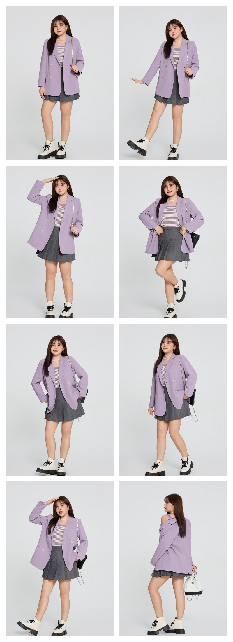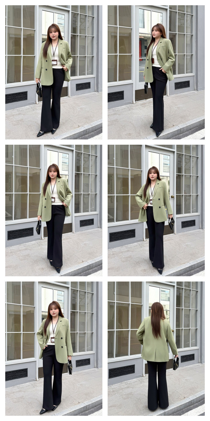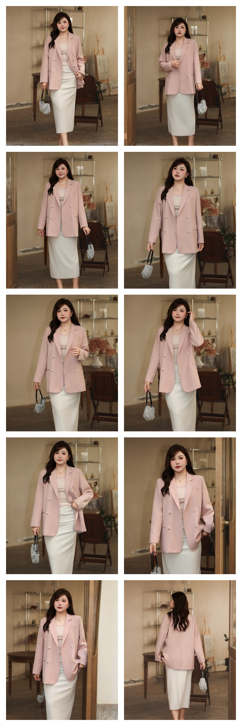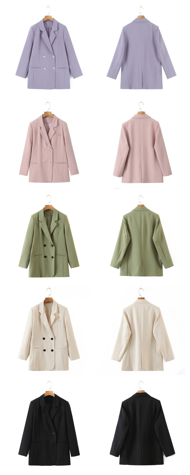 普段使いにも通勤にもぴったりなジャケットです。ダブルブレストで程よいカジュアル感をプラス。ボタンはすべて上質な樹脂素材を使用。ボタンを開けて普段使いもできます。両サイドにはポケット、フロントには飾りポケットなど、細かなディテールも魅力です。裏地付きで、すっきりとまとまりのあるシルエットに。ゆったりとしたシルエットながらも、かっちりとしたサイズ感は、オーバーサイズすぎずタイトすぎず、程よい厚みのある肩パッド入りで、なで肩の方にも着こなしやすく、スタイルアップ効果も期待できます。トップスは軽量で、滑らかにドレープし、非常に快適で通気性に優れています。程よいミドル丈ですが、だらしなく見えず、スタイリッシュで魅力的な印象を与えてくれます。体型を美しく見せてくれるだけでなく、カジュアルでリラックスした雰囲気も漂います。小柄な女性も、このスーツを着こなせると安心です!自信とスタイルを醸し出すことができ、カジュアルでありながらスリムに見え、全体的な見た目が単調になるのを防ぎ、実用性と美観の両方を高めます。