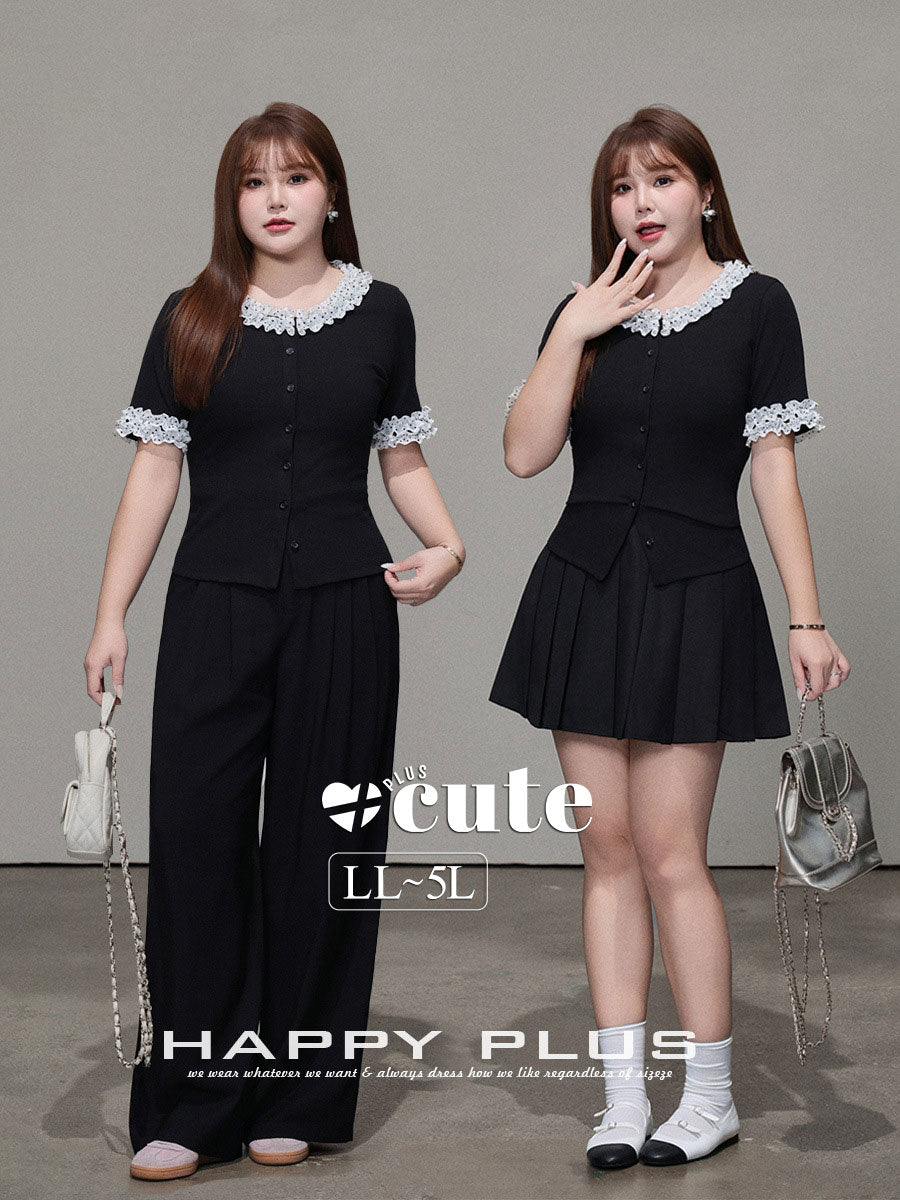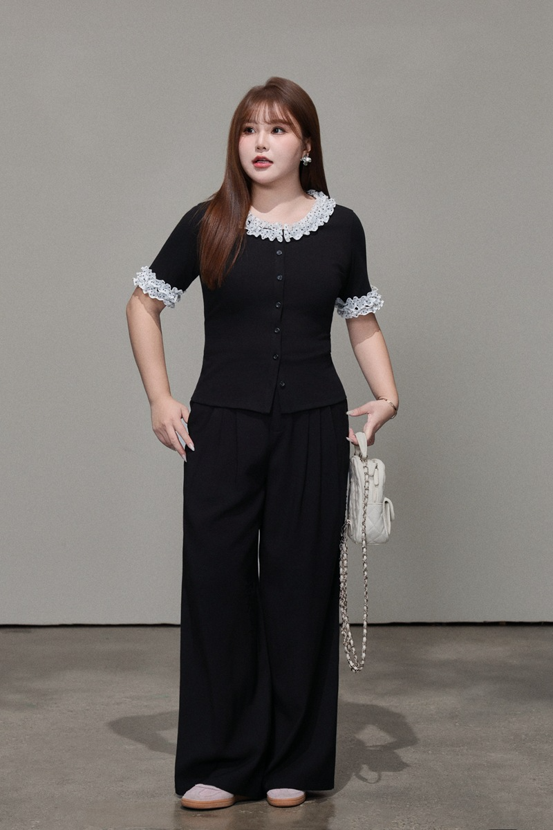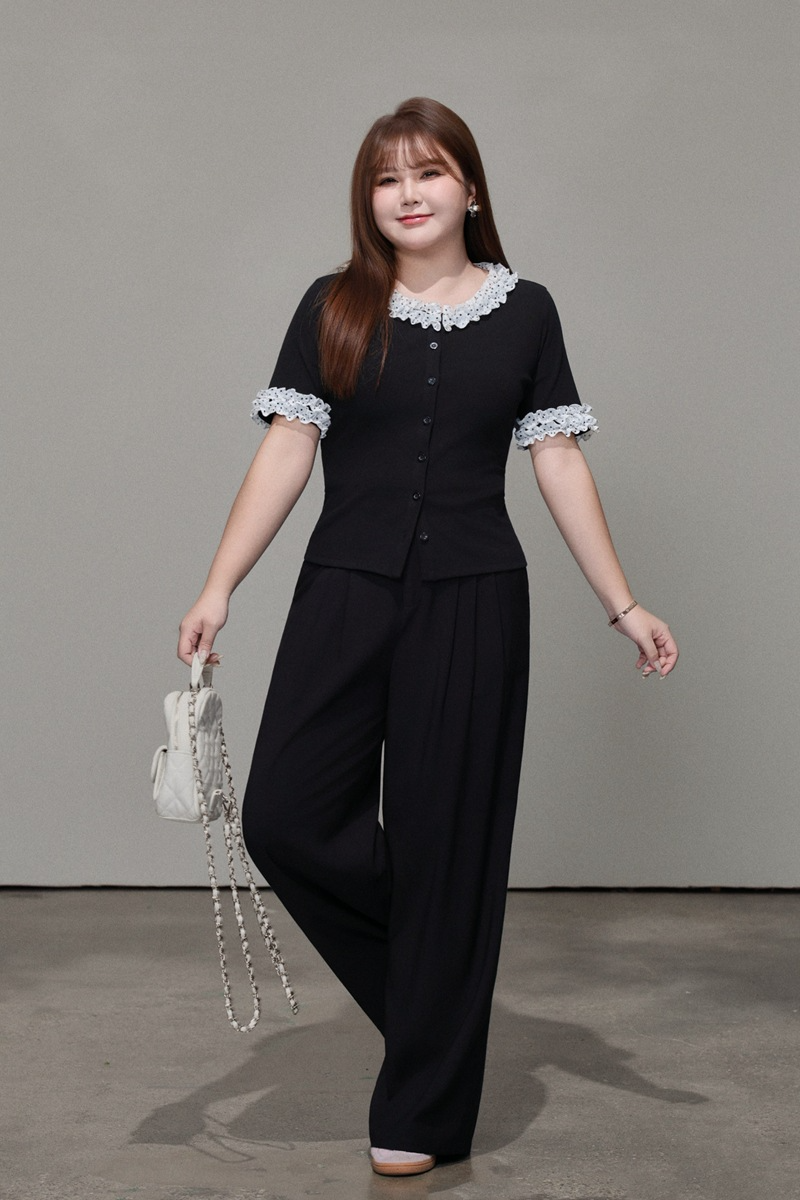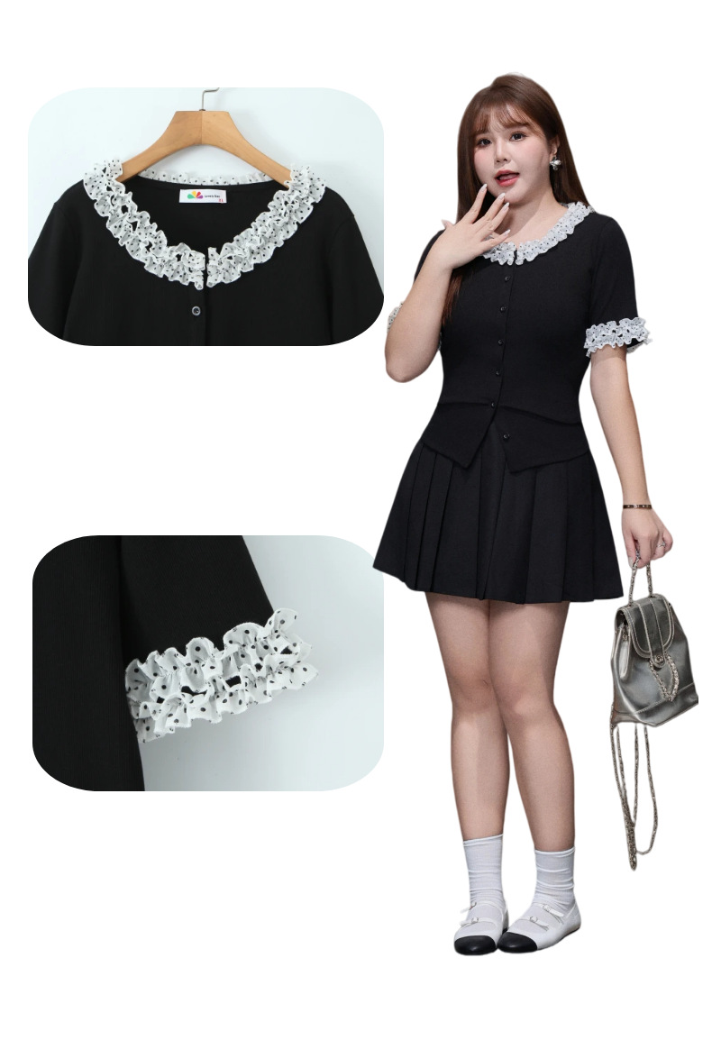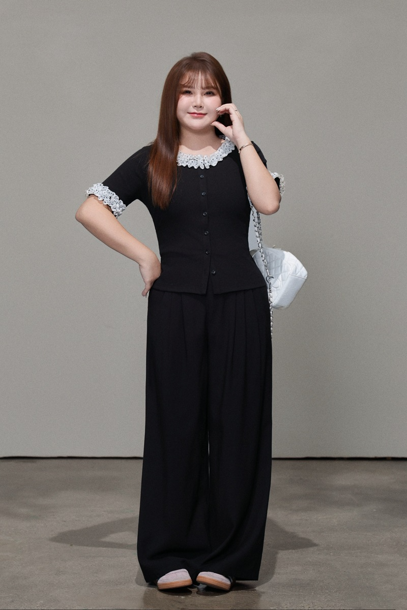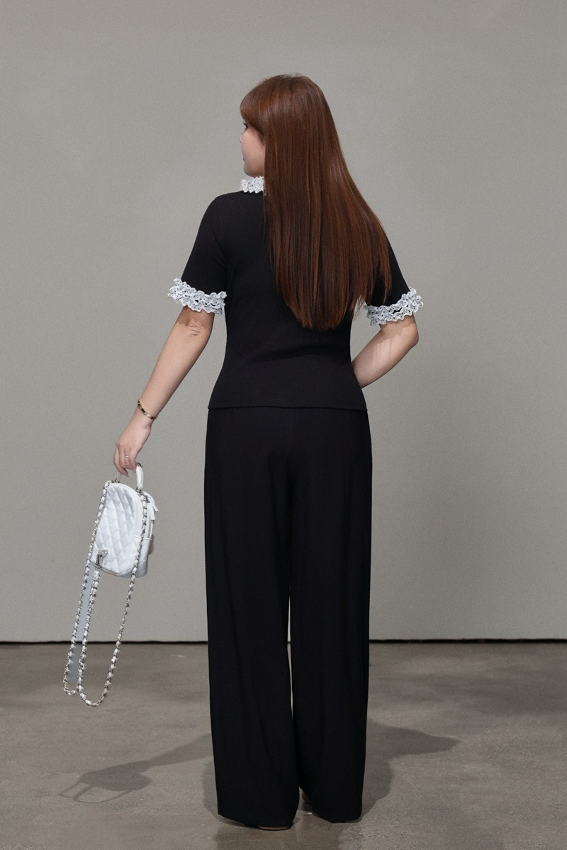 二重になった白いシフォン生地に黒のドット柄とレーストリムを組み合わせ、レトロで甘い雰囲気を演出。ブラックのボディとのコントラストがメリハリを生み、単調さを上手に打ち破ります。程よく開いたラウンドネックラインは、首元をすっきり長く見せ、顔まわりをスマートに演出。レーストリムが柔らかさと遊び心、そして若々しい魅力をさりげなく添えます。短めの袖丈は腕にほどよくフィットし、気になる二の腕を自然にカバー。袖口のドット柄が襟元のデザインと呼応し、細部へのこだわりを感じさせるプレッピーな雰囲気を演出します。前立てのボタンデザインは、一番下のボタンを外すだけでボディラインが美しく映え、こなれたおしゃれ感がアップします。すっきりキレイめに着こなしたいなら黒のスーツパンツと、韓国風のガーリースタイルにしたいなら黒のプリーツスカートと合わせるのがおすすめ。さまざまなスタイルに自在に着回せる、毎日使いたくなる万能トップスです。
