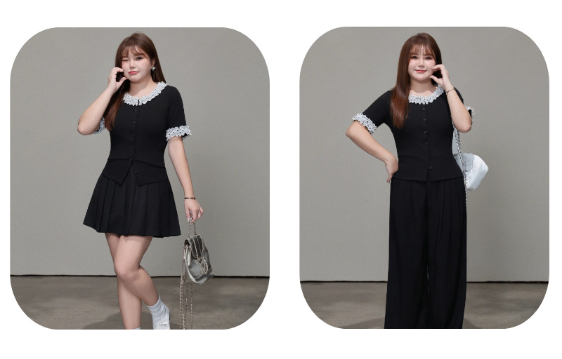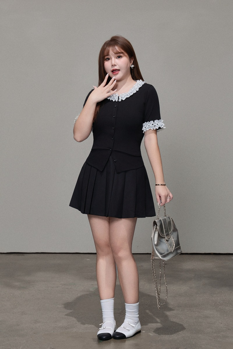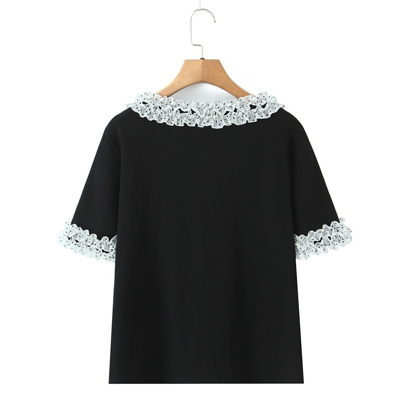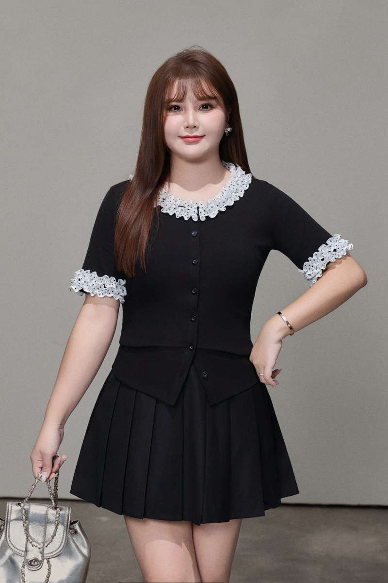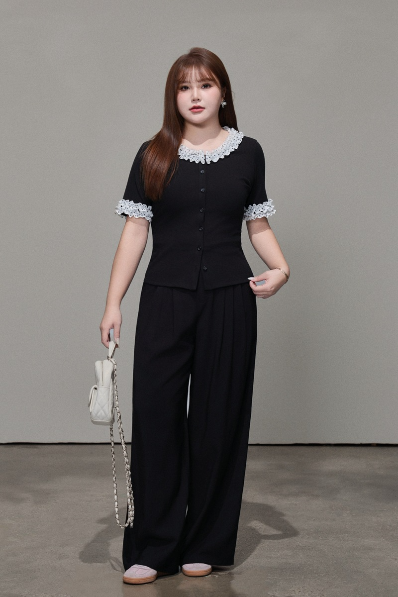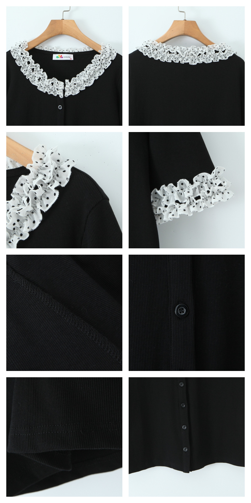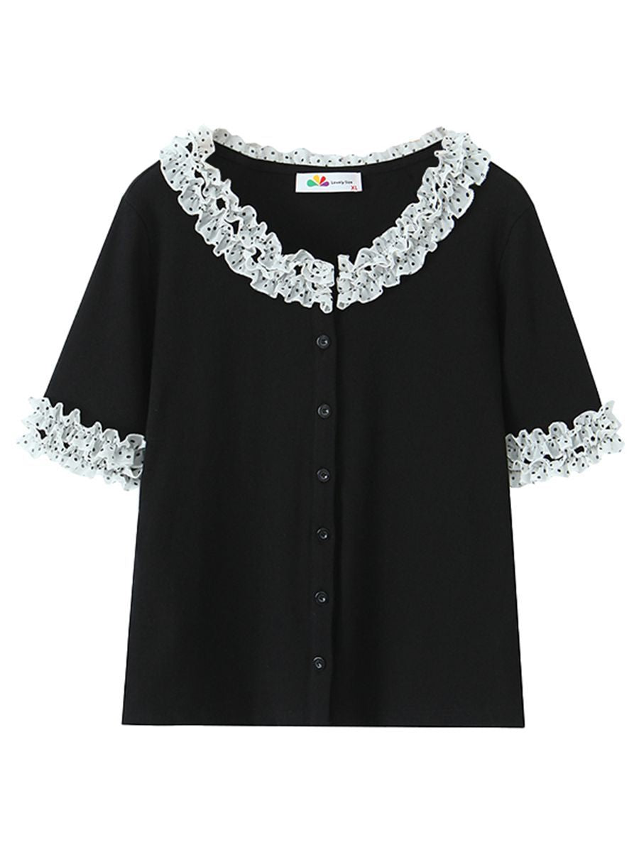 二重になった白いシフォン生地に黒のドット柄とレーストリムを組み合わせ、レトロで甘い雰囲気を演出。ブラックのボディとのコントラストがメリハリを生み、単調さを上手に打ち破ります。程よく開いたラウンドネックラインは、首元をすっきり長く見せ、顔まわりをスマートに演出。レーストリムが柔らかさと遊び心、そして若々しい魅力をさりげなく添えます。短めの袖丈は腕にほどよくフィットし、気になる二の腕を自然にカバー。袖口のドット柄が襟元のデザインと呼応し、細部へのこだわりを感じさせるプレッピーな雰囲気を演出します。前立てのボタンデザインは、一番下のボタンを外すだけでボディラインが美しく映え、こなれたおしゃれ感がアップします。すっきりキレイめに着こなしたいなら黒のスーツパンツと、韓国風のガーリースタイルにしたいなら黒のプリーツスカートと合わせるのがおすすめ。さまざまなスタイルに自在に着回せる、毎日使いたくなる万能トップスです。