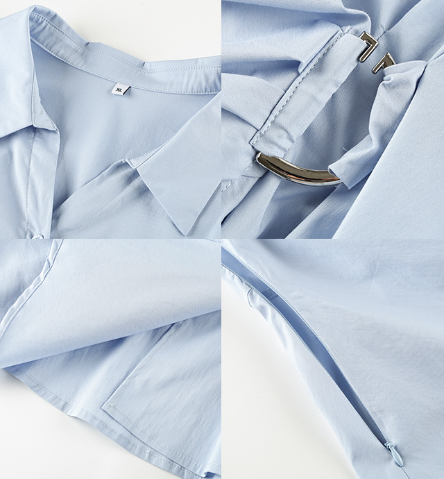 シャツカラーは小さめのVネックデザインで、首元をすっきりと長く見せ、肩と首のバランスを美しく整えます。ボタンは前開き仕様で、サイドには隠しファスナーを採用しているため、着脱もスムーズです。ウエスト部分のサイドリングバックル(固定式)がさりげなくシルエットを引き締め、驚くほどのスタイルアップ効果を発揮。体型を自然にカバーしながら、すっきりとしたスリムな着こなしを叶えます。